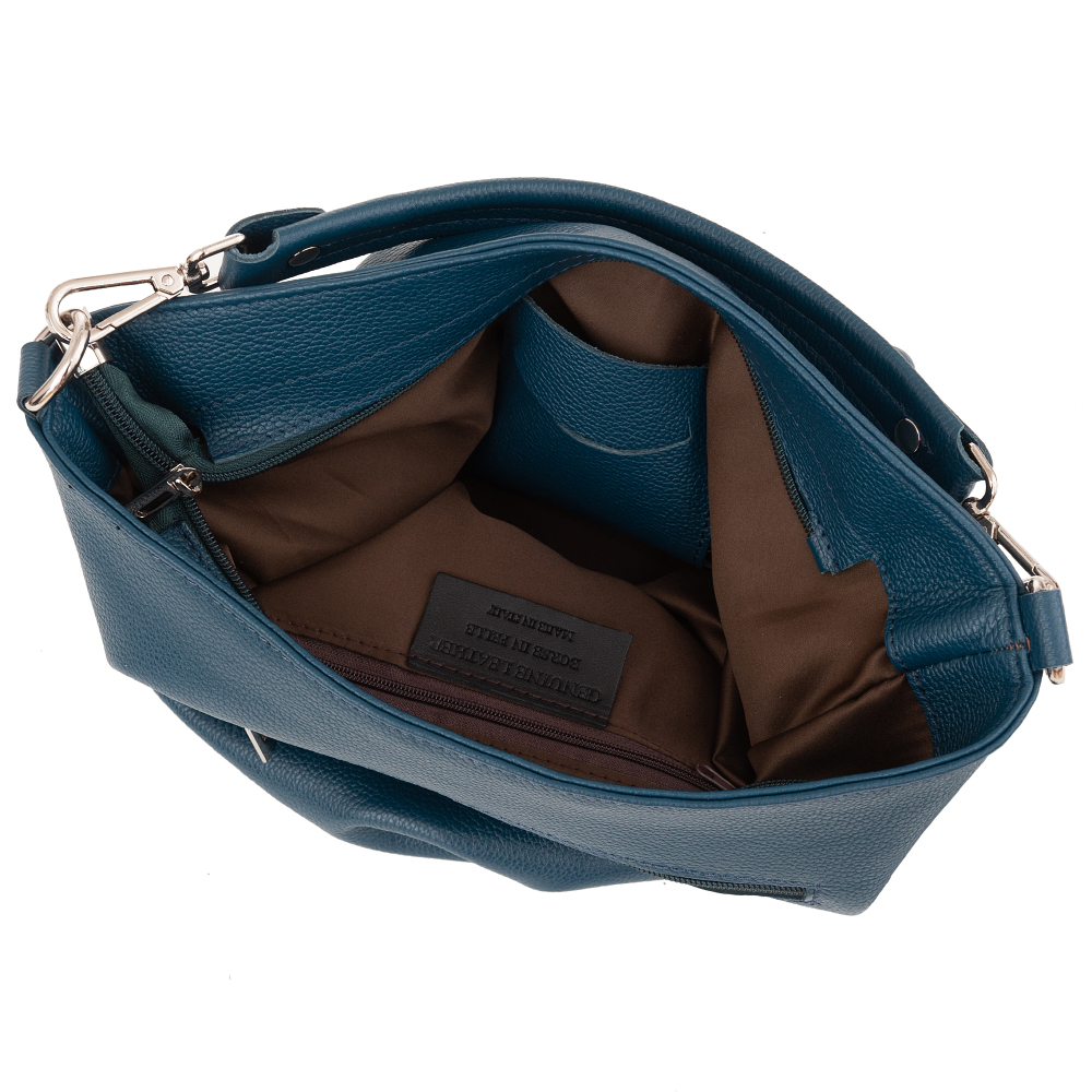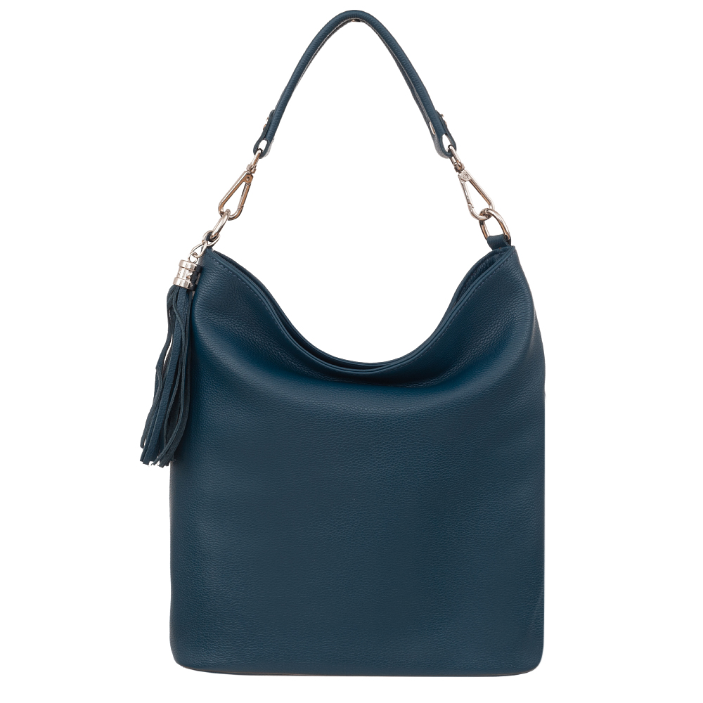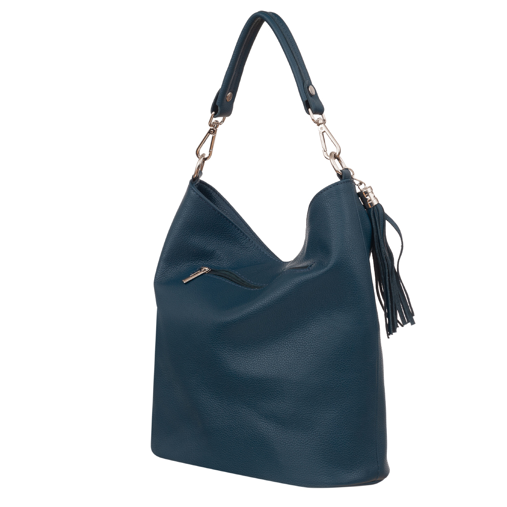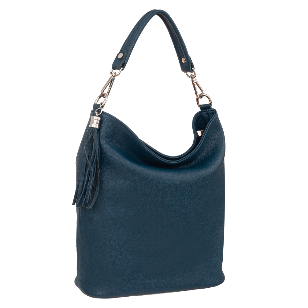 Vera Pelle - Włoska pojemna miękka skórzana torebka worek wykonana z wysokogatunkowej naturalnej skóry dolaro. Zamykana od góry na zamek na całej szerokości. Torebka jednokomorowa + wewnątrz dodatkowo jedna kieszonka na zamek, z tyłu pojemna kieszeń na zamek. Wnętrze wykończone trwałą, materiałową podszewką. Miękkie ucho umożliwia wygodne noszenie na ramieniu. W komplecie długi, regulowany pasek . Elementy wykończenia w kolorze srebrnym. Dno lekko usztywnione. Modnym elementem jest pęk frędzli.
