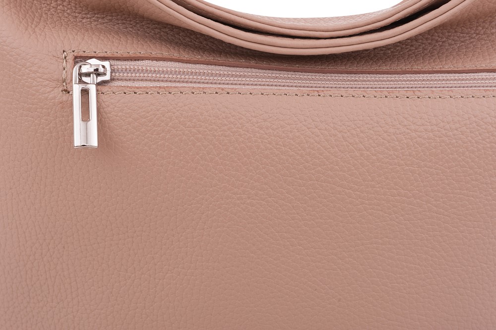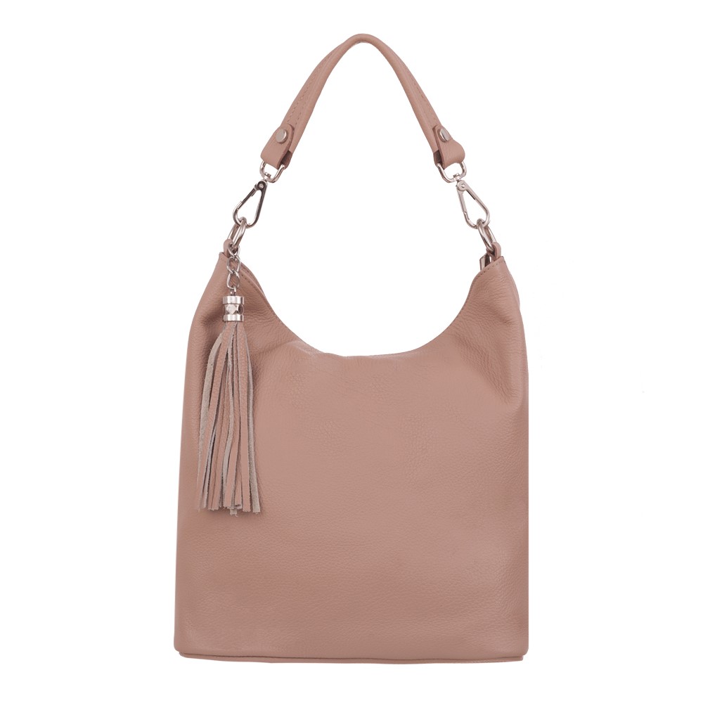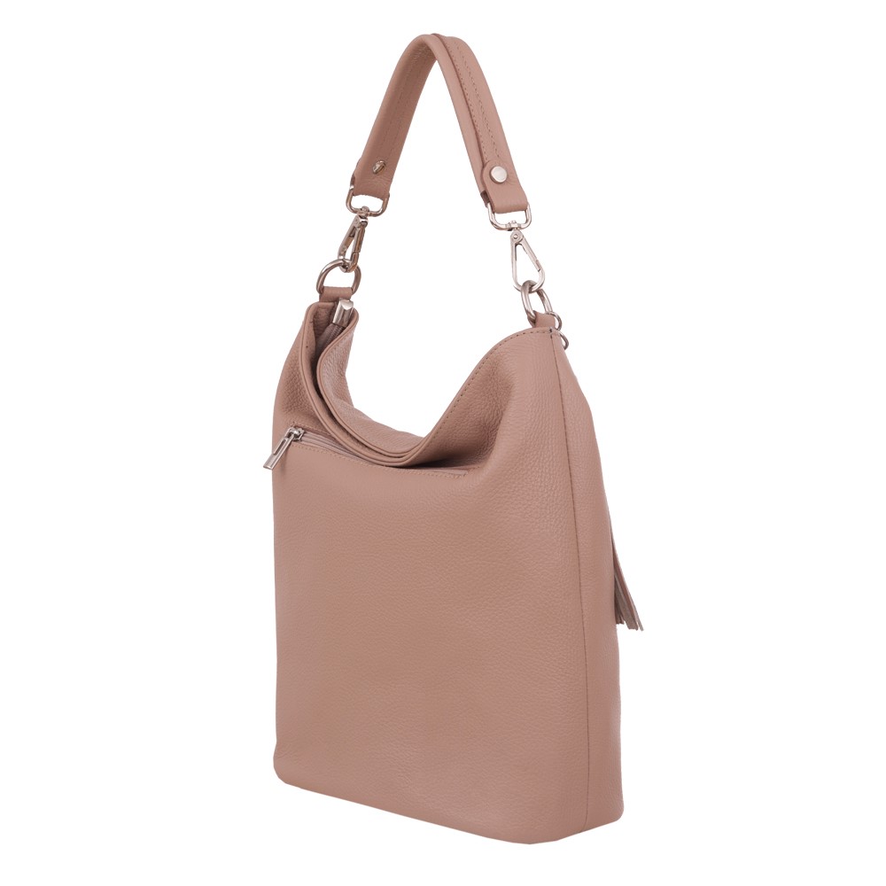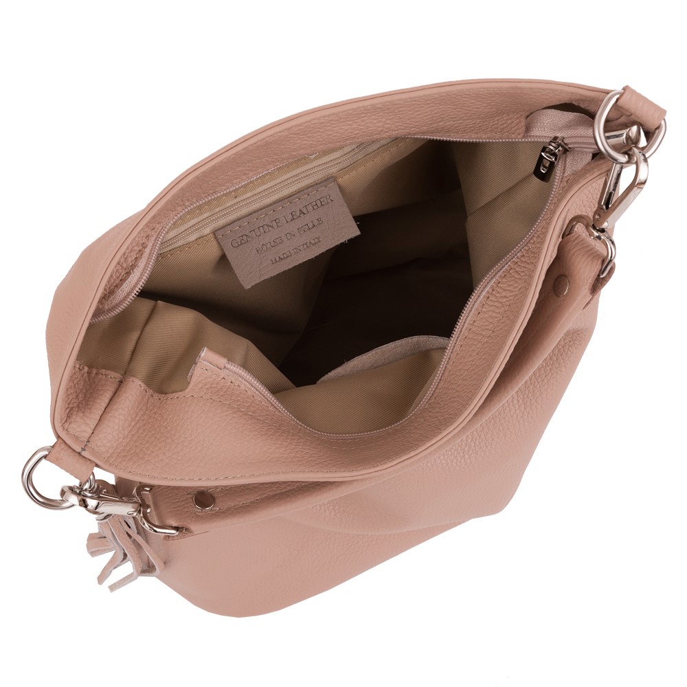 Vera Pelle - Włoska pojemna miękka skórzana torebka worek wykonana z wysokogatunkowej naturalnej skóry licowej. Zamykana od góry na zamek na całej szerokości. Torebka jednokomorowa + wewnątrz dodatkowo jedna kieszonka na zamek, z tyłu pojemna kieszeń na zamek. Wnętrze wykończone trwałą, materiałową podszewką. Miękkie ucho umożliwia wygodne noszenie na ramieniu. W komplecie długi, regulowany pasek . Elementy wykończenia w kolorze srebrnym. Dno lekko usztywnione. Modnym elementem jest pęk frędzli.