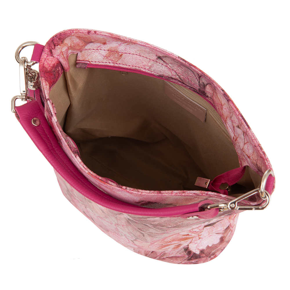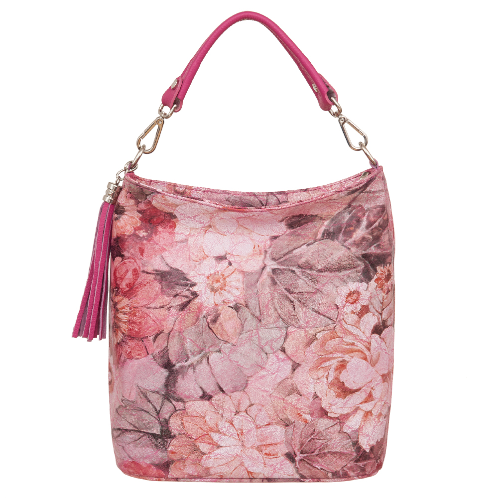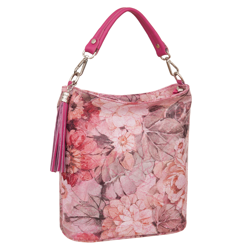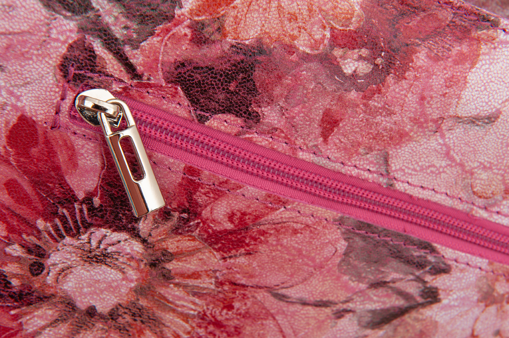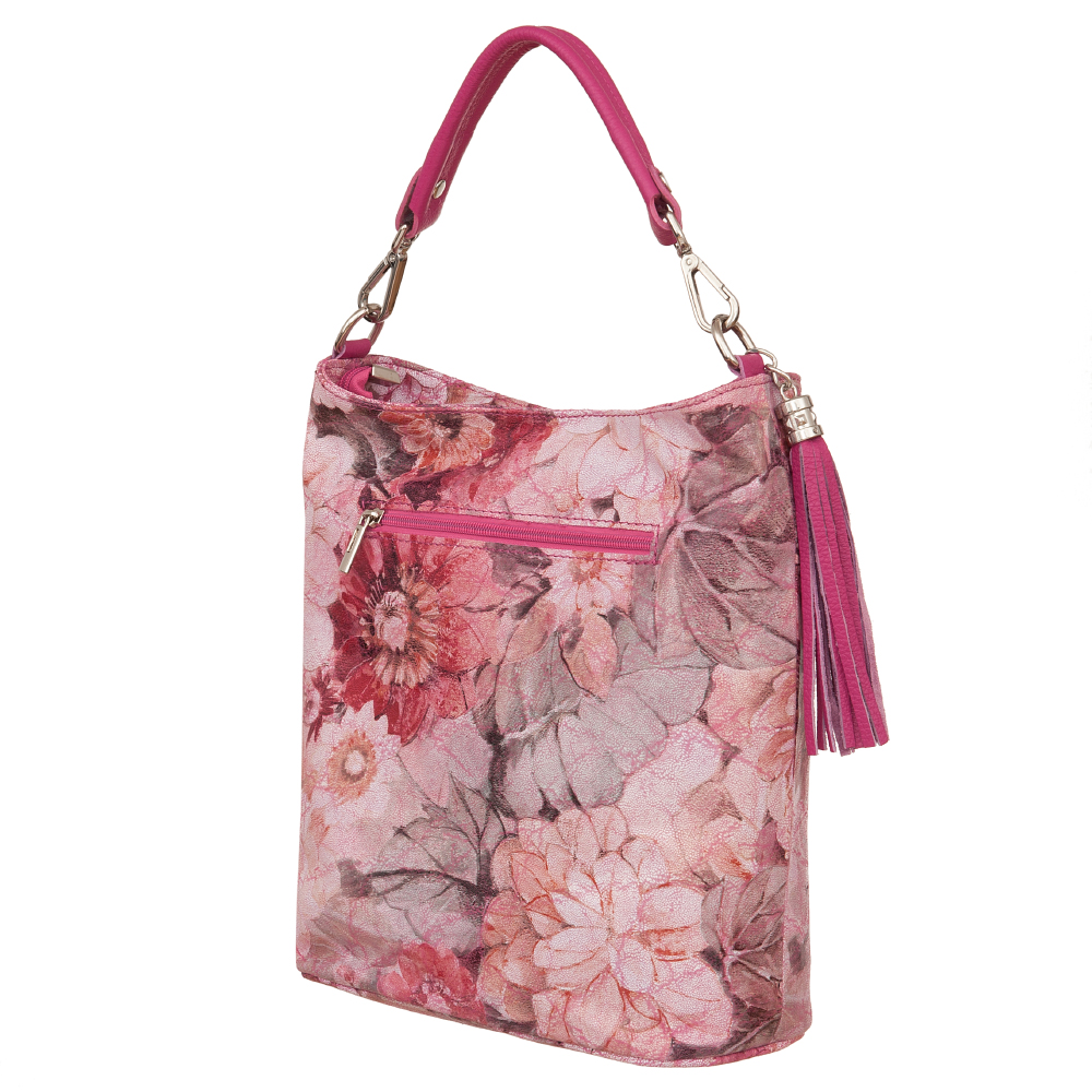 Vera Pelle - Włoska pojemna miękka skórzana torebka z motywem kwiatów wykonana z wysokogatunkowej naturalnej gładkiej skóry. Zamykana od góry na zamek na całej szerokości. Torebka jednokomorowa + wewnątrz dodatkowo jedna kieszonka na zamek, z tyłu pojemna kieszeń na zamek. Wnętrze wykończone trwałą, materiałową podszewką. Miękkie ucho umożliwia wygodne noszenie na ramieniu. W komplecie długi, regulowany pasek . Elementy wykończenia w kolorze srebrnym. Dno lekko usztywnione. Modnym elementem jest pęk frędzli.
