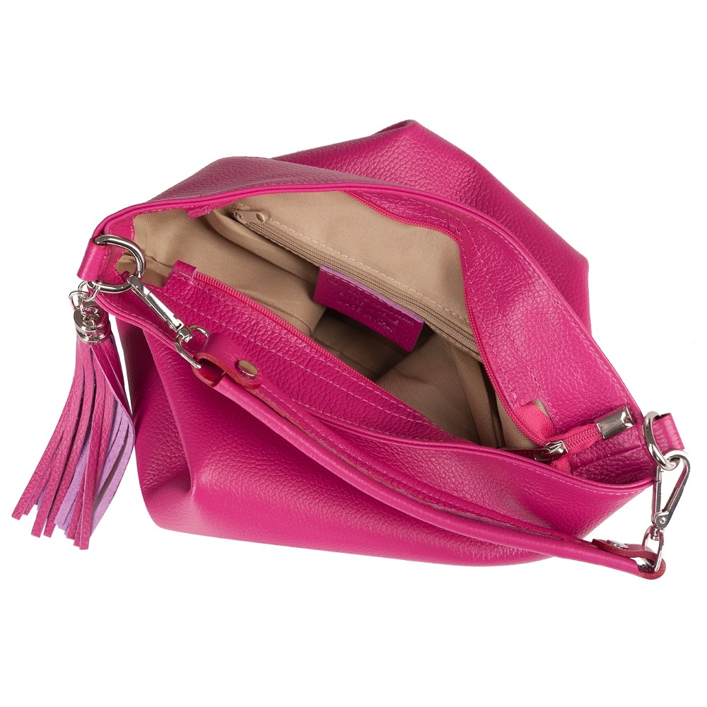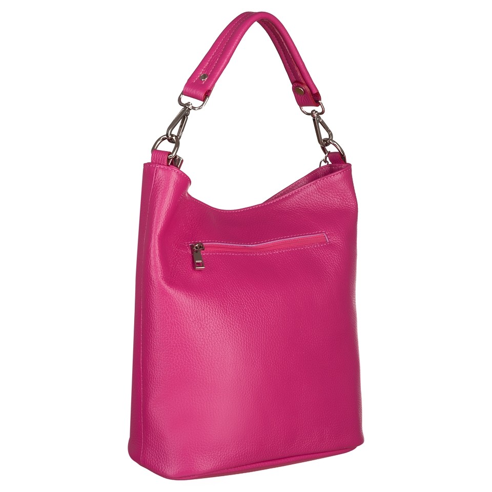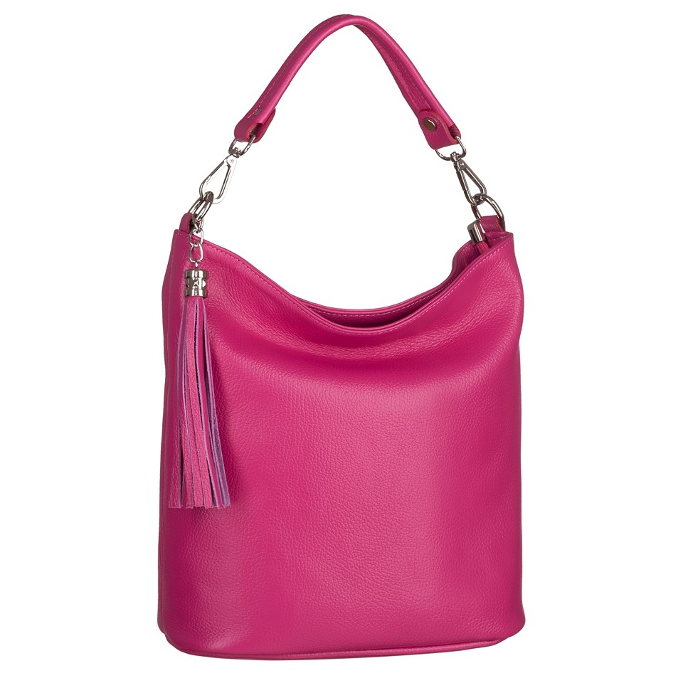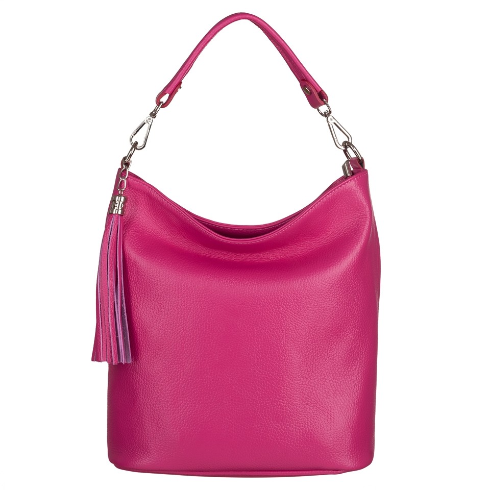 Vera Pelle - Włoska pojemna miękka skórzana torebka worek wykonana z wysokogatunkowej naturalnej skóry licowej. Zamykana od góry na zamek na całej szerokości. Torebka jednokomorowa + wewnątrz dodatkowo jedna kieszonka na zamek, z tyłu pojemna kieszeń na zamek. Wnętrze wykończone trwałą, materiałową podszewką. Miękkie ucho umożliwia wygodne noszenie na ramieniu. W komplecie długi, regulowany pasek . Elementy wykończenia w kolorze srebrnym. Dno lekko usztywnione. Modnym elementem jest pęk frędzli.