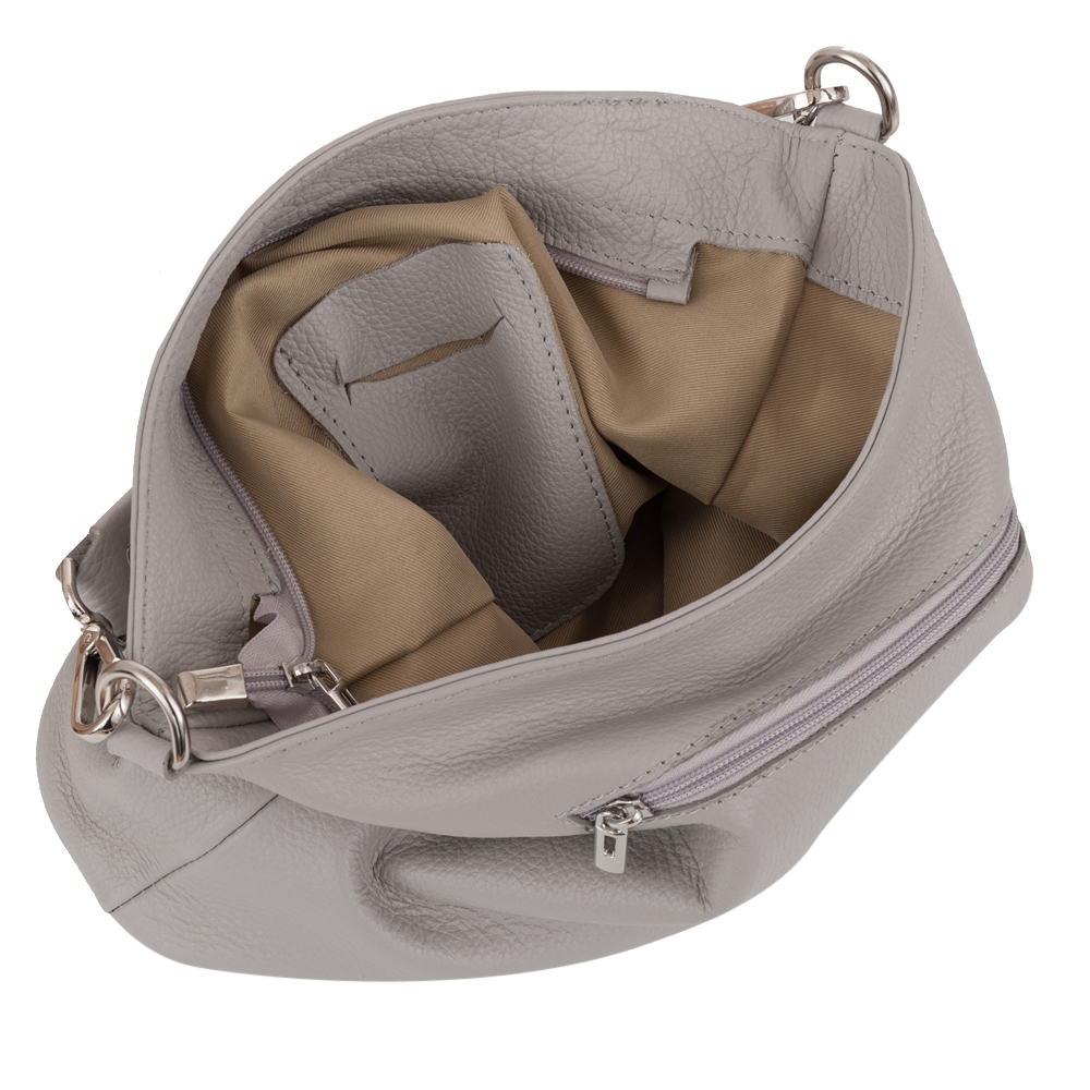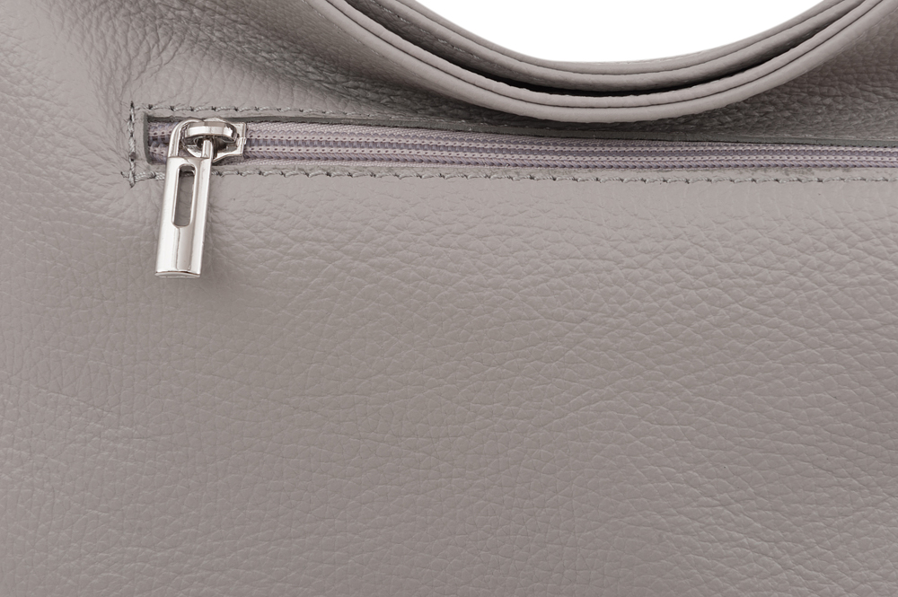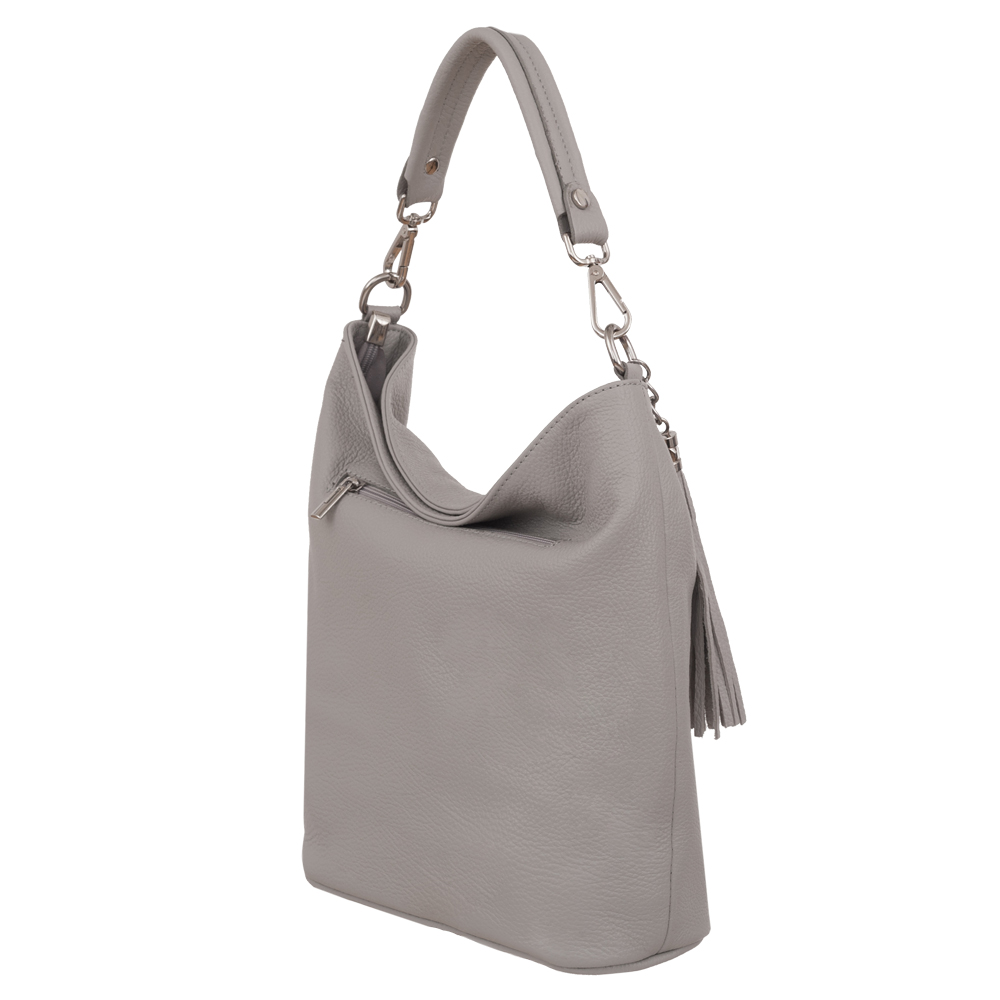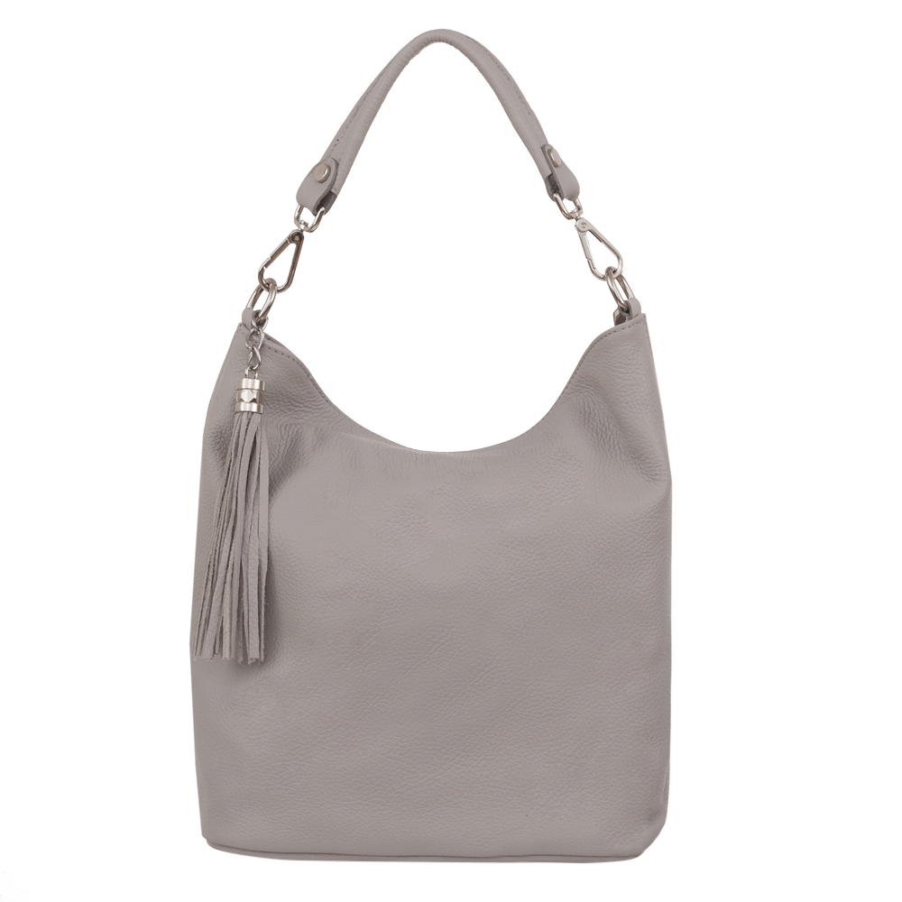 Vera Pelle - Włoska pojemna miękka skórzana torebka worek wykonana z wysokogatunkowej naturalnej skóry licowej. Zamykana od góry na zamek na całej szerokości. Torebka jednokomorowa + wewnątrz dodatkowo jedna kieszonka na zamek, z tyłu pojemna kieszeń na zamek. Wnętrze wykończone trwałą, materiałową podszewką. Miękkie ucho umożliwia wygodne noszenie na ramieniu. W komplecie długi, regulowany pasek . Elementy wykończenia w kolorze srebrnym. Dno lekko usztywnione. Modnym elementem jest pęk frędzli.