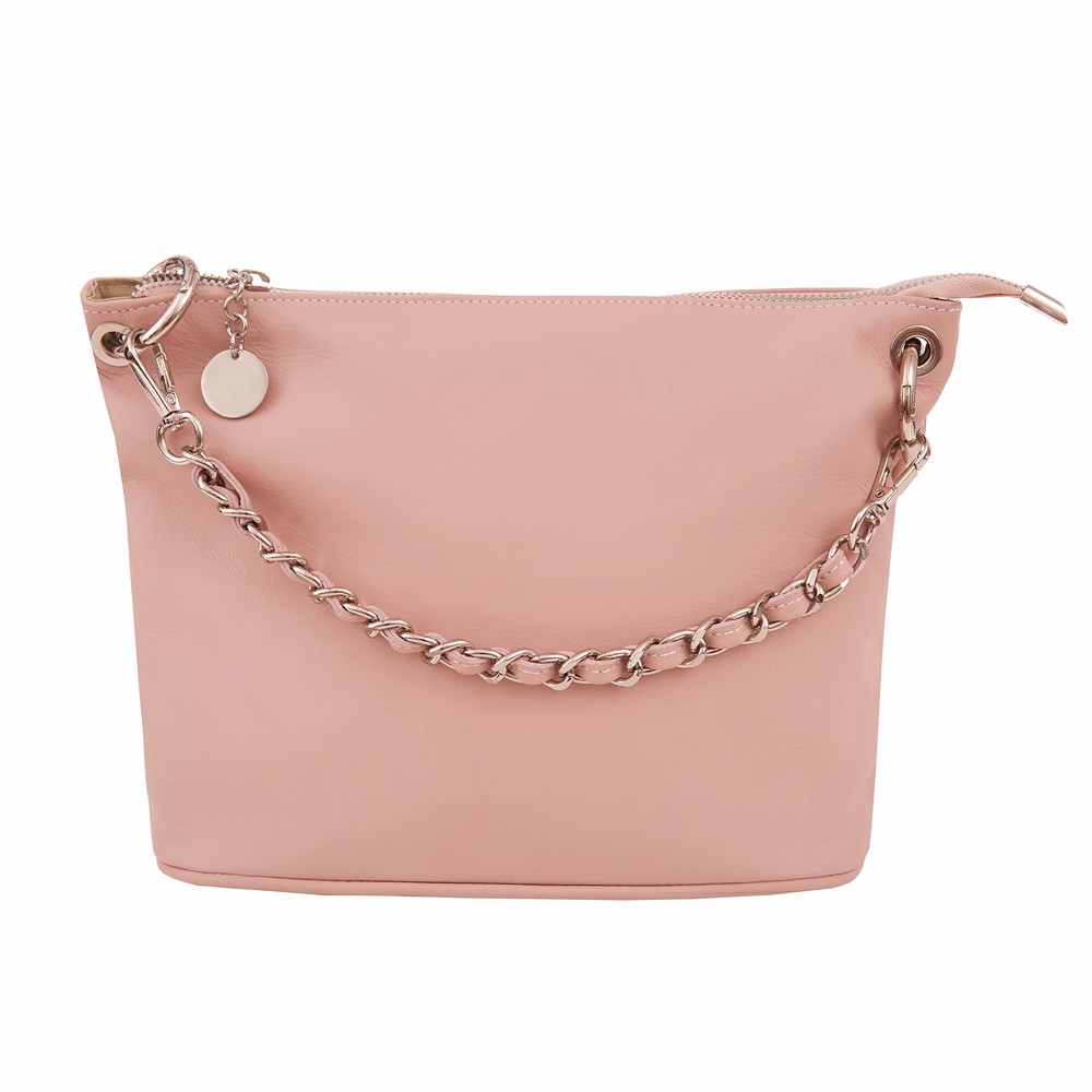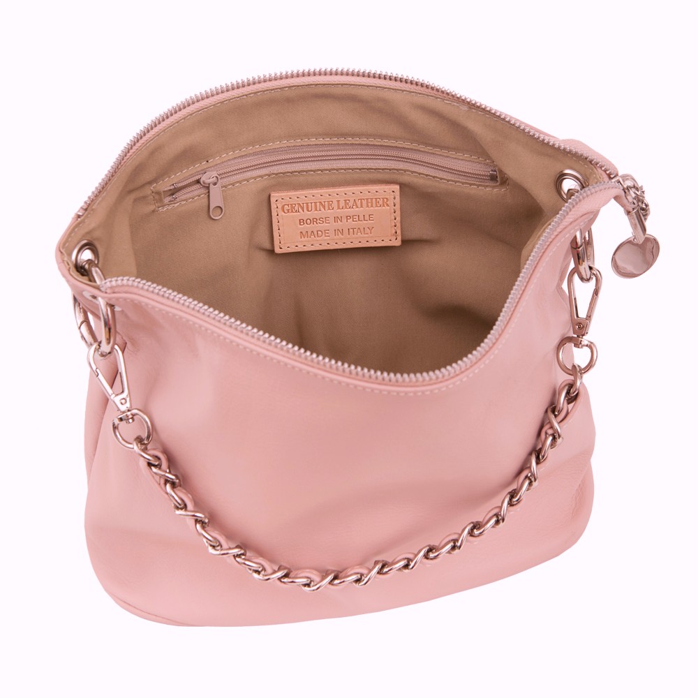Włoska pojemna miękka skórzana torebka / listonoszka wykonana z naturalnej gładkiej skóry cielęcej. Zamykana od góry na zamek na całej szerokości torebki. Torebka jednokomorowa, wewnątrz jedna kieszonka na zamek + dwie dodatkowe kieszonki. Wnętrze wykończone trwałą, ciemną podszewką. Długi, regulowany pasek umożliwia wygodne noszenie na ramieniu lub przez ramię. Dodatkowa pojemna kieszeń z tyłu na zamek. Elementy wykończenia w kolorze srebrnym. Możliwość noszenia w ręce na łańcuszku ( łańcuszek jest również całkowicie wypinany ). Długi skórzany pasek w komplecie.