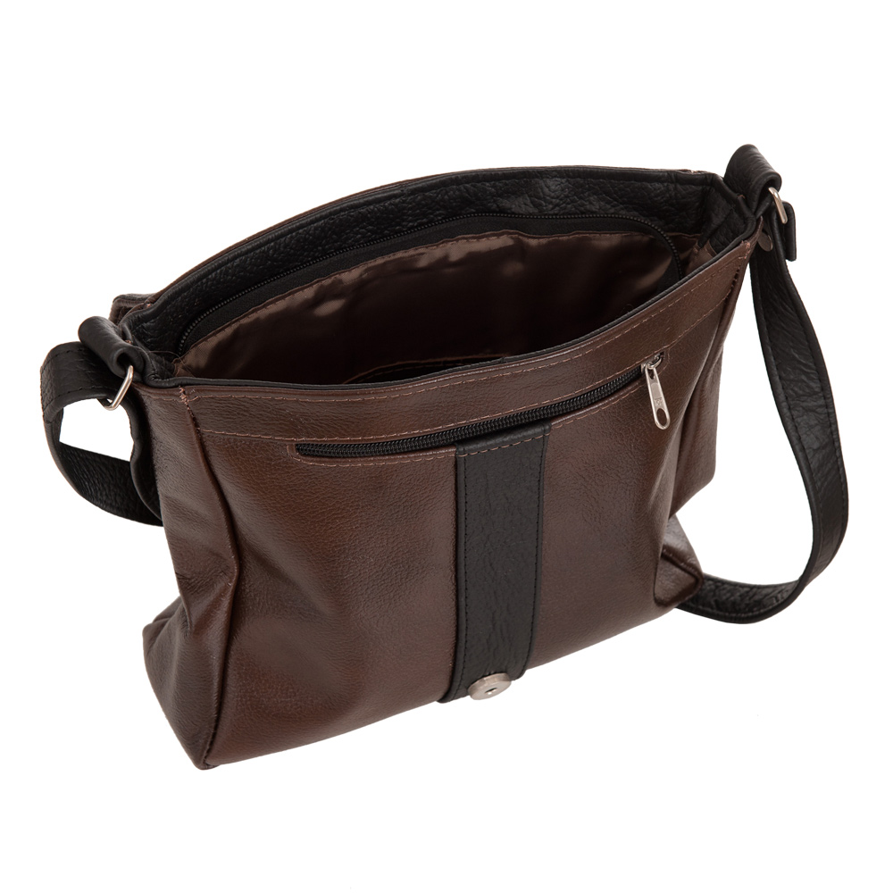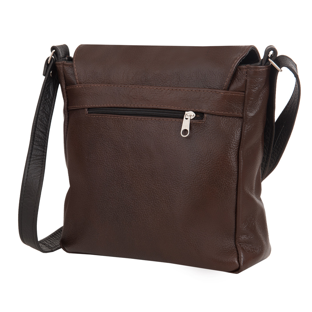 Polska skórzana listonoszka wykonana w 100% ze skóry naturalnej. Zamykana z góry na klapę z magnesem + suwak. Torebka jednokomorowa. Wewnątrz jedna kieszonka na zamek oraz jedna na telefon. Dodatkowo z tyłu kieszonka na suwak + z przodu pod klapką. Wnętrze wykończone trwałą podszewką. Pasek w torebce regulowany na długość. Miękki szeroki pasek umożliwia wygodne noszenie torebki.