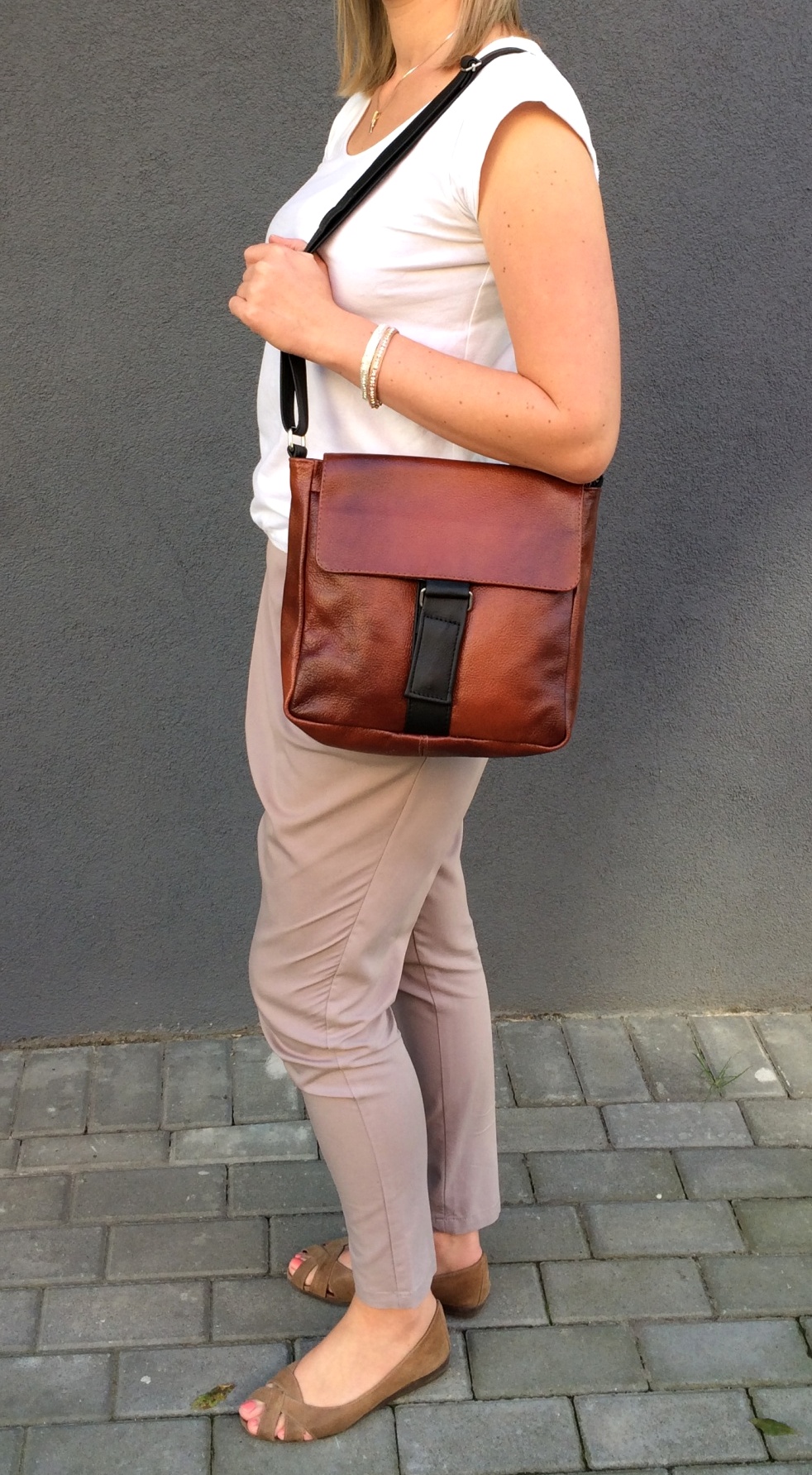 Polska skórzana listonoszka wykonana w 100% ze skóry naturalnej. Zamykana z góry na klapę z magnesem + suwak. Torebka jednokomorowa. Wewnątrz jedna kieszonka na zamek oraz jedna na telefon. Dodatkowo z tyłu kieszonka na suwak + z przodu pod klapką. Wnętrze wykończone trwałą podszewką. Pasek w torebce regulowany na długość. Miękki szeroki pasek umożliwia wygodne noszenie torebki.
