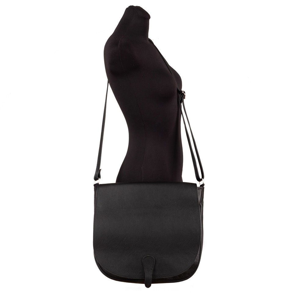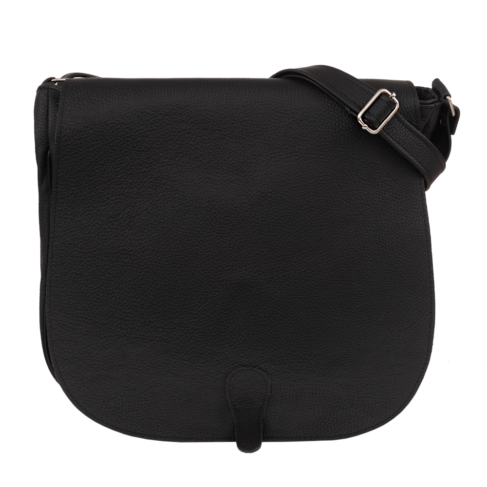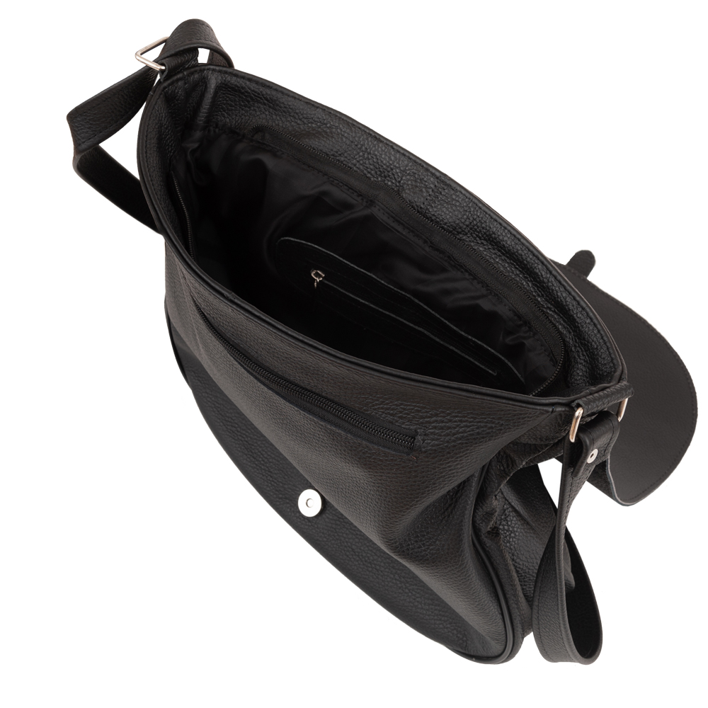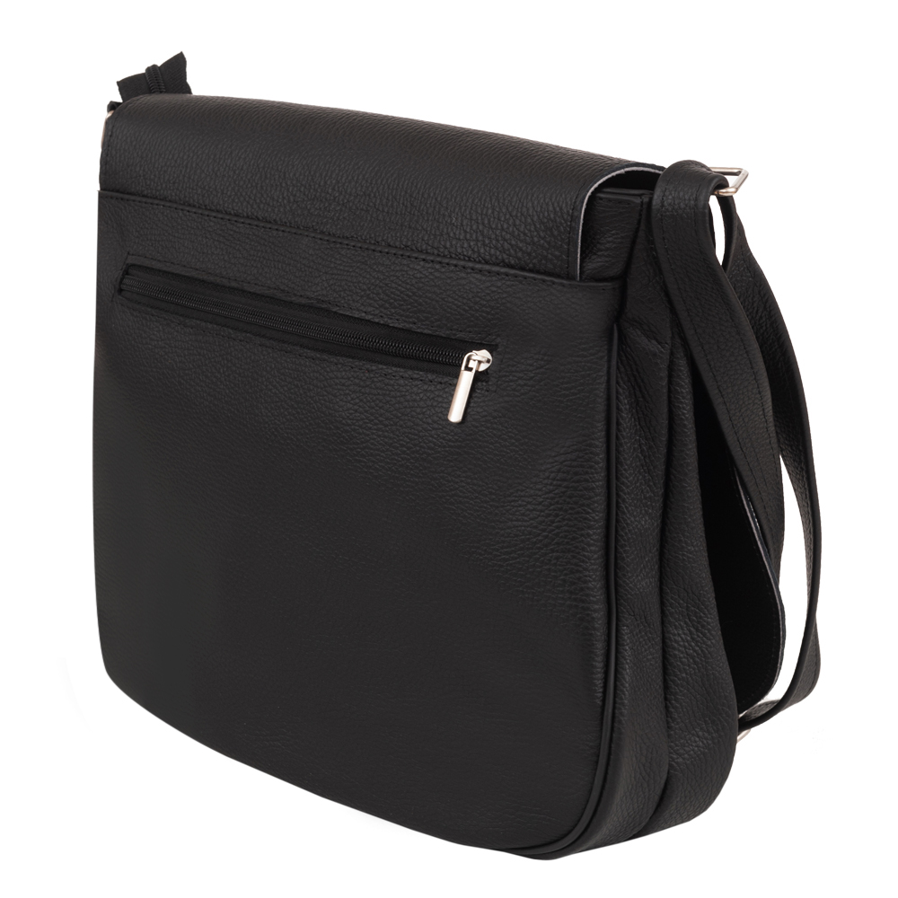 Modna skórzana A4 torebka listonoszka wykonana w całości z miękkiej skóry naturalnej. Skóra mocna i odporna na zarysowania. Zamykana z góry na klapę z magnesem + zamek na całej szerokości. Torebka jednokomorowa, wewnątrz jedna kieszonka na zamek oraz jedna na telefon. Dodatkowo z tyłu kieszonka na suwak. Pod klapą kieszeń na zamek. Wnętrze wykończone trwałą, materiałową czarną podszewką. Szeroki pasek (3cm) regulowany na długość. Elementy metalowe w kolorze srebrnym. Torbę wygodnie można nosić na ramieniu lub przez ramię jako listonoszkę.