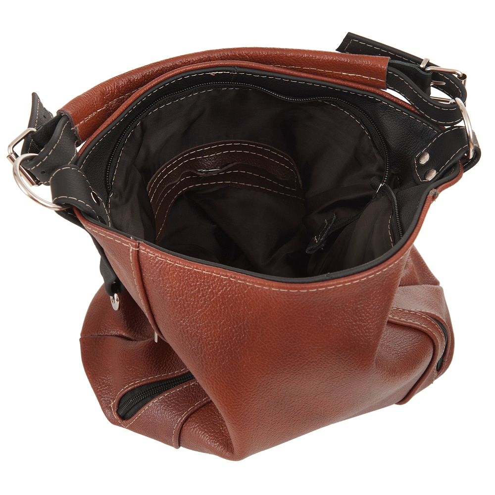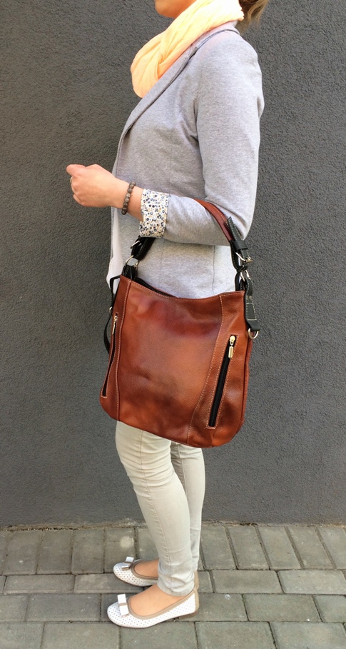 Skórzana torebka / worek wykonana w całości ze skóry naturalnej licowej. Skóra bardzo delikatnie cieniowana. Zamykana z góry na suwak. Torebka jednokomorowa. Wewnątrz jedna kieszonka na zamek oraz jedna na telefon.