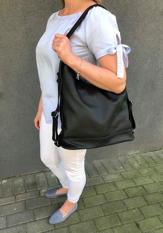 Skórzana polska modna A4 torebka 3w1 wykonana z miękkiej naturalnej skóry najwyższej jakości. Mocna i wytrzymała skóra. Torebka jednokomorowa zamykana na zamek na całej szerokości, dodatkowo w środku kieszonka na telefon + kieszeń na zamek na bocznej wewnętrznej ściance. Wnętrze wykończone mocną, materiałową podszewką. Z tyłu torebki kieszeń na zamek. Metalowe elementy wykończenia w kolorze srebrnym. Torebkę po ściągnięciu pasków można nosić jako plecak lub worek na ramieniu.