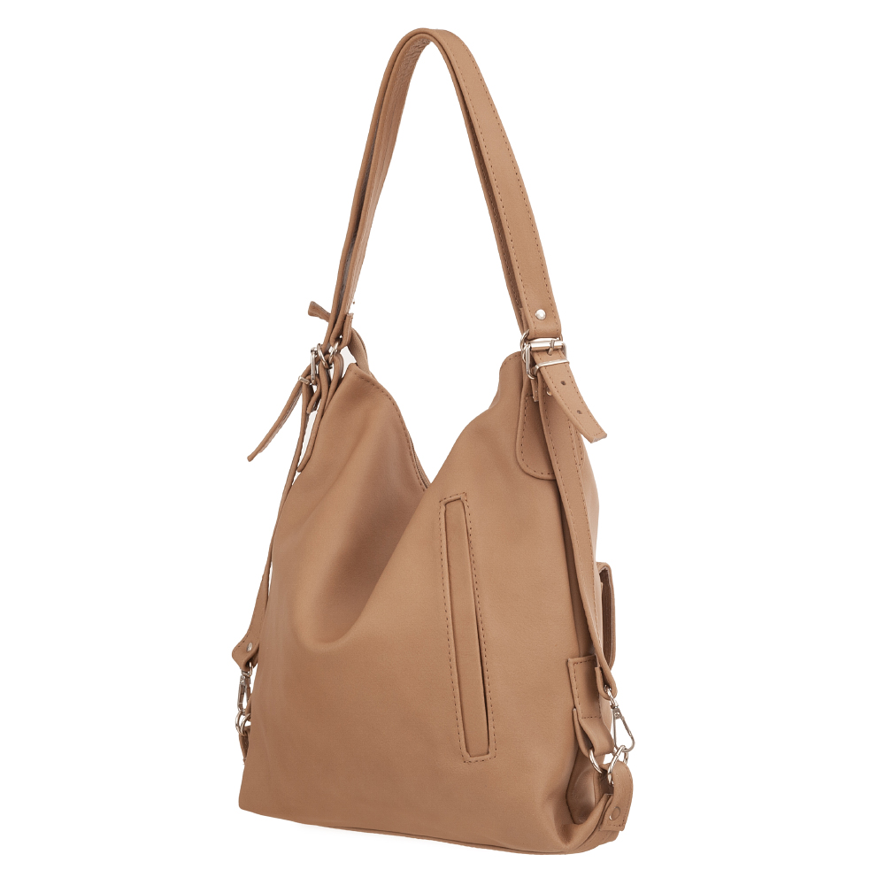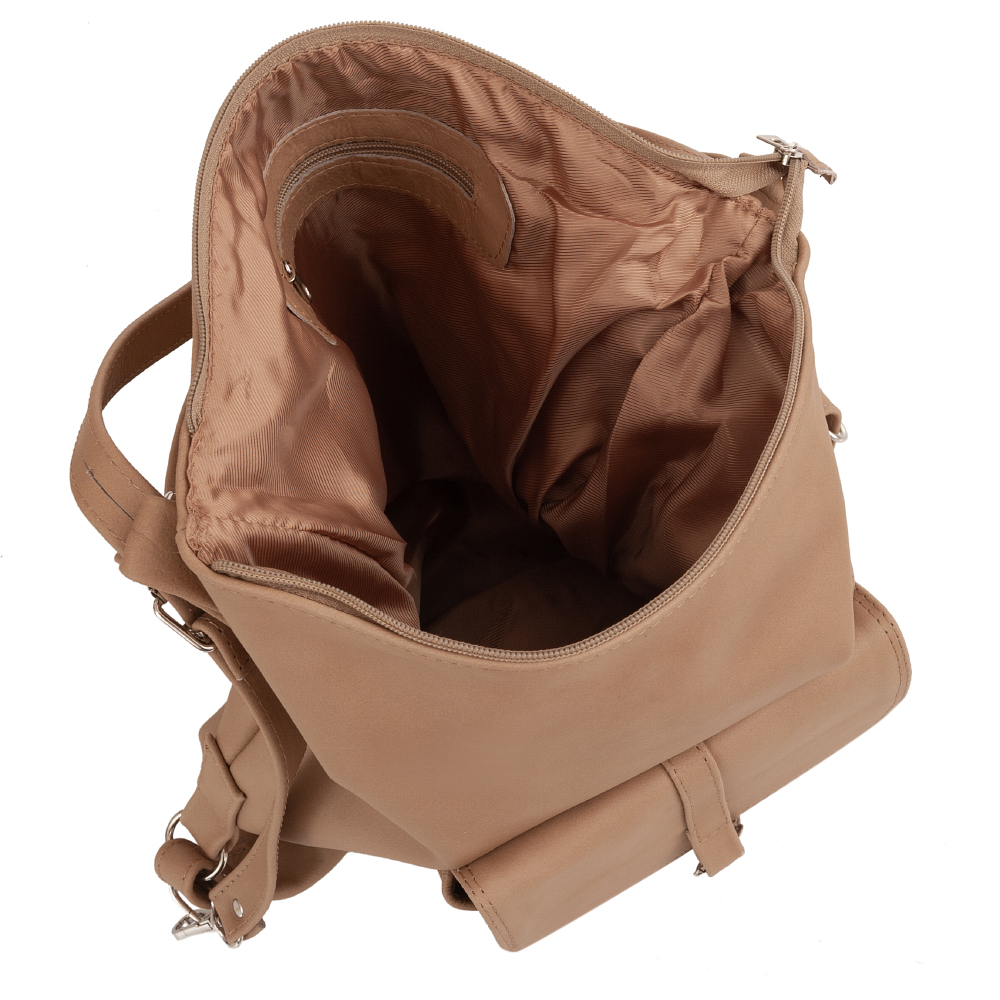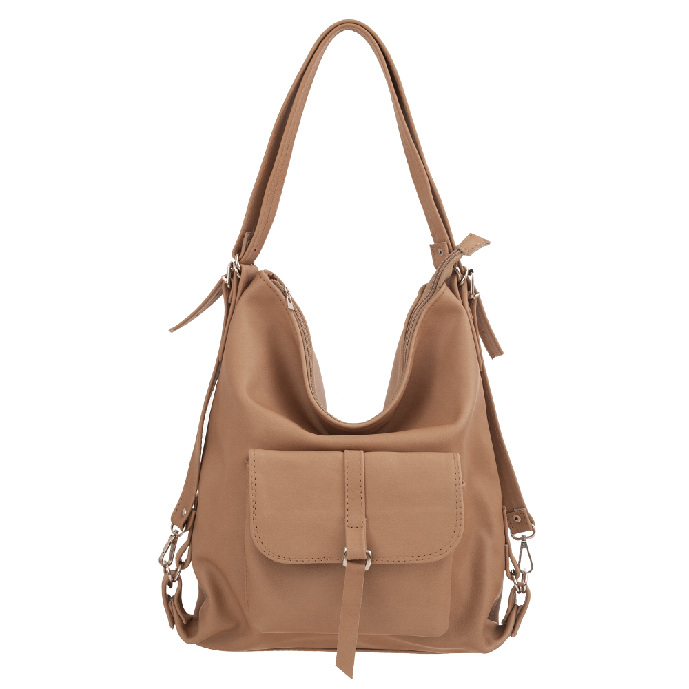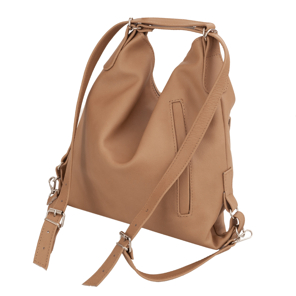 Polska skórzana torebka / plecak wykonana w 100% ze skóry naturalnej. Zamykana z góry na suwak. Torebka jednokomorowa. Wewnątrz jedna kieszonka na zamek oraz jedna na telefon. Z przodu kieszonka pod klapą na magnes. Dodatkowo z tyłu pionowa kieszonka na suwak. Wnętrze wykończone trwałą podszewką. Po zaciągnięciu pasków torebkę można nosić jako plecak. Duża możliwość regulacji długości pasków dzięki przepinanym karabińczykom od 40 cm do nawet 77 cm.