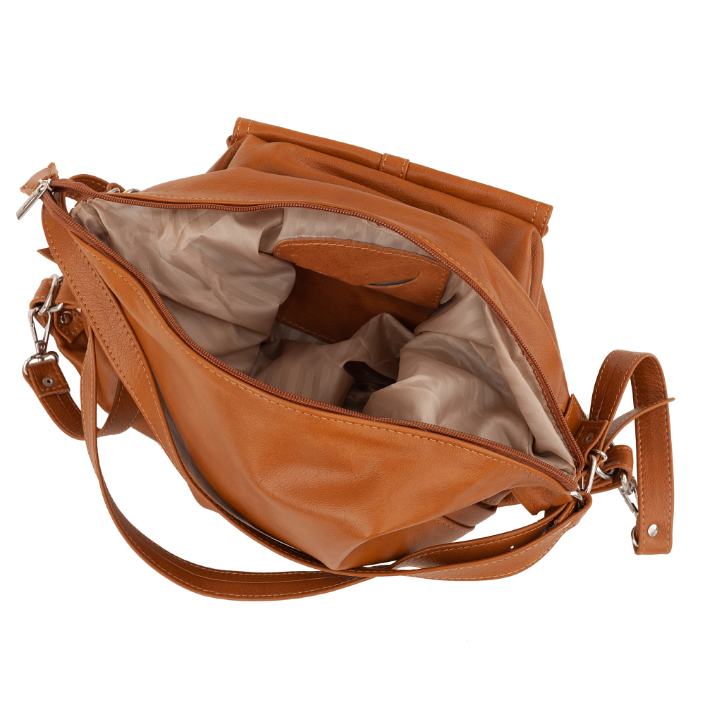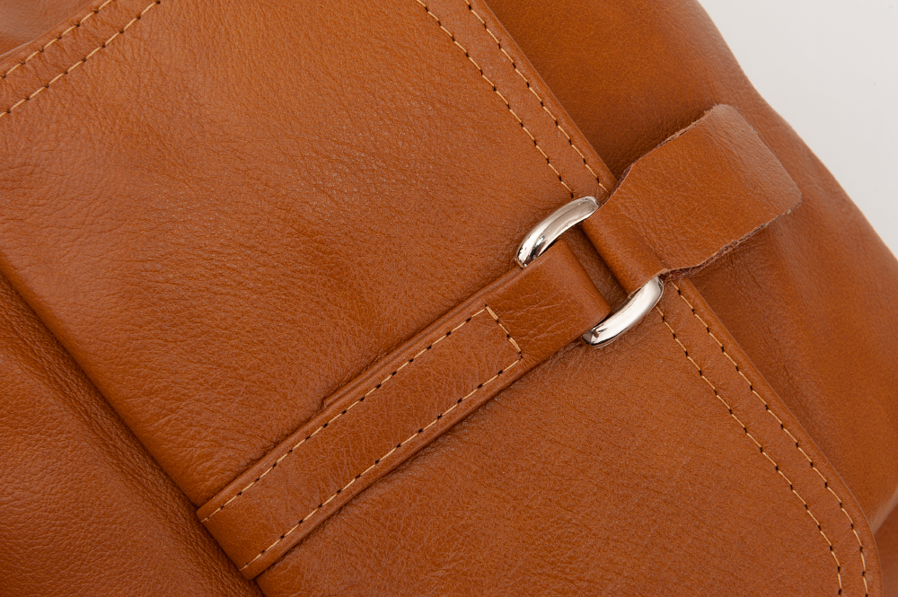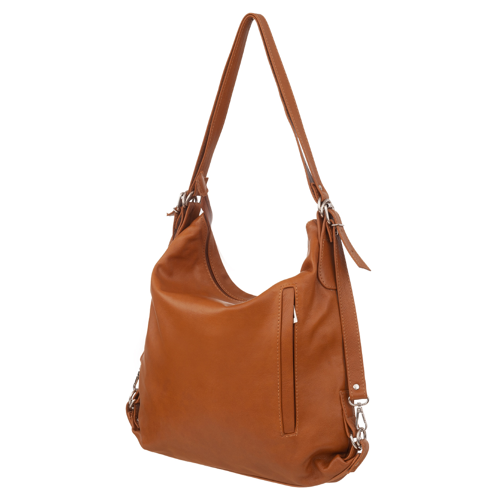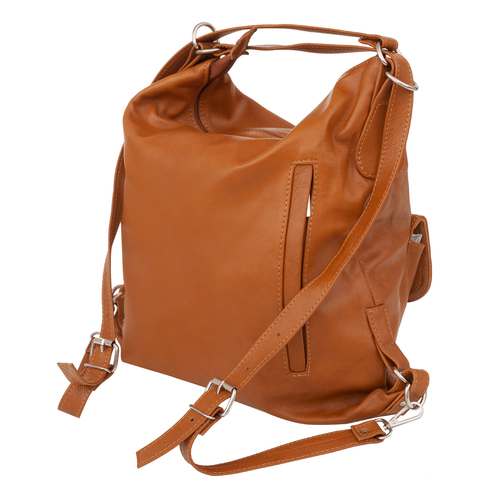 Polska skórzana torebka / plecak wykonana w 100% ze skóry naturalnej. Zamykana z góry na suwak. Torebka jednokomorowa. Wewnątrz jedna kieszonka na zamek oraz jedna na telefon. Z przodu kieszonka pod klapą na magnes. Dodatkowo z tyłu pionowa kieszonka na suwak. Wnętrze wykończone trwałą podszewką. Po zaciągnięciu pasków torebkę można nosić jako plecak. Duża możliwość regulacji długości pasków dzięki przepinanym karabińczykom od 40 cm do nawet 77 cm.