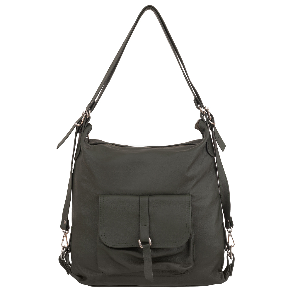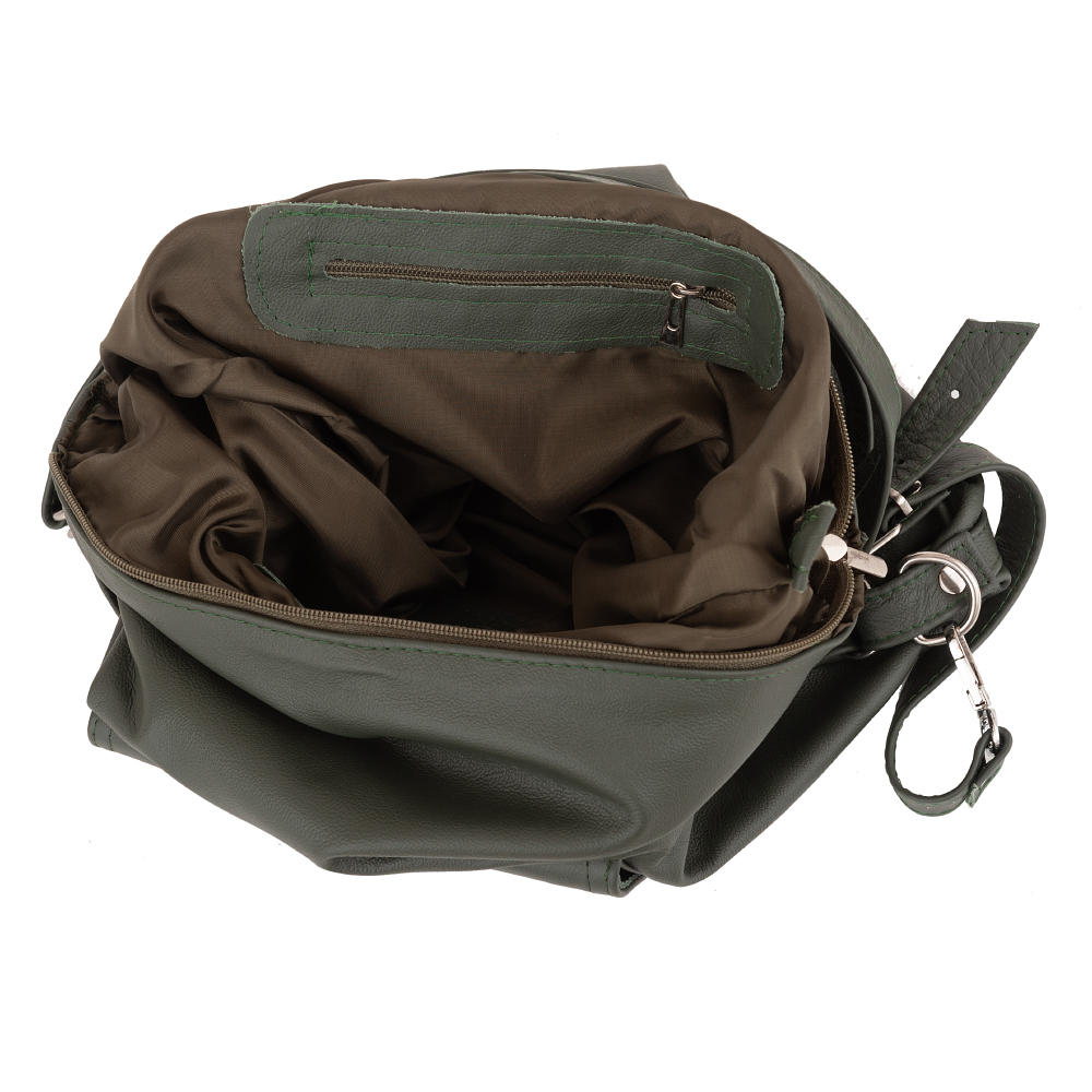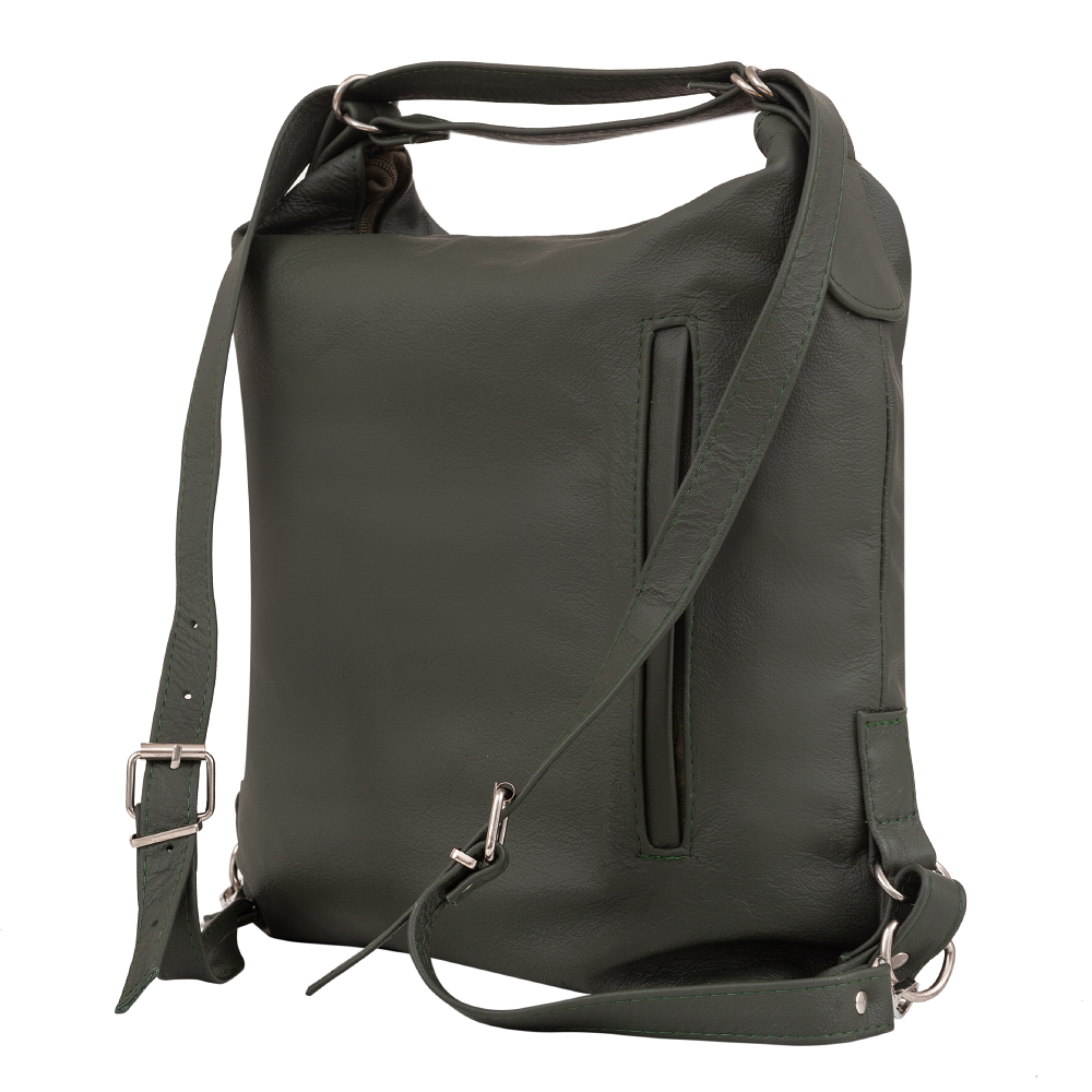 Polska skórzana torebka / plecak wykonana w 100% ze skóry naturalnej. Zamykana z góry na suwak. Torebka jednokomorowa. Wewnątrz jedna kieszonka na zamek oraz jedna na telefon. Z przodu kieszonka pod klapą na magnes. Dodatkowo z tyłu pionowa kieszonka na suwak. Wnętrze wykończone trwałą podszewką. Po zaciągnięciu pasków torebkę można nosić jako plecak. Duża możliwość regulacji długości pasków dzięki przepinanym karabińczykom od 40 cm do nawet 77 cm.