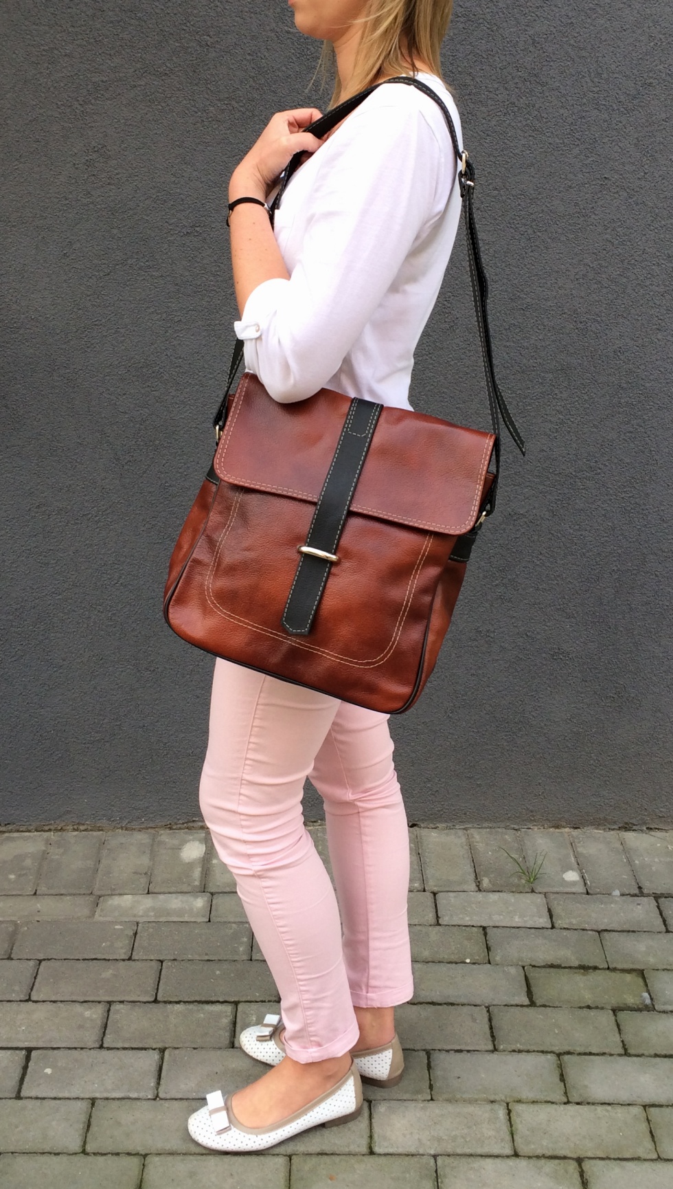 Polska skórzana A4 torebka / listonoszka wykonana w 100% ze skóry naturalnej licowej. Zamykana z góry na klapę z magnesem + suwak. Torebka jednokomorowa przedzielona dużą przegrodą na suwak na całej szerokości. Wewnątrz jedna kieszonka na zamek oraz jedna na telefon. Dodatkowo z tyłu kieszonka na suwak. Wnętrze wykończone trwałą, ciemną podszewką. Pasek w torebce regulowany na długość. Miękki, szeroki pasek umożliwia wygodne noszenie torebki. Dno usztywnione.