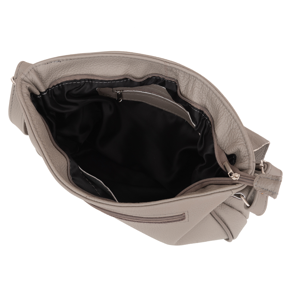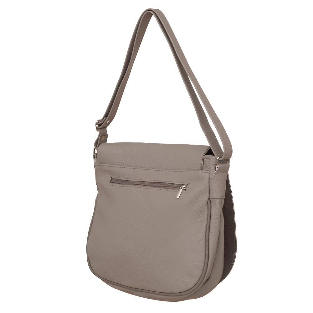 Modna skórzana A4 torebka listonoszka wykonana w całości z miękkiej skóry naturalnej. Skóra mocna i odporna na zarysowania. Zamykana z góry na klapę z magnesem + zamek na całej szerokości. Torebka jednokomorowa, wewnątrz jedna kieszonka na zamek oraz jedna na telefon. Dodatkowo z tyłu kieszonka na suwak. Pod klapą kieszeń na zamek. Wnętrze wykończone trwałą, materiałową czarną podszewką. Szeroki pasek (3cm) regulowany na długość. Elementy metalowe w kolorze srebrnym. Torbę wygodnie można nosić na ramieniu lub przez ramię jako listonoszkę.