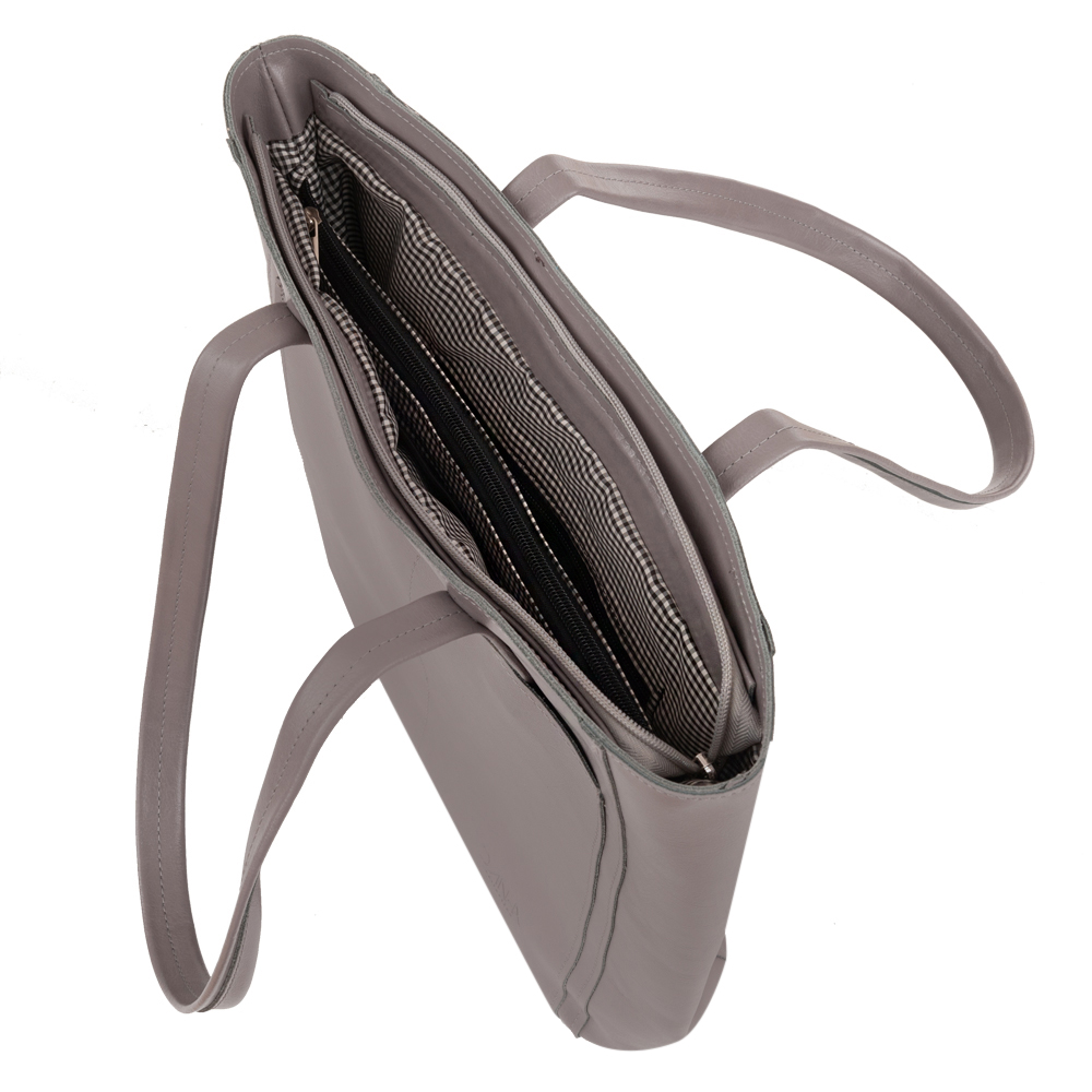 Ekskluzywna polska modna, klasyczna A4 skórzana torebka wykonana z naturalnej skóry licowej najwyższej jakości. Torebka zamykana na zamek na całej szerokości. Torebka dwukomorowa przedzielona na środku dużą kieszenią na zamek, dodatkowo w środku kieszonka na telefon + kieszeń na zamek na bocznej wewnętrznej ściance. Wnętrze wykończone mocną, materiałową podszewką (odcień podszewki może się różnić). Z przodu torebki kieszeń na magnes + kieszonka z tyłu na zamek. Elementy wykończenia w kolorze srebrnym.