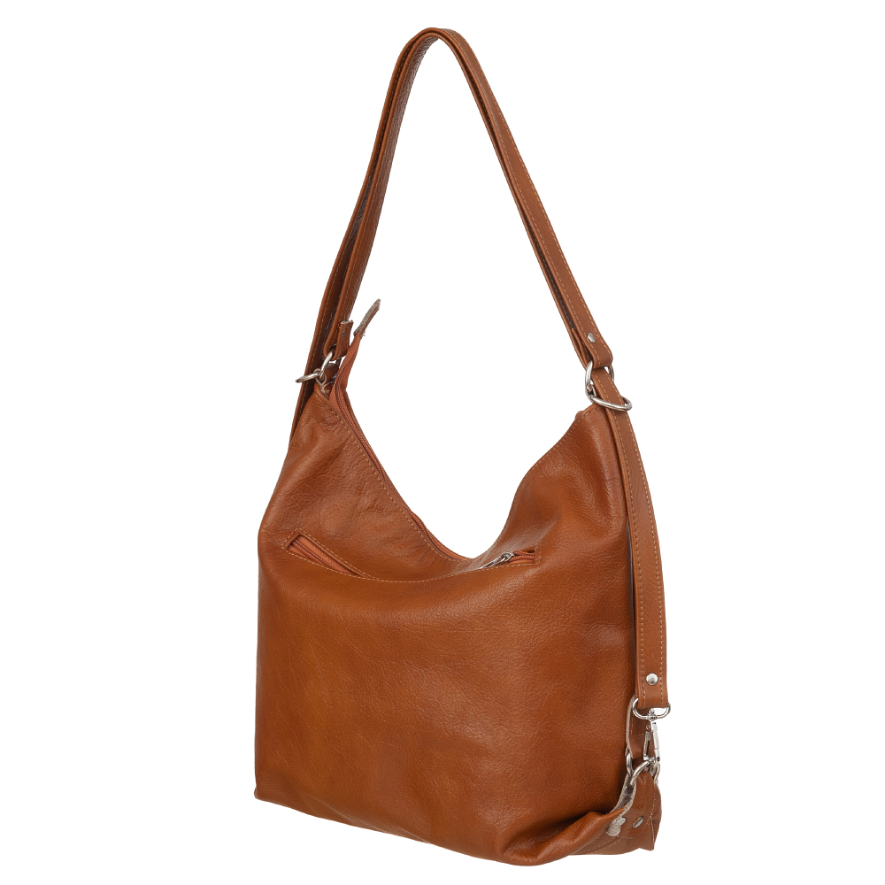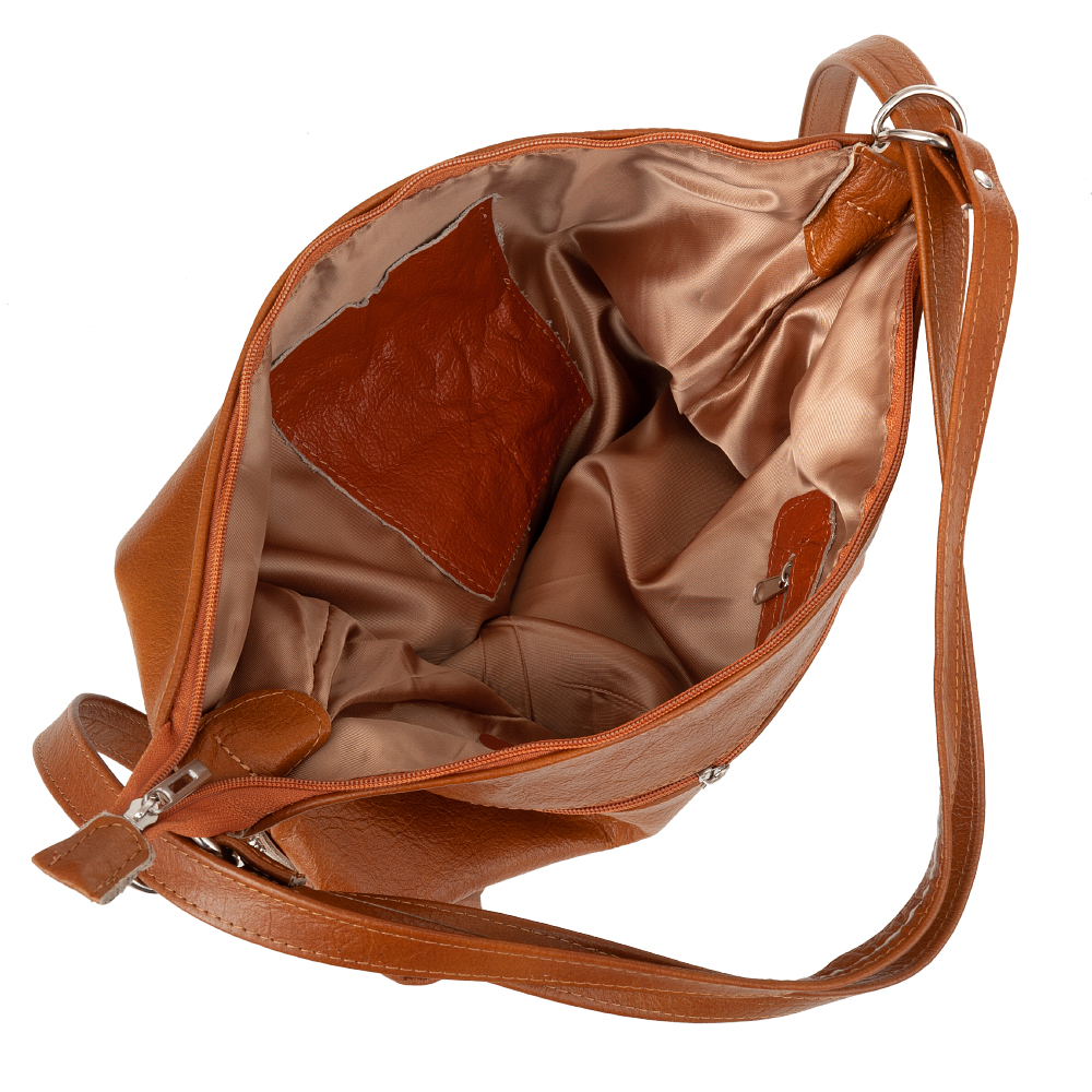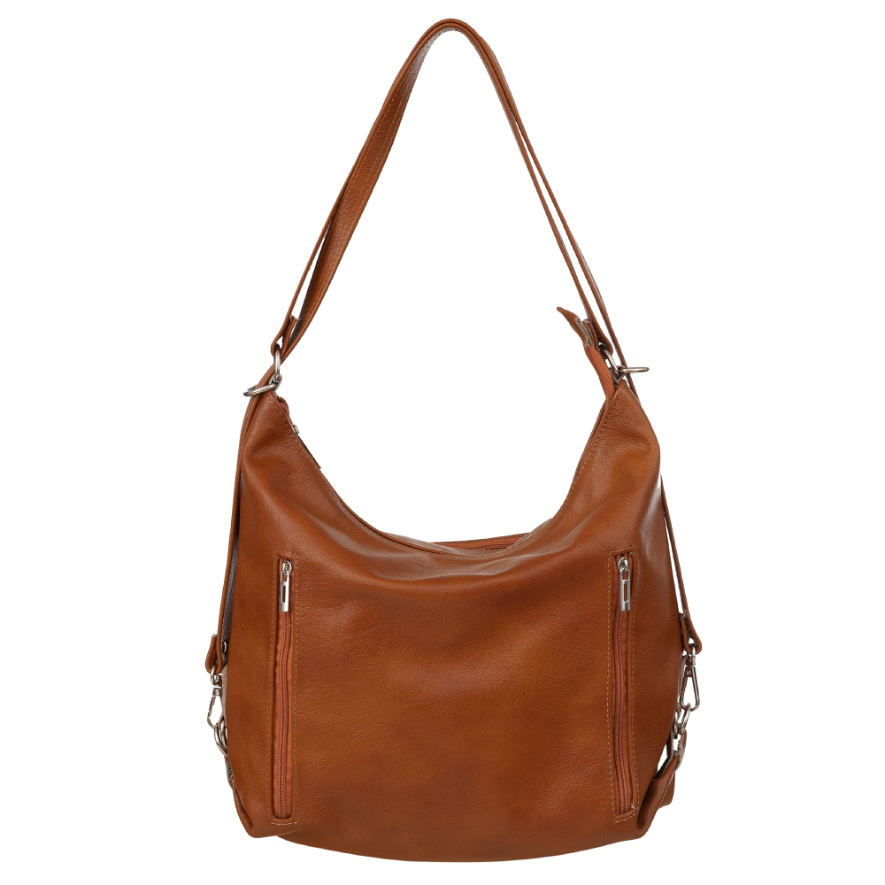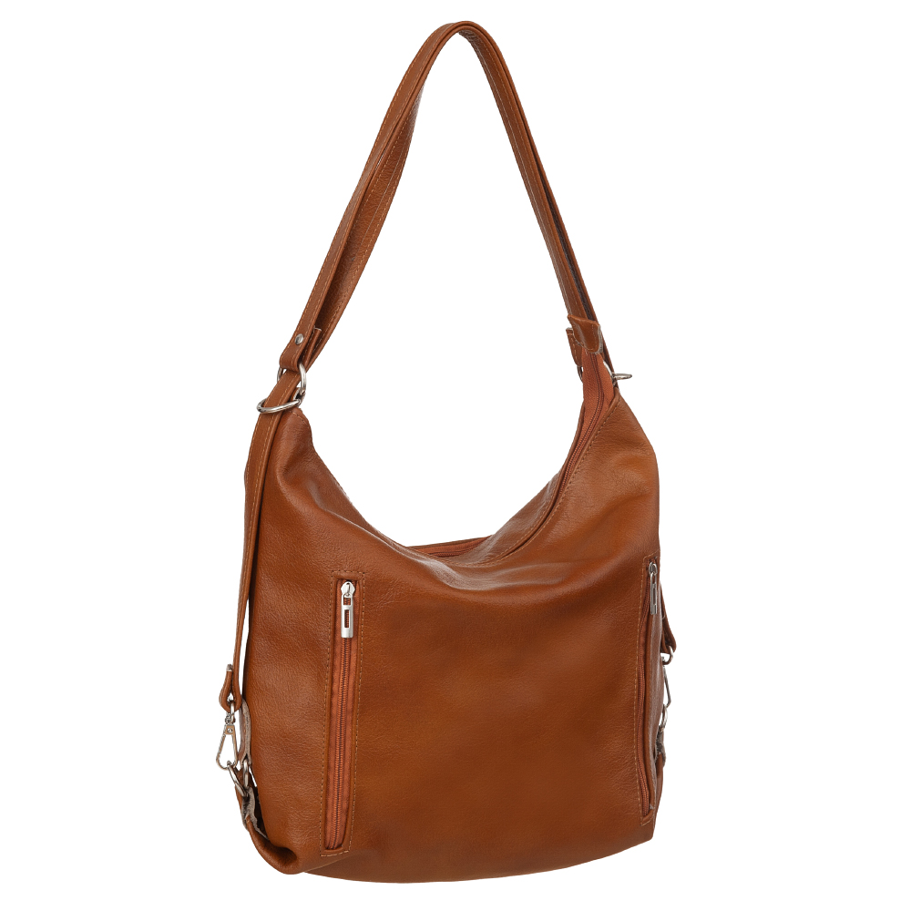 Polska skórzana torebka plecak 2w1 wykonana w 100% z miękkiej skóry naturalnej. Zamykana z góry na zamek. Torebka jednokomorowa. Wewnątrz jedna kieszonka na zamek oraz jedna na telefon. Z przodu 2 x pionowa kieszonka na zamek + dodatkowo z tyłu kieszonka. Wnętrze wykończone trwałą materiałową mocną podszewką. Po zaciągnięciu pasków torebkę można nosić jako plecak. Duża możliwość regulacji długości pasków dzięki przepinanym karabińczykom od 50 cm do nawet 108 cm.