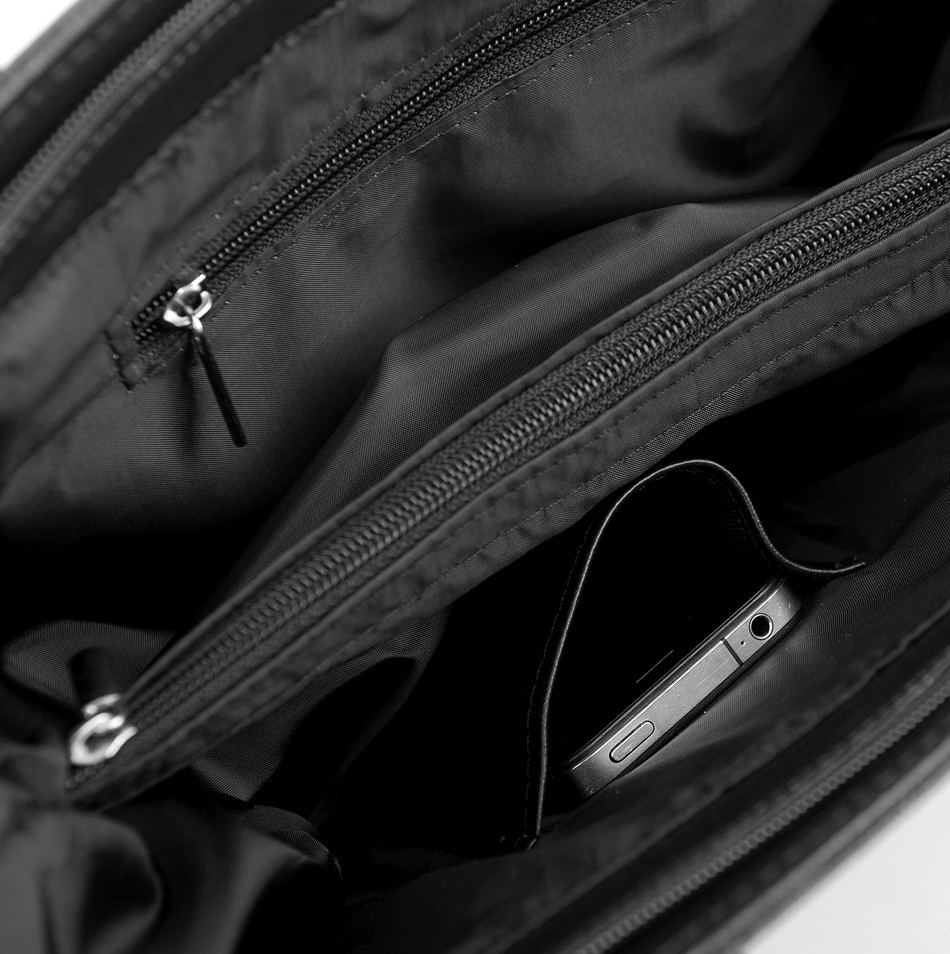 • Torebka dwukomorowa przedzielona dużą kieszenią na suwak na środku.