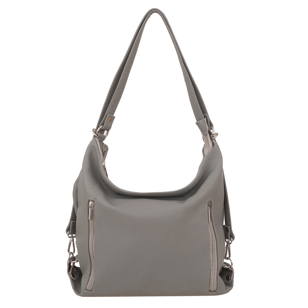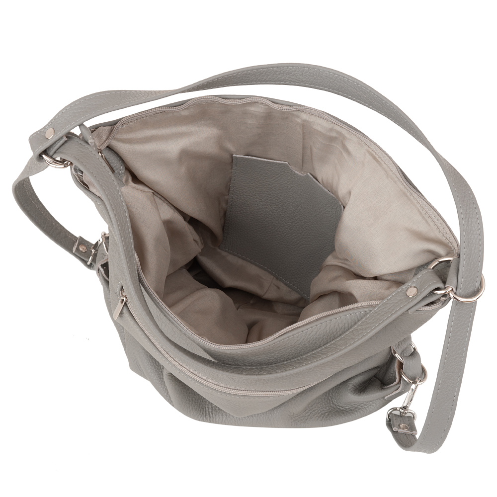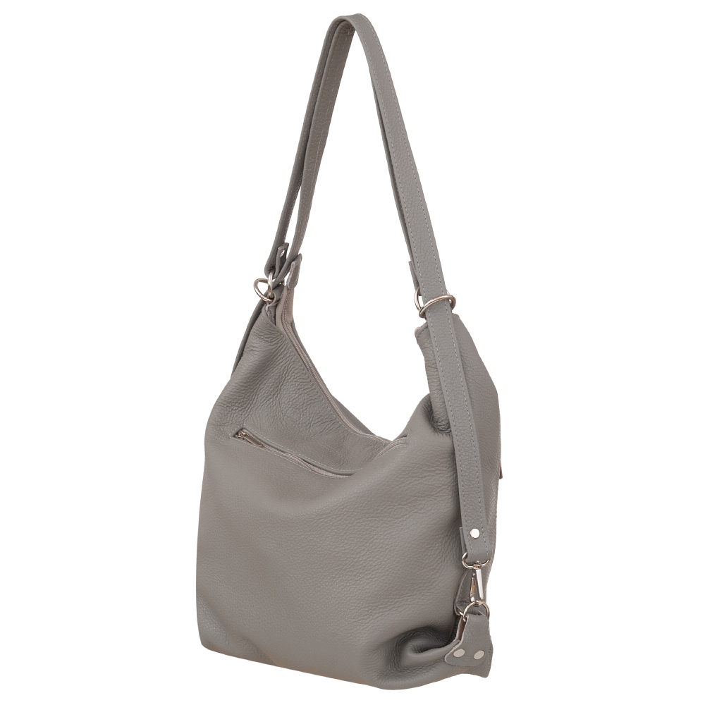Polska skórzana torebka plecak 2w1 wykonana w 100% z miękkiej skóry naturalnej. Zamykana z góry na zamek. Torebka jednokomorowa. Wewnątrz jedna kieszonka na zamek oraz jedna na telefon. Z przodu 2 x pionowa kieszonka na zamek + dodatkowo z tyłu kieszonka. Wnętrze wykończone trwałą materiałową mocną podszewką. Po zaciągnięciu pasków torebkę można nosić jako plecak. Duża możliwość regulacji długości pasków dzięki przepinanym karabińczykom od 50 cm do nawet 108 cm.