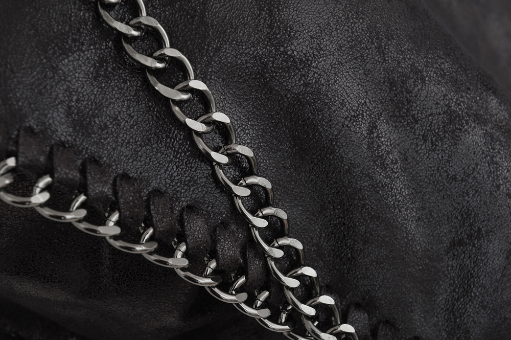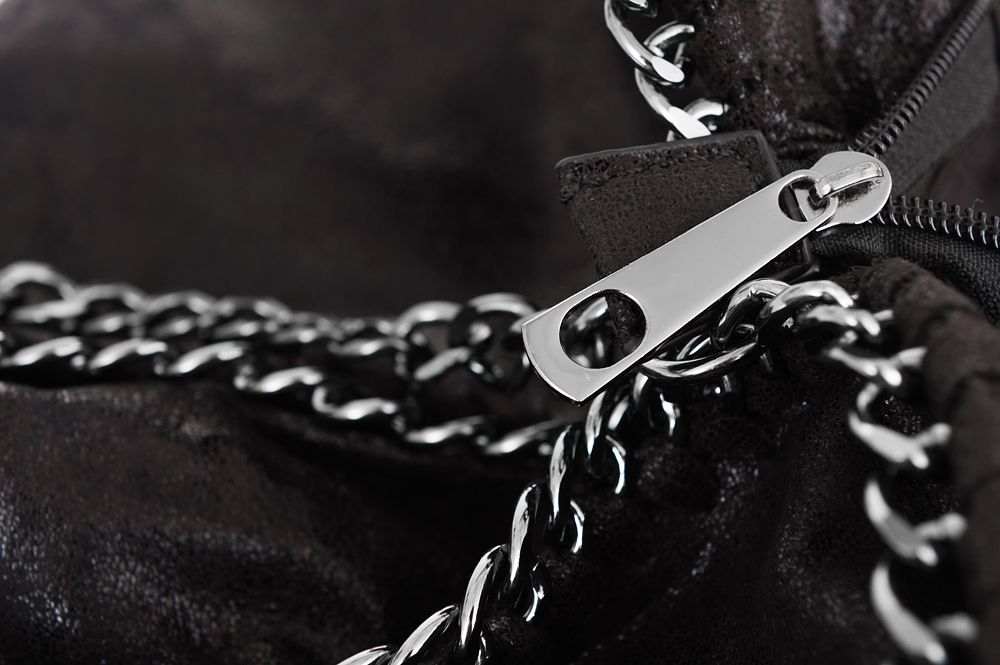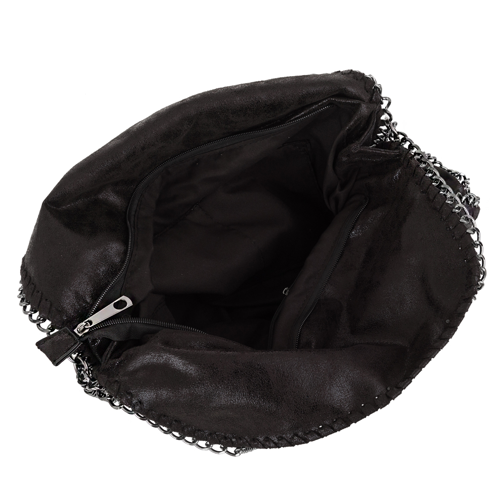 Modna torebka wykonana z miękkiej skóry ekologicznej wysokiej jakości. Zamykana z góry na suwak. Torebka dwukomorowa przedzielona dużą kieszenią na suwak na środku. Wewnątrz dodatkowo jedna kieszonka na zamek oraz dwie dodatkowe kieszonki. Wnętrze wykończone trwałą, czarną podszewką. Łańcuchy w kolorze inox (srebrny).