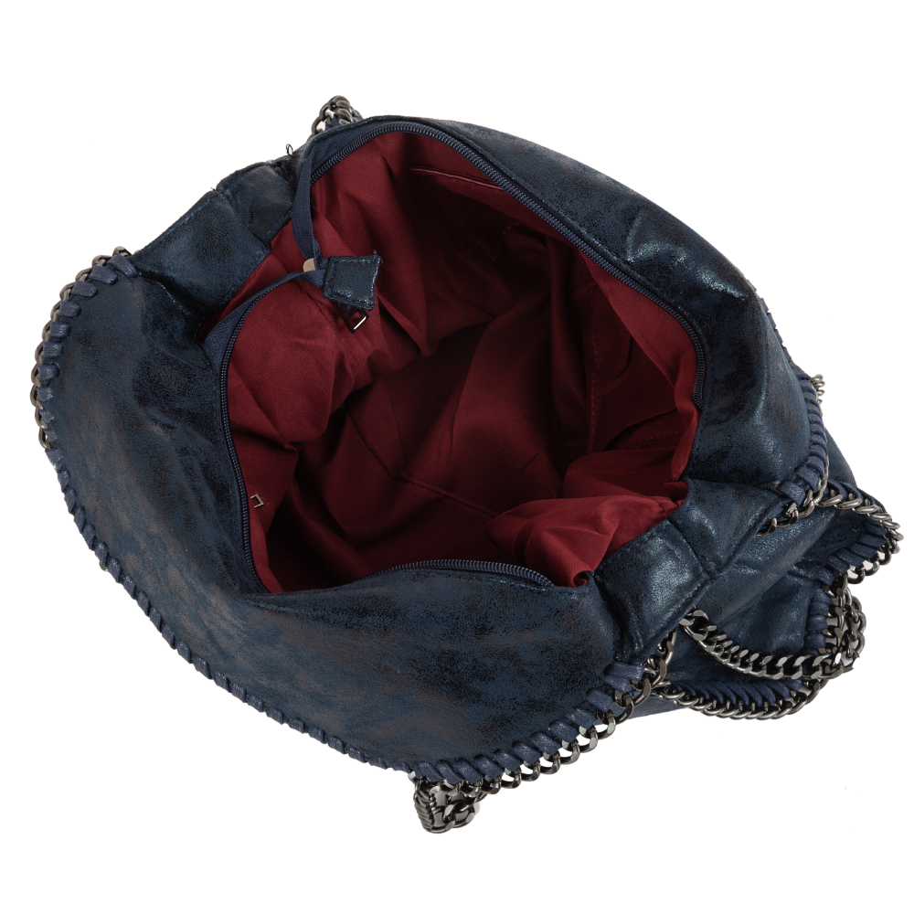 Modna torebka wykonana z miękkiej skóry ekologicznej wysokiej jakości. Zamykana z góry na suwak. Torebka dwukomorowa przedzielona dużą kieszenią na suwak na środku. Wewnątrz dodatkowo jedna kieszonka na zamek oraz dwie dodatkowe kieszonki. Wnętrze wykończone trwałą, czarną podszewką. Łańcuchy w kolorze inox (srebrny).
