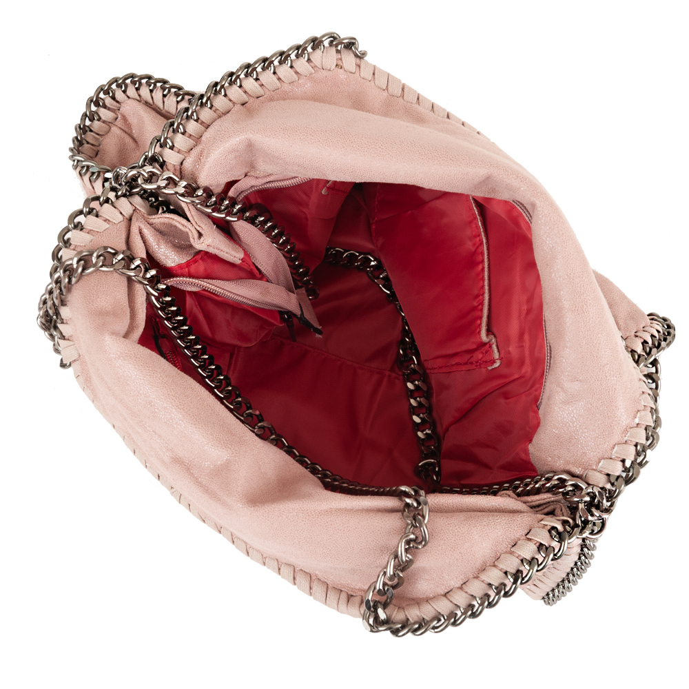 Modna torebka wykonana z miękkiej skóry ekologicznej wysokiej jakości. Zamykana z góry na suwak. Torebka dwukomorowa przedzielona dużą kieszenią na suwak na środku. Wewnątrz dodatkowo jedna kieszonka na zamek oraz dwie dodatkowe kieszonki. Wnętrze wykończone trwałą, czarną podszewką. Łańcuchy w kolorze inox (srebrny).