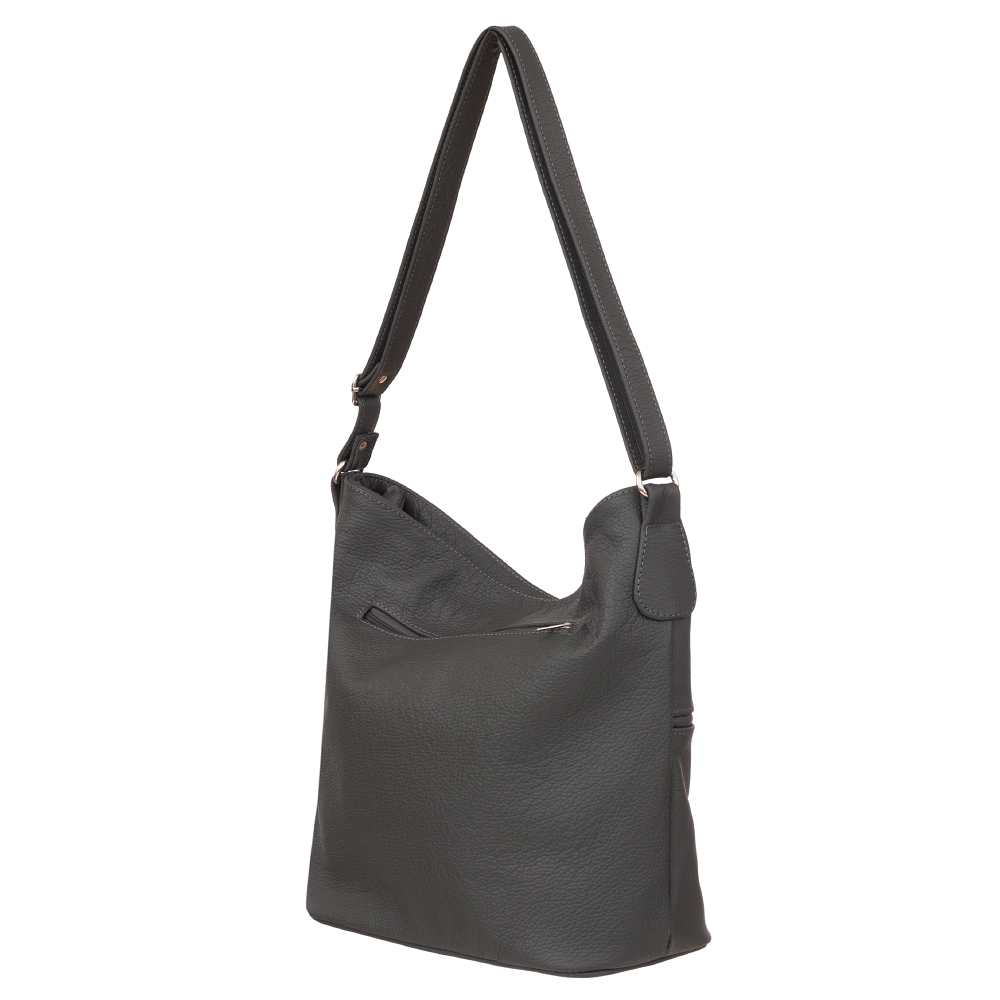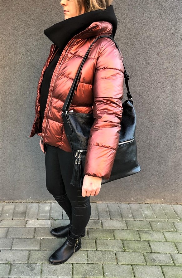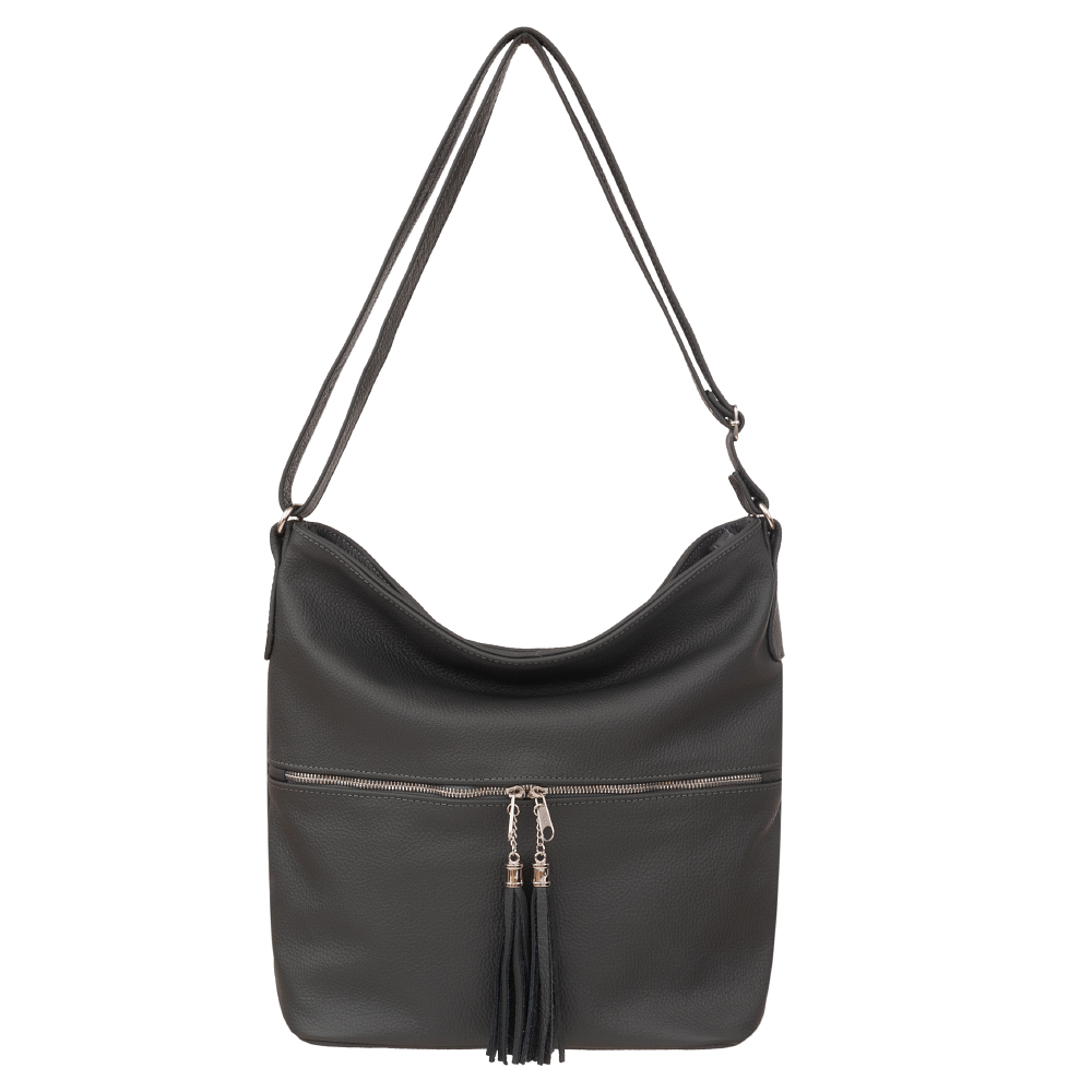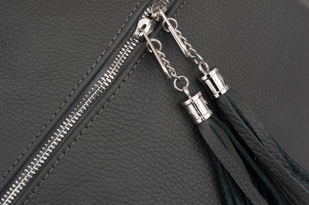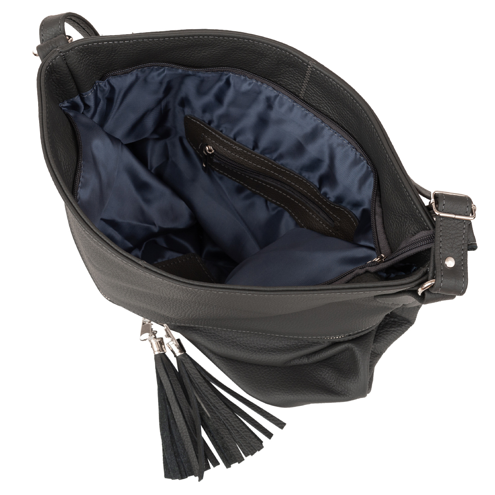 Skórzana A4 torebka wykonana w całości z miękkiej skóry naturalnej. Zamykana z góry na zamek na całej szerokości. Z przodu modne frędzle. Torebka jednokomorowa + wewnątrz dwie kieszonki na zamek, jedna na telefon + dodatkowa kieszeń na drobiazgi, klucze. Dodatkowo z tyłu kieszonka na suwak + kieszeń z przodu. Wnętrze wykończone trwałą, materiałową podszewką. Pasek z możliwością regulacji długości do 130 cm. Metalowe elementy w kolorze srebrnym. Dno torebki usztywnione.
