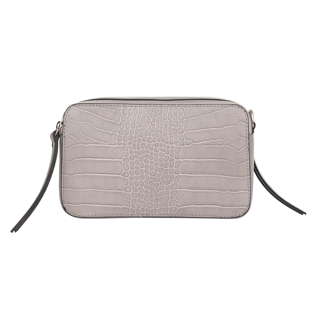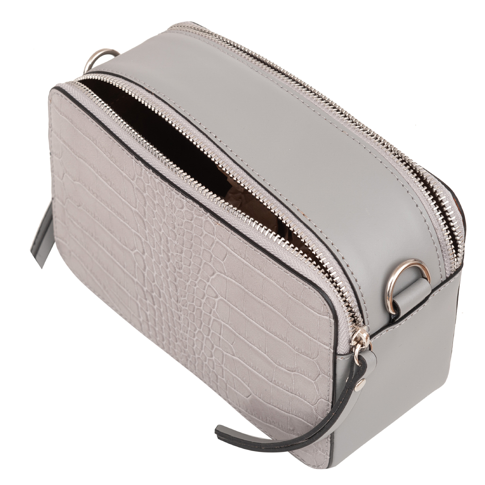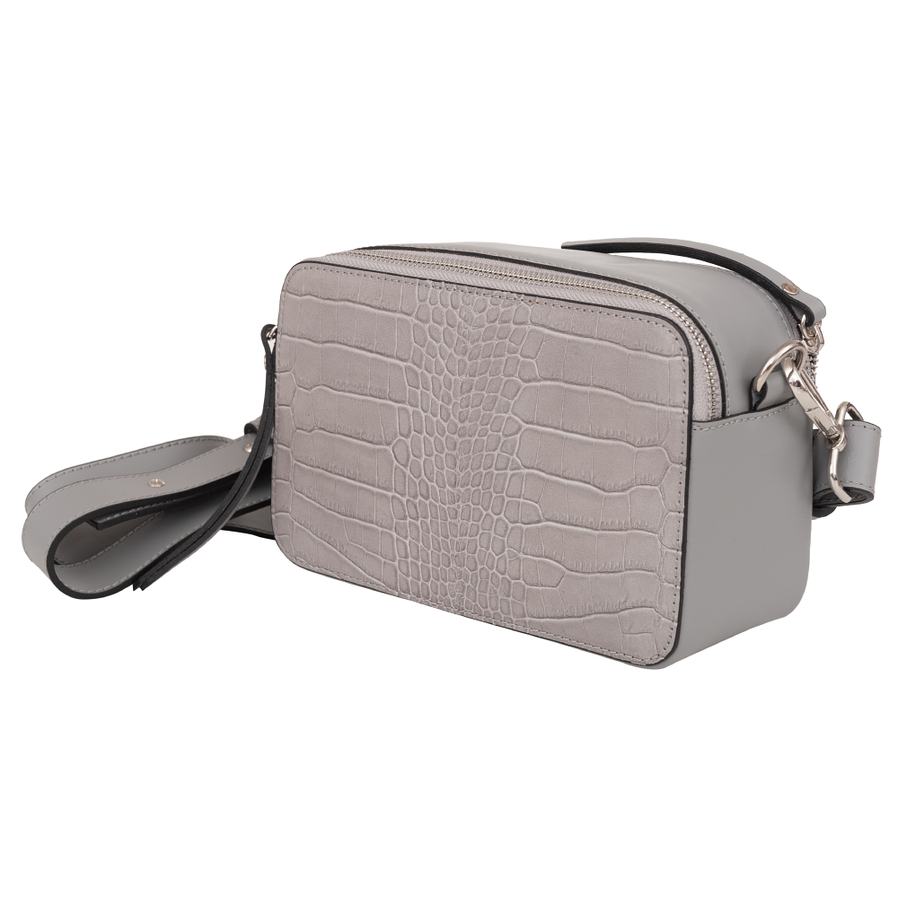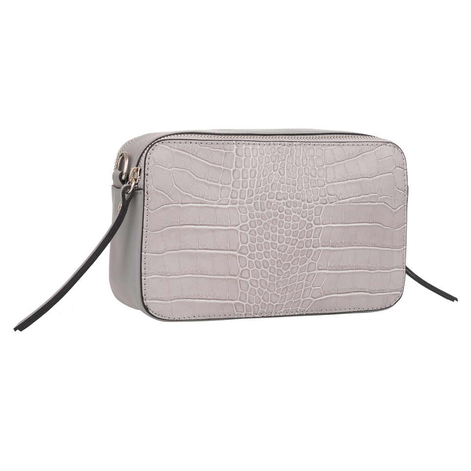 Włoska skórzana torebka listonoszka wykonana z wysokogatunkowej naturalnej skóry firmy VERA PELLE. Zamykana z góry na zamek. Torebka jednokomorowa, dwa wejścia do jednej przegrody. Elementy wykończenia w kolorze srebrnym. Skórzany szeroki pasek (3cm) z możliwością całkowitego odpięcia, dzięki czemu torebkę można nosić jako elegancką kopertówkę. Z przodu i z tyłu wstawka ze skóry z fakturą łuski krokodyla.
