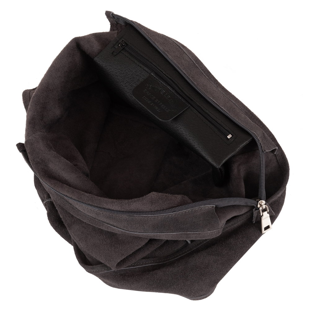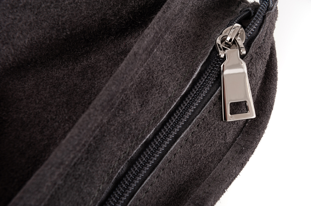Włoska skórzana torebka worek wykonana w 100% z naturalnej skóry zamszowej najwyższej jakości. Zamsz nie farbuje. Torebka zamykana z góry na zamek. Torebka jednokomorowa przedzielona dużą kieszenią na suwak. Wewnątrz jedna kieszonka na zamek. Wnętrze wykończone gładką skórą naturalną. Metalowe elementy w kolorze srebrnym. Szeroki pasek zapewni wygodne noszenie na ramieniu.