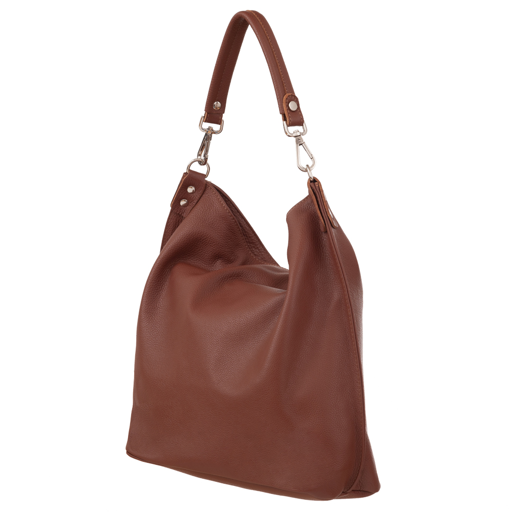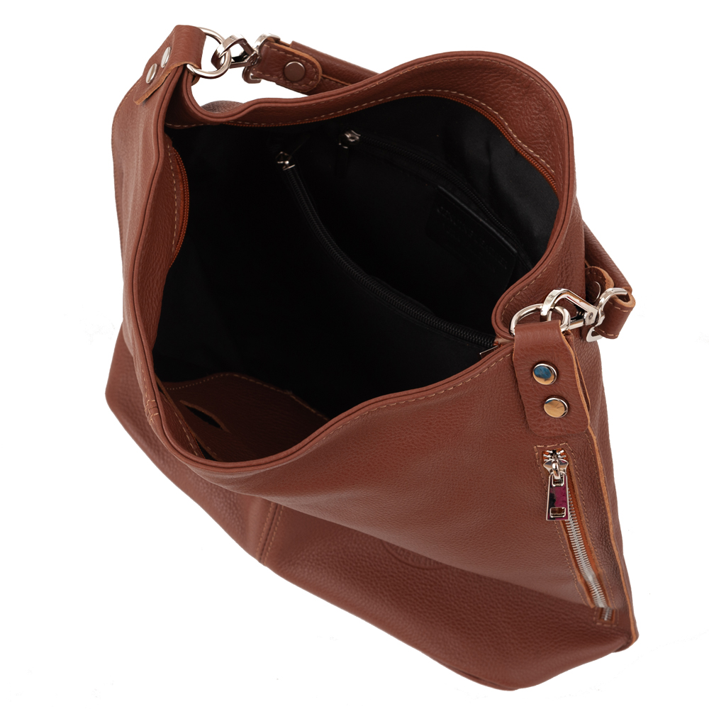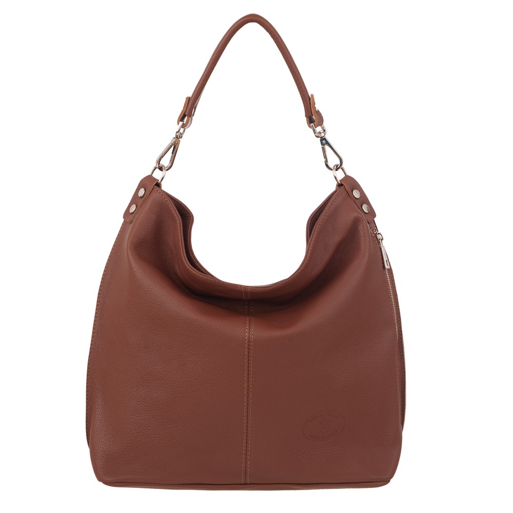 Vera Pelle - włoska XL skórzana torebka worek wykonana z wysokogatunkowej miękkiej naturalnej skóry. Oryginalna torebka w miejskim stylu, idealna na codzień. Zamykana z góry na suwak. Torebka jednokomorowa. Wewnątrz 2 x kieszonka na zamek, kieszonka na drobiazgi + jedna na telefon. Z przodu pojemna kieszeń zamek. Wnętrze wykończone trwałą materiałową podszewką. Dno lekko usztywnione. W komplecie długi regulowany pasek na ramię o maksymalnej długości 125 cm. Możliwość całkowitego wypięcia krótszego ucha i noszenie na długim pasku.