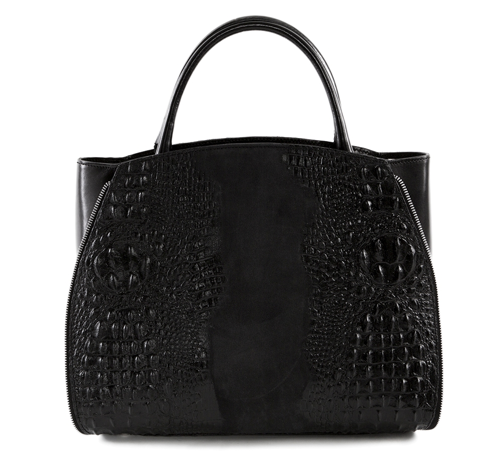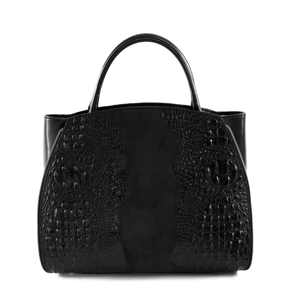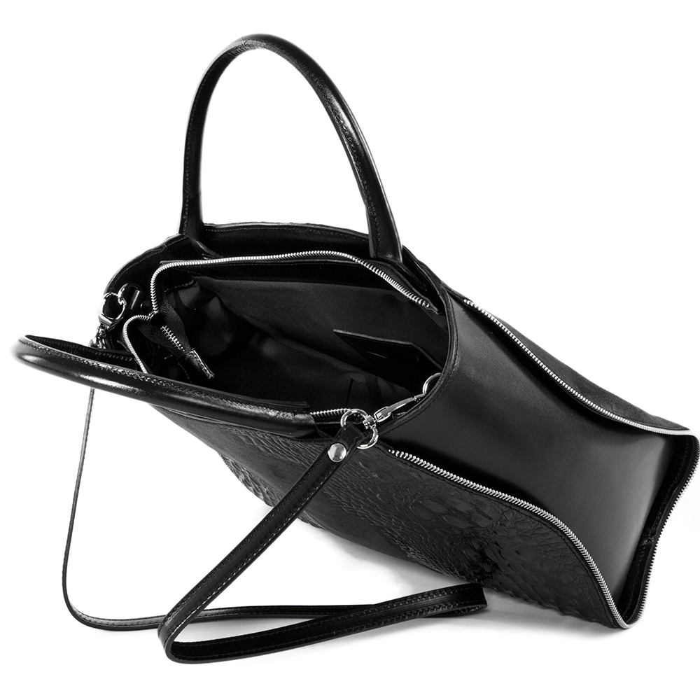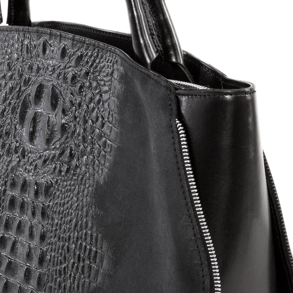 VERA PELLE - MADE IN ITALY. Włoska klasyczna skórzana torebka wykonana z wysokogatunkowej naturalnej skóry licowej łączonej zamszem naturalnym i motywem krokodyla. Zamykana na suwak. Torebka jednokomorowa. Wewnątrz jedna kieszonka na zamek + kieszonka na telefon. Wnętrze wykończone trwałą, ciemną podszewką. Torebka od spodu usztywniona oraz podbita ćwiekami. Elementy wykończenia w kolorze srebrnym. Dodatkowy pasek na ramię o długości 90 cm.