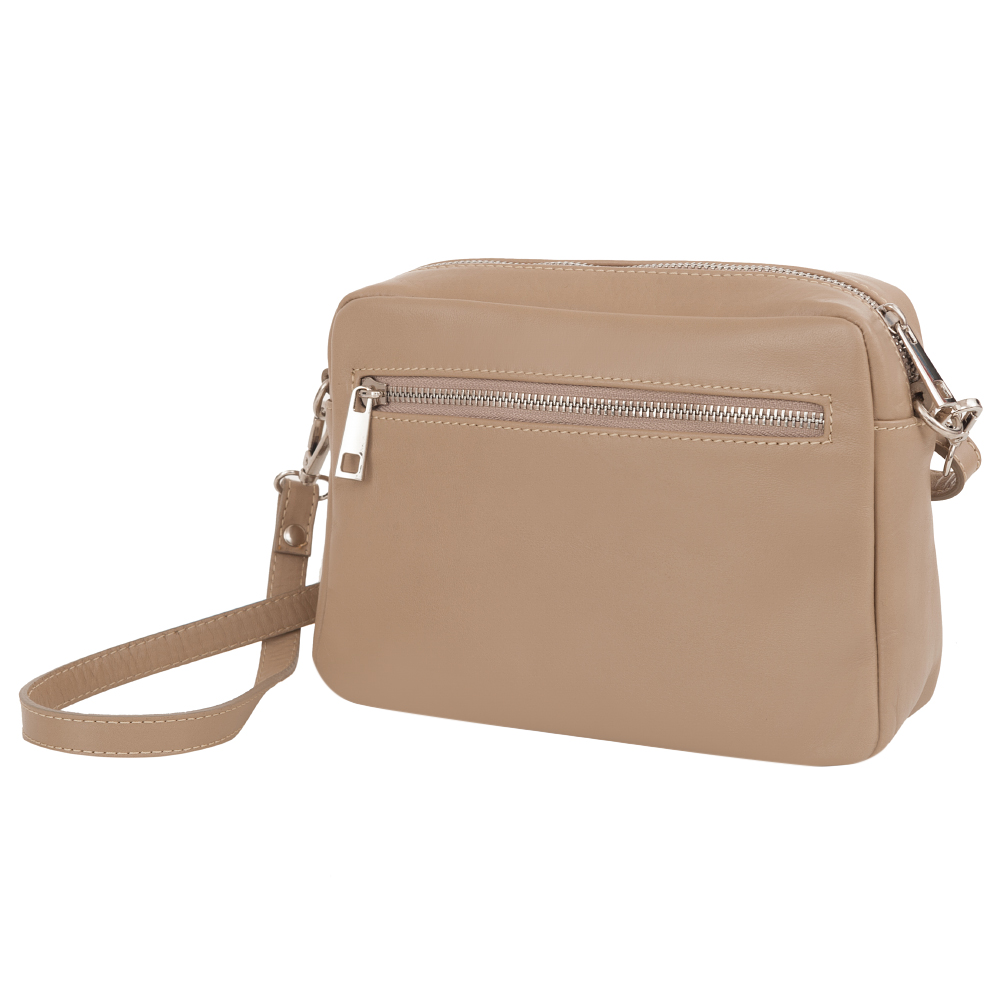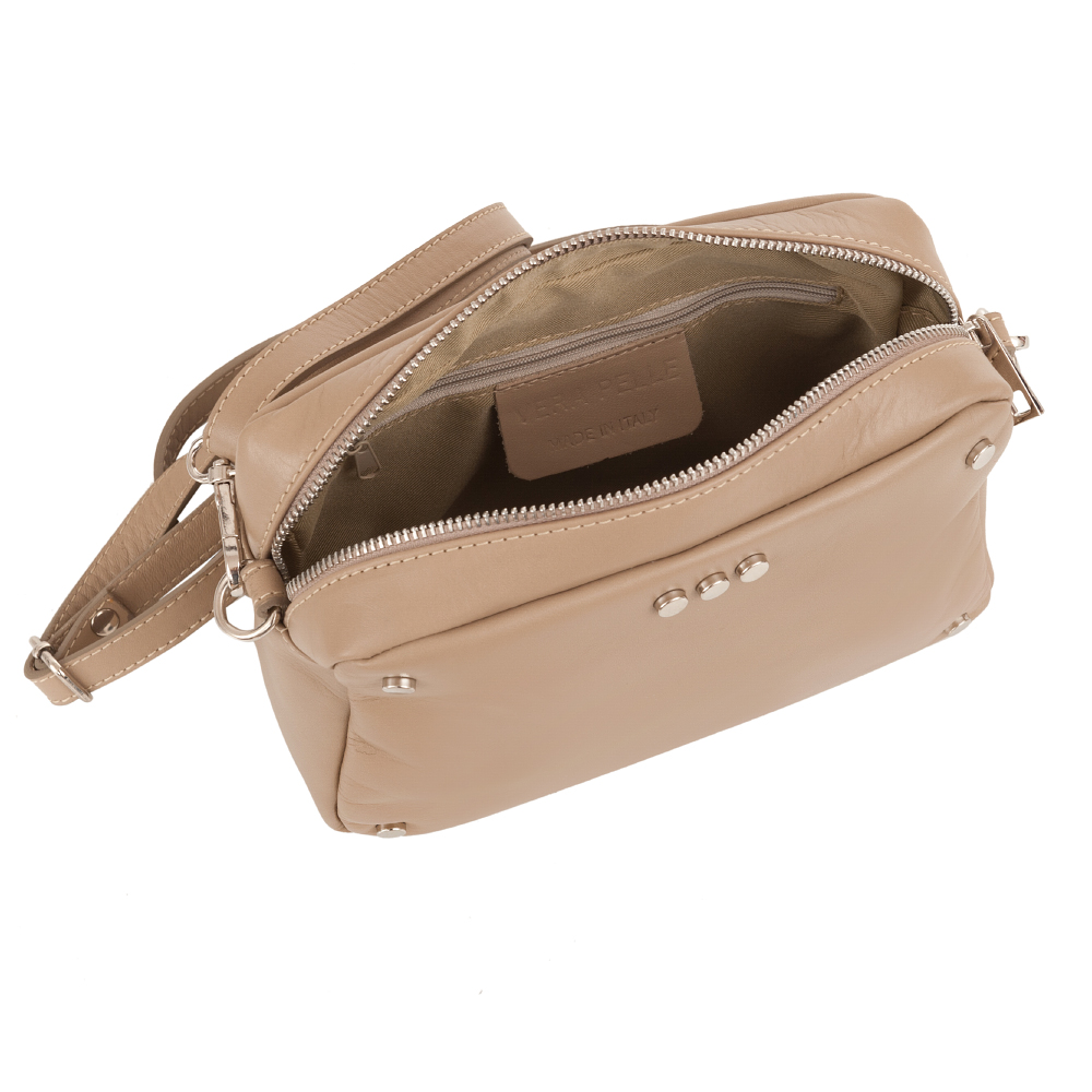 Vera Pelle - włoska modna, skórzana torebka listonoszka wykonana z wysokogatunkowej mięciutkiej gładkiej naturalnej skóry cielęcej. Zamykana od góry na zamek. Spód torebki usztywniony. Torebka jednokomorowa, wewnątrz jedna kieszonka na zamek + kieszonka na telefon. Wnętrze wykończone trwałą, czarną materiałową podszewką. Z tyłu dodatkowa kieszeń na zamek. Regulowany pasek o długości do 133 cm umożliwia wygodne noszenie na ramieniu lub przez ramię. Metalowe elementy wykończenia w kolorze srebrnym.
