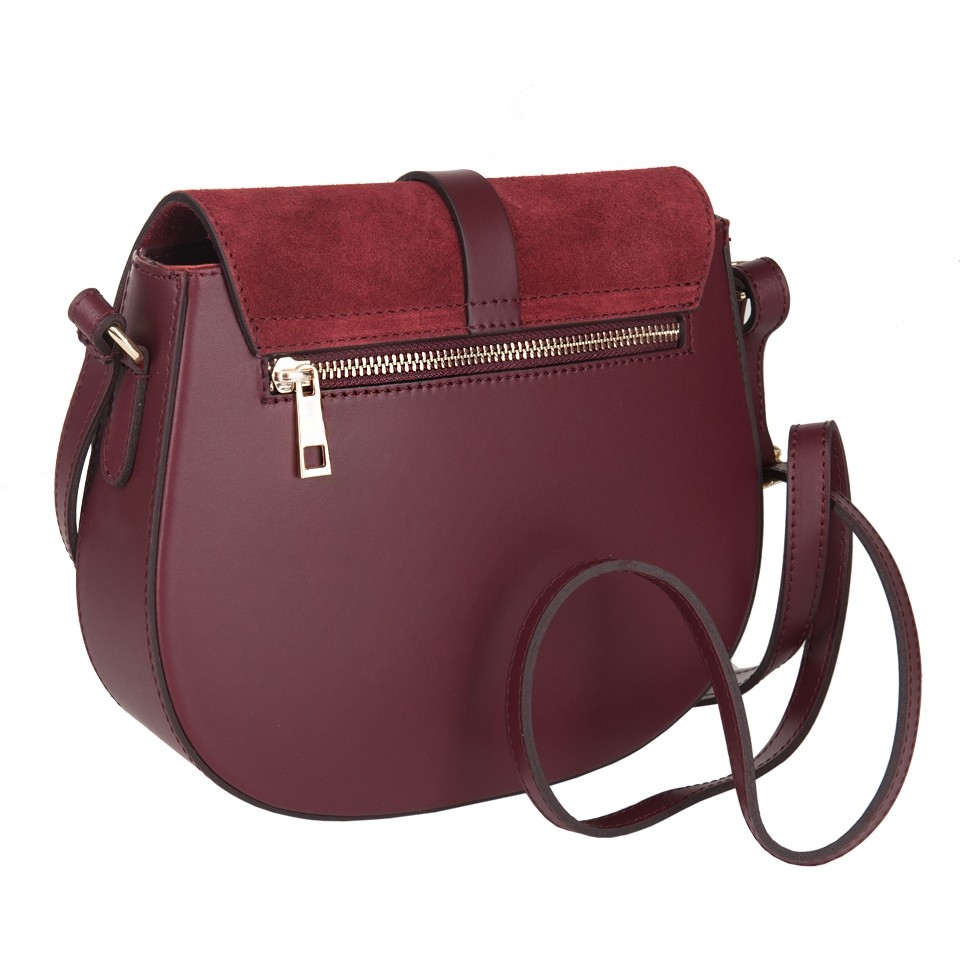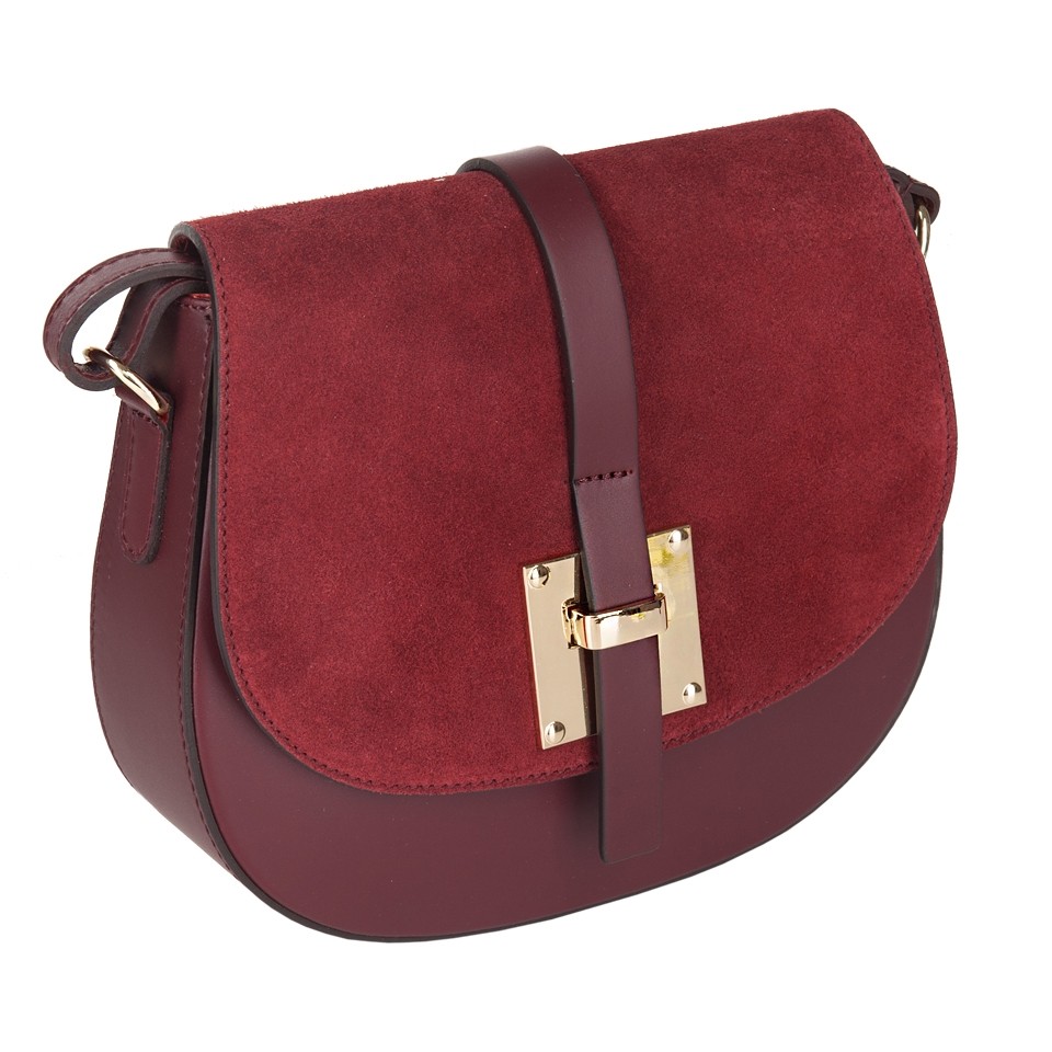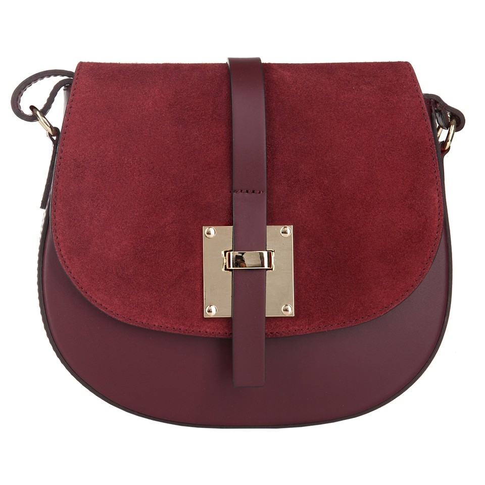 Włoska skórzana torebka listonoszka wykonana z wysokogatunkowej naturalnej skóry licowej łączonej z gładkim zamszem na klapie firmy VERA PELLE. Torebka w stylu miejskim. Modne połączenie dwóch rodzajów skór naturalnych. Zamykana z góry na klapę na magnes + zamek. Torebka jednokomorowa, wewnątrz jedna kieszonka na zamek + z tyłu kieszeń na zamek. Elementy wykończenia w kolorze złotym. Skórzany pasek z możliwością regulacji długości do 143 cm.