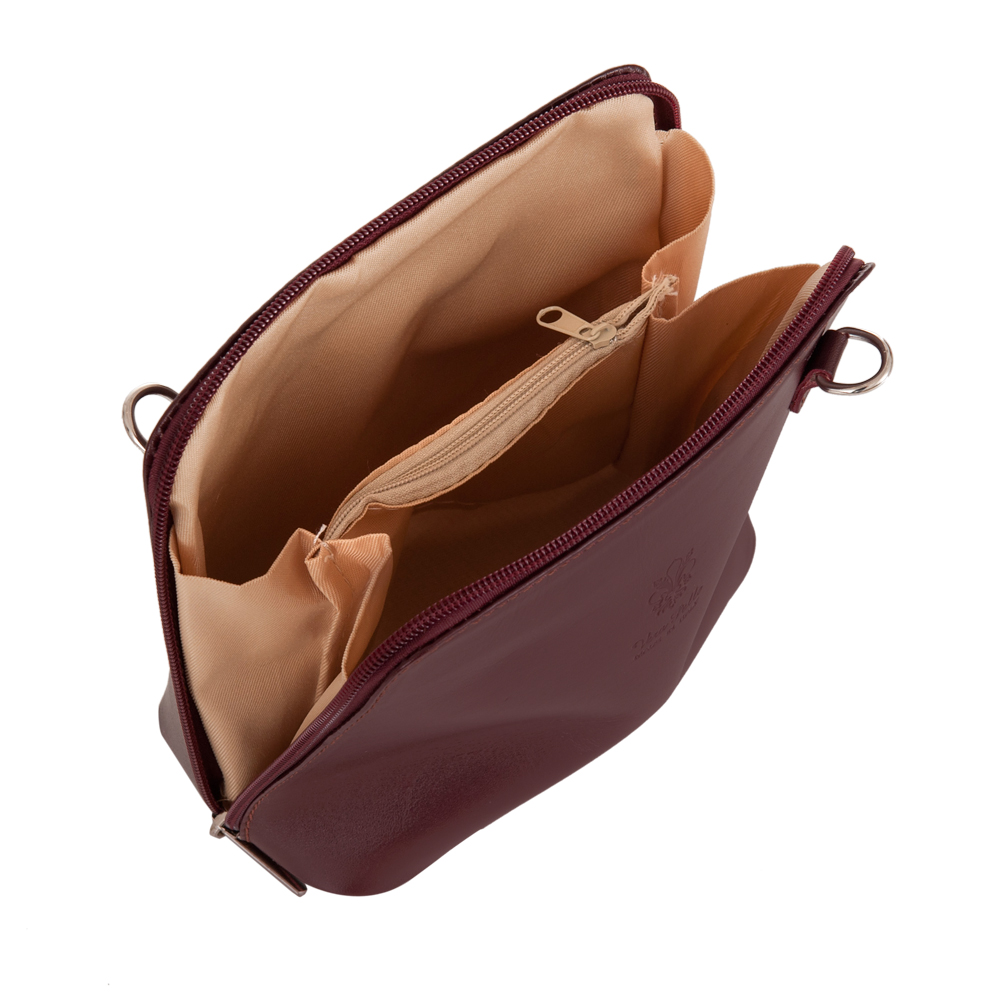 Vera Pelle - włoska mała, zgrabna skórzana listonoszka wykonana z wysokogatunkowej naturalnej gładkiej skóry licowej. Główna komora zamykana na podwójny suwak. Spód torebki usztywniony. Torebka jednokomorowa, wewnątrz dwie kieszonki. Wnętrze wykończone trwałą podszewką. Z tyłu kieszonka na suwak. Długi pasek umożliwia wygodne noszenie na ramieniu.