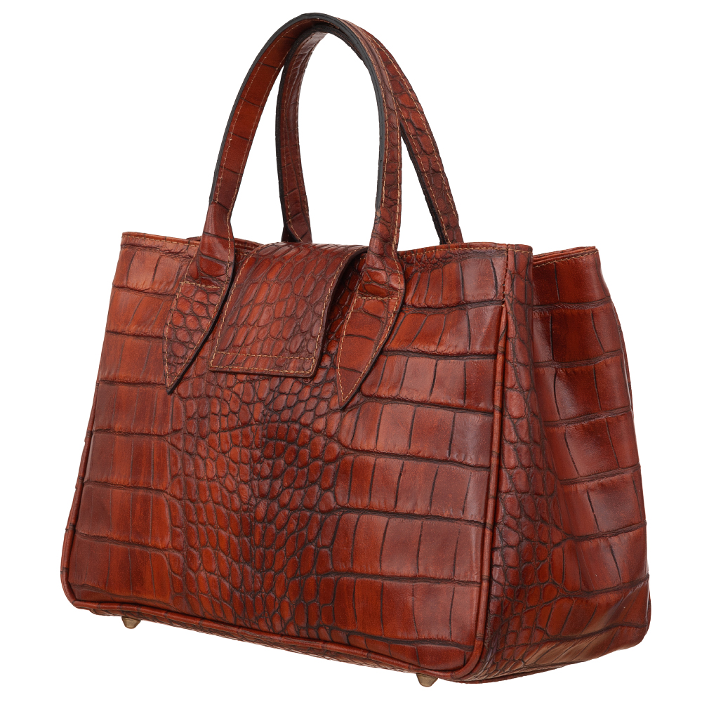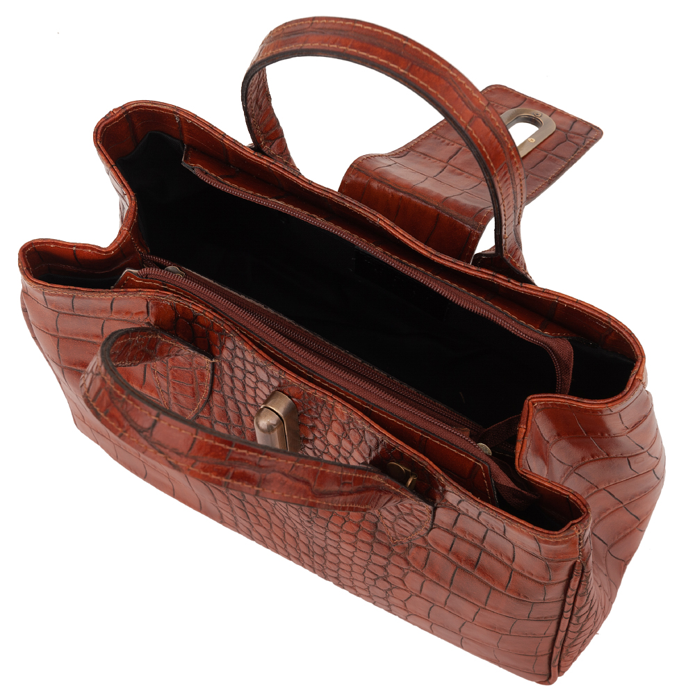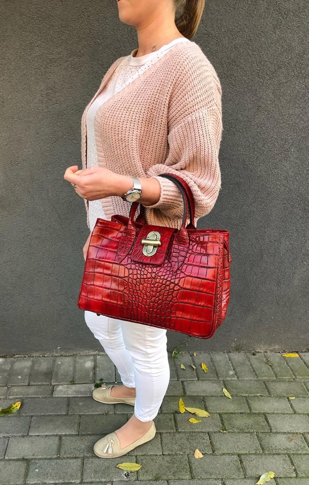 Vera Pelle - Włoska modna skórzana torebka kuferek wykonana z wysokogatunkowej naturalnej skóry z fakturą łuski krokodyla. Wygodny dostęp do środka. Torebka dwukomorowa zamykana na zamek + klapa na przekrętkę. Wewnątrz kieszonka na telefon + kieszonka na drobiazgi + kieszonka na zamek w drugiej przegródce. Torebka na środku przedzielona dużą kieszenią na zamek. Torebka od środka wykończona porządną, czarną materiałową podszewką. Elementy wykończenia w kolorze srebrnym dodają torebce elegancji. Dodatkowy pasek o długości 95 cm umożliwia noszenie torebki na ramieniu. Od spodu torebka podbita metalowymi nóżkami które chronią ją przed uszkodzeniami i zadrapaniem.