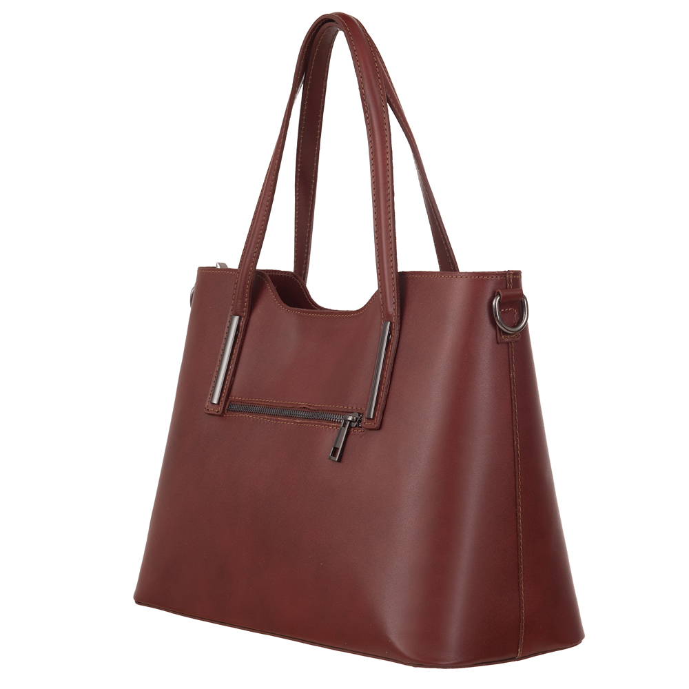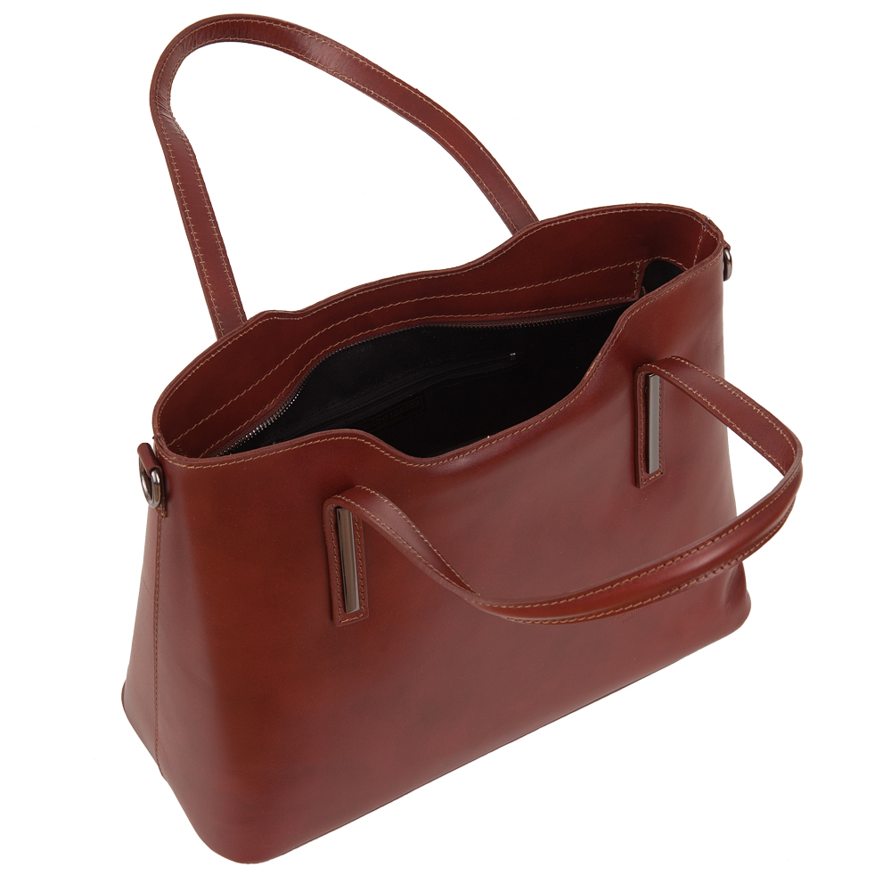 Włoska klasyczna skórzana torebka wykonana z wysokogatunkowej naturalnej gładkiej skóry licowej. Z przodu torebki wygrawerowane VERA PELLE - MADE IN ITALY. Zamykana od góry na zamek na całej szerokości. Torebka jednokomorowa przedzielona na środku dużą kieszenią na zamek dzielącą ją na dwie części. Wewnątrz jedna kieszonka na zamek + kieszonka na telefon + dadarkowa kieszeń. Z tyłu kieszeń na zamek. Wnętrze wykończone trwałą, materiałową ciemną podszewką. Torebka od spodu usztywniona oraz podbita nóżkami. Elementy wykończenia w kolorze srebrnym (inox). Dodatkowy pasek na ramię o długości 93 cm.