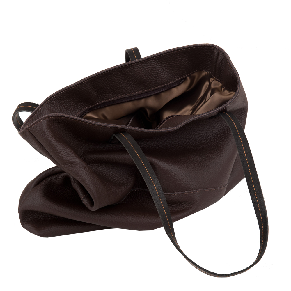 Vera Pelle - MADE IN ITALY Włoska skórzana miękka torebka wykonana w całości z wysokogatunkowej naturalnej skóry. Model idealnie pasuje do stylizacji w miejskim stylu. Zamykana od góry na suwak na całej szerokości. W środku duża komora + miejsce na telefon + dodatkowa kieszonka + kieszeń na zamek. Wnętrze torebki wykończone mocną, porządną podszewką. Uszy z czarnej skóry. Elementy metalowe w kolorze srebrnym nadają torebce modnego stylu.