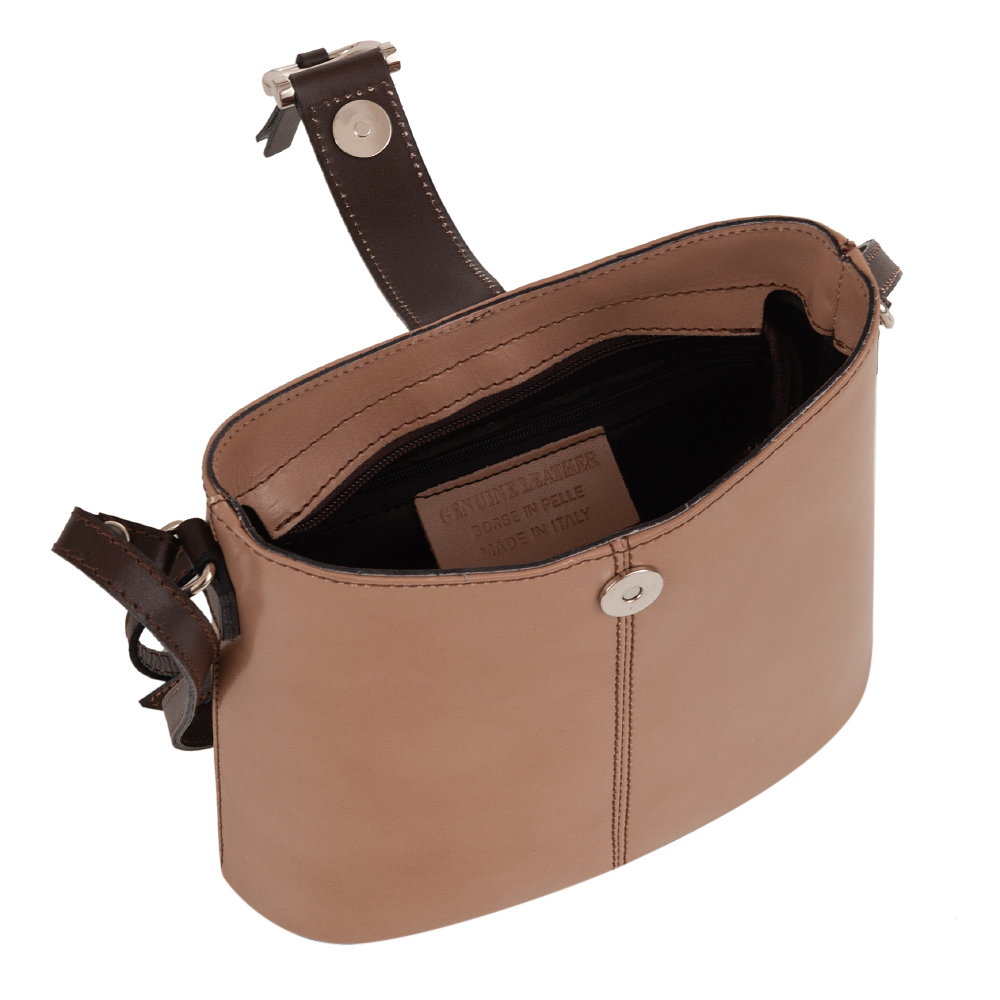 Włoska skórzana listonoszka wykonana z wysokogatunkowej naturalnej gładkiej skóry licowej firmy Pelle. Zamykana z góry na suwak + klapka na magnes. Spód torebki usztywniony. Torebka jednokomorowa, wewnątrz jedna kieszonka na zamek oraz jedna na telefon. Wnętrze wykończone trwałą podszewką. Z tyłu kieszonka na suwak. Długi, regulowany pasek umożliwia wygodne noszenie na ramieniu.