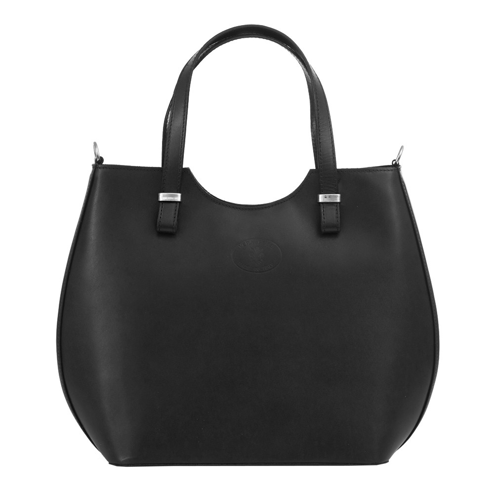 Vera Pelle - włoska pojemna A4 modna skórzana torebka wykonana z wysokogatunkowej naturalnej skóry licowej. Wygodny dostęp do środka. Torebka jednokomorowa. Od góry zamykana na suwak. Wewnątrz dodatkowo 2 x kieszonka za zamek + kieszeń na telefon + kieszonka na drobiazgi. Torebka od środka wykończona porządną, czarną podszewką. Dno usztywnione i podbite srebrnymi nóżkami. W komplecie długi, regulowany pasek na ramię o długości max. 119 cm.