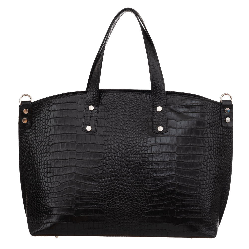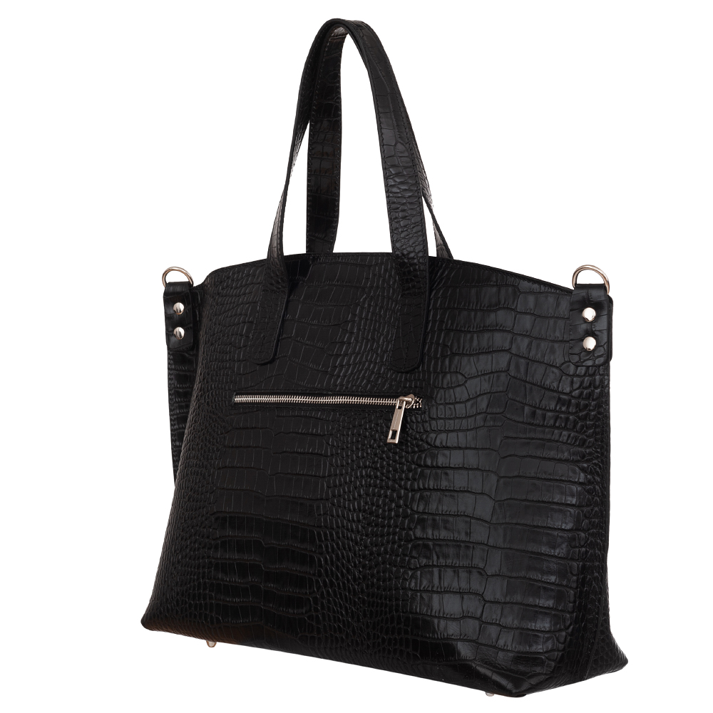VERA PELLE włoska modna skórzana A4 torebka wykonana z wysokogatunkowej naturalnej skóry licowej ala krokodyla. Wygodny dostęp do środka. Torebka jednokomorowa, od góry zamykana na suwak. Wewnątrz kieszonka na telefon + 2 x kieszonka na zamek + kieszonka na drobiazgi. Torebka od środka wykończona porządną, materiałową podszewką. Elementy wykończenia w kolorze srebrnym. Z tyłu kieszeń na zamek. Szerokie wygonde uszy. Dno usztywnione i podbite nóżkami, aby nie niszczył się spód. W komplecie dodatkowy pasek o długości 93 cm.