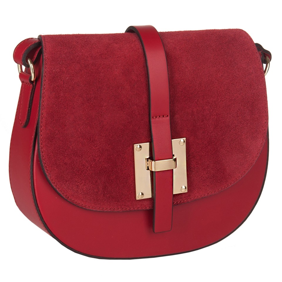 Włoska skórzana torebka listonoszka wykonana z wysokogatunkowej naturalnej skóry licowej łączonej z gładkim zamszem na klapie firmy VERA PELLE. Torebka w stylu miejskim. Modne połączenie dwóch rodzajów skór naturalnych. Zamykana z góry na klapę na magnes + zamek. Torebka jednokomorowa, wewnątrz jedna kieszonka na zamek + z tyłu kieszeń na zamek. Elementy wykończenia w kolorze złotym. Skórzany pasek z możliwością regulacji długości do 143 cm.