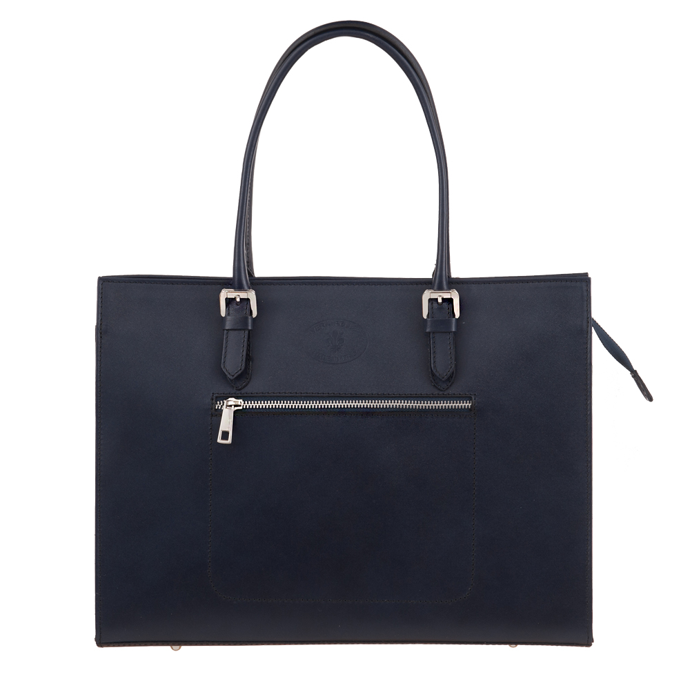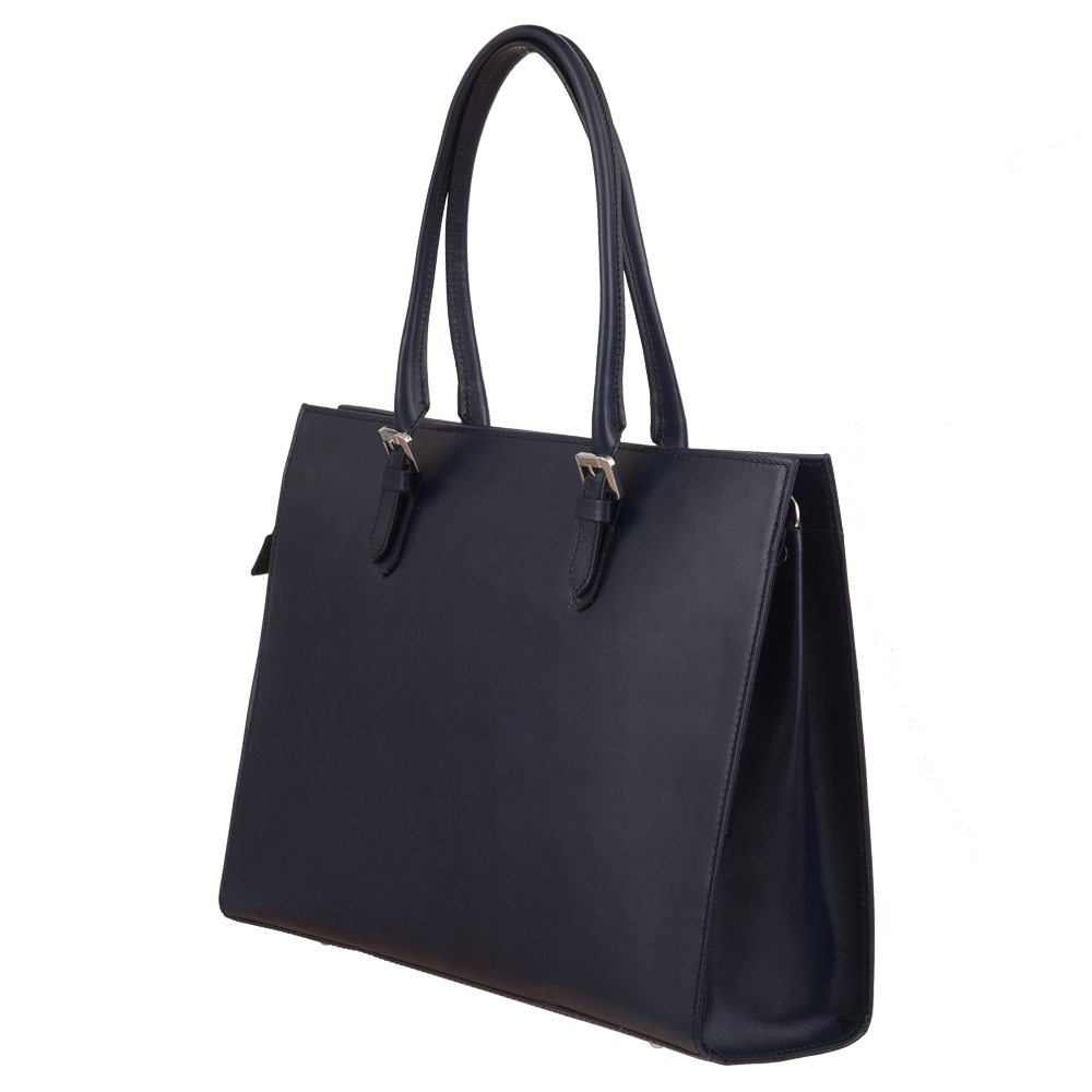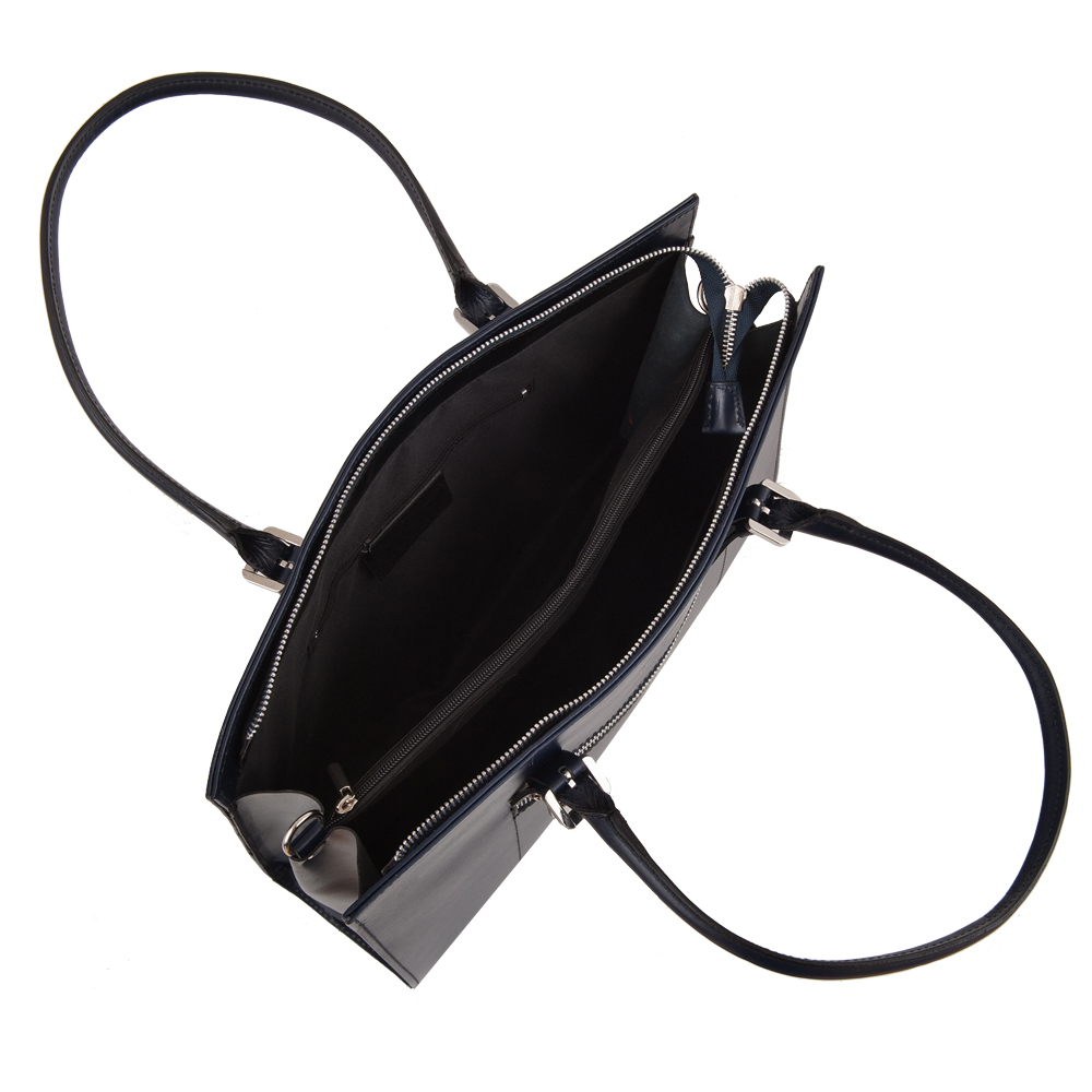 Włoska klasyczna skórzana A4 torebka wykonana z wysokogatunkowej naturalnej gładkiej skóry licowej. Zamykana od góry na zamek na całej szerokości. Torebka dwukomorowa przedzieloną dużą kieszenią na suwak. Wewnątrz dodatkowo jedna kieszonka na zamek, jedna na telefon + dodatkowa kieszonka. Wnętrze wykończone trwałą, ciemną materiałową podszewką. Dodatkowo z przodu torebki kieszonka na zamek. Torebka od spodu usztywniona oraz podbita nóżkami chroniącymi ją przed uszkodzeniami i zadrapaniami. Metalowe elementy wykończenia w kolorze srebrnym. W komplecie długi pasek na ramię o dł. 94 cm. Uszy w torebce można regulować na długość.