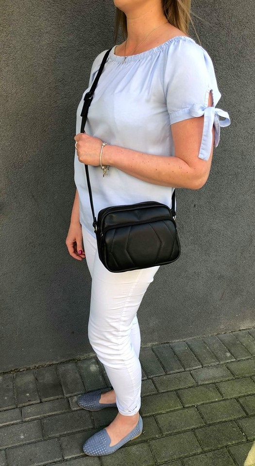 Vera Pelle - Włoska modna pojemna skórzana torebka listonoszka wykonana z wysokogatunkowej miękkiej naturalnej skóry cielęcej. Zamykana z góry na zamek na całej szerokości. Torebka dwukomorowa. W dużej komorze kieszonka na zamek + kieszonka na telefon. Wnętrze wykończone trwałą, czarną materiałową podszewką. Pasek z możliwością regulacji długości do 135 cm. Metalowe elewementy w kolorze inox (metaliczno-srebrny).