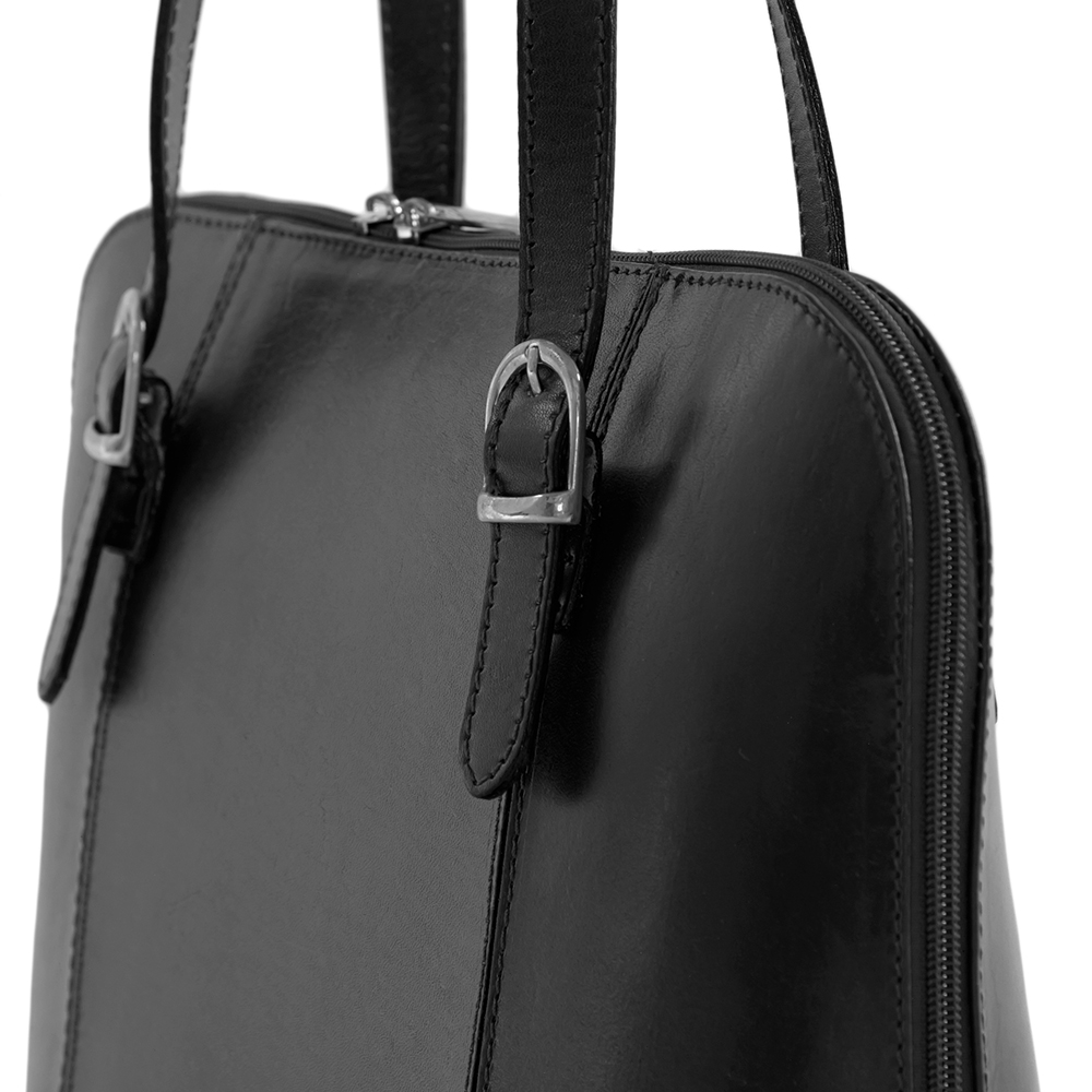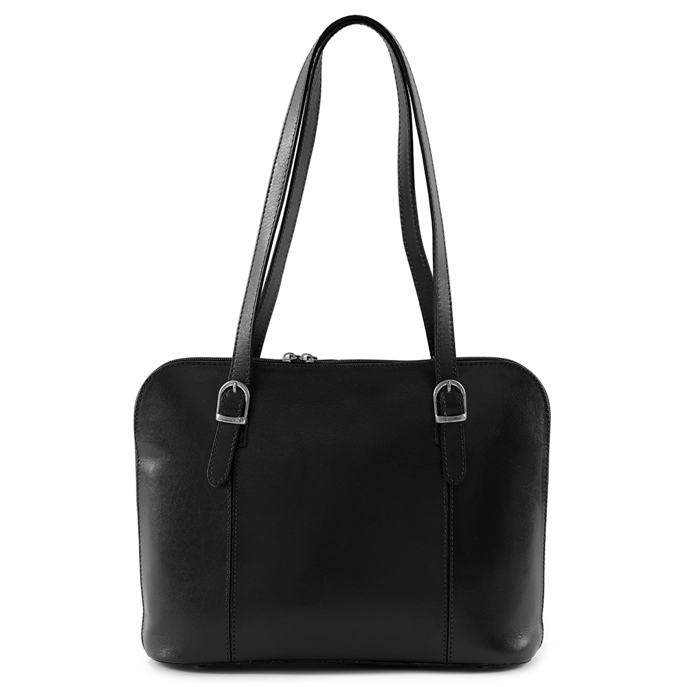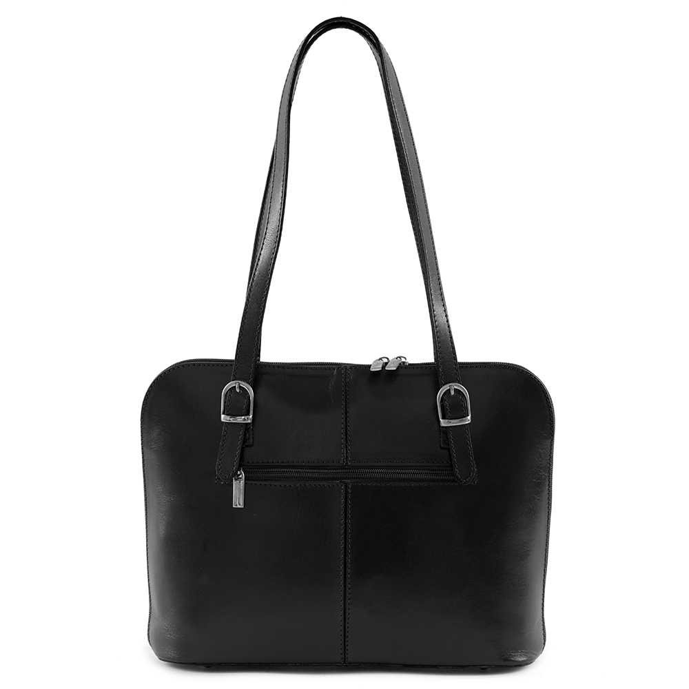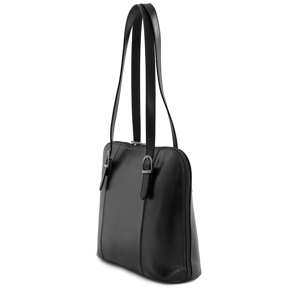 Włoska klasyczna skórzana torebka wykonana z wysokogatunkowej naturalnej gładkiej skóry licowej firmy Vera Pelle. Wygodny dostęp do środka. Zamykana dookoła na 2 suwaki. Torebka jednokomorowa przedzieloną dużą kieszenią na suwak. Wewnątrz jedna kieszonka na zamek oraz jedna na telefon. Wnętrze wykończone trwałą podszewką dopasowaną kolorystycznie do skóry. Dodatkowo z tyłu torebki kieszonka na suwak. Torebka od spodu usztywniona oraz podbita ćwiekami, co chroni ją przeciw uszkodzeniom. Elementy wykończenia w kolorze srebrnym.