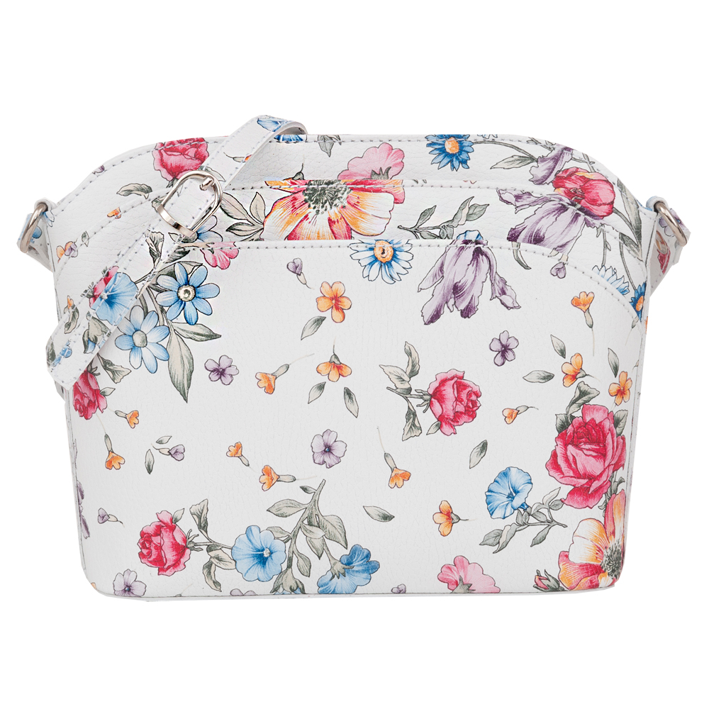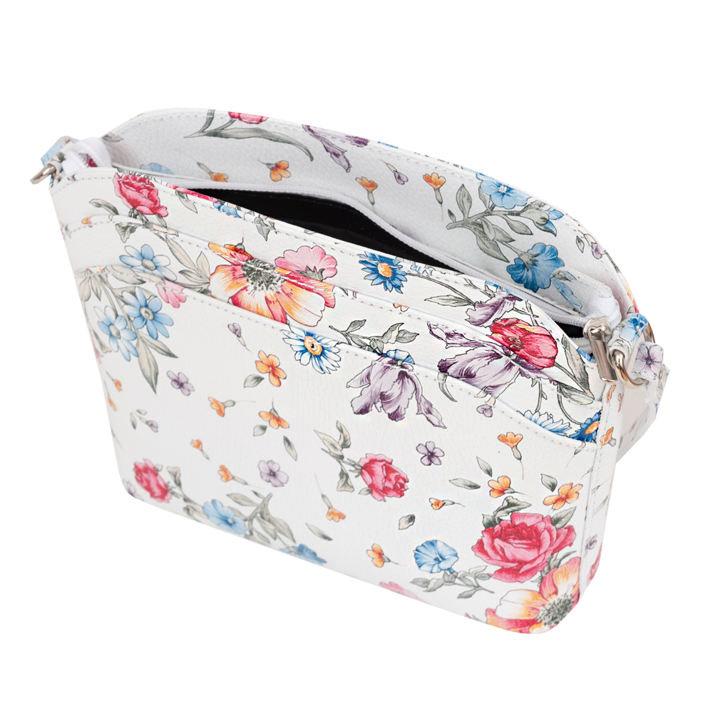 Vera Pelle - włoska modna, skórzana torebka listonoszka wykonana z wysokogatunkowej naturalnej skóry z motywem kolorowych kwiatów. Zamykana od góry na zamek na całej szerokości. Spód torebki usztywniony. Torebka jednokomorowa, wewnątrz jedna kieszonka na zamek + kieszonka na telefon. Wnętrze wykończone trwałą, materiałową czarną podszewką. Z tyłu dodatkowa kieszeń na zamek + kieszeń wsuwna z przodu. Regulowany pasek o długości do 135 cm umożliwia wygodne noszenie na ramieniu lub przez ramię. Metalowe elementy wykończenia w kolorze srebrnym. Dno usztywnione.