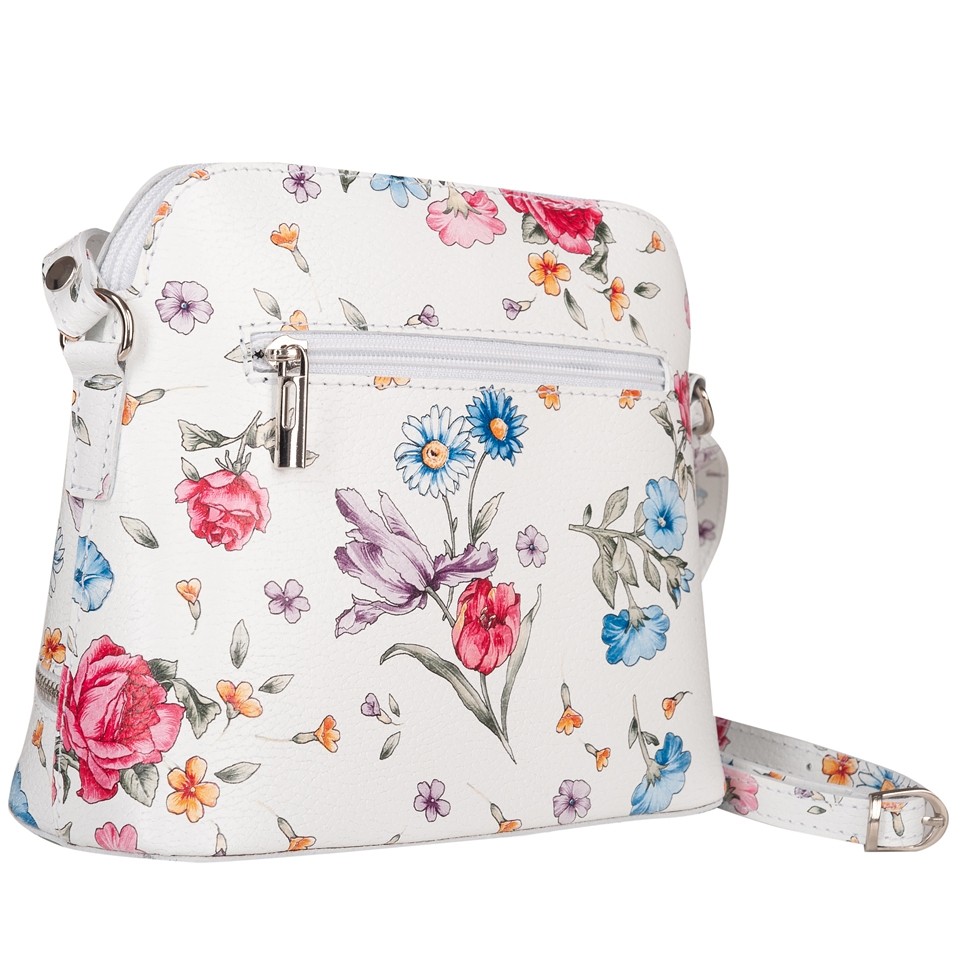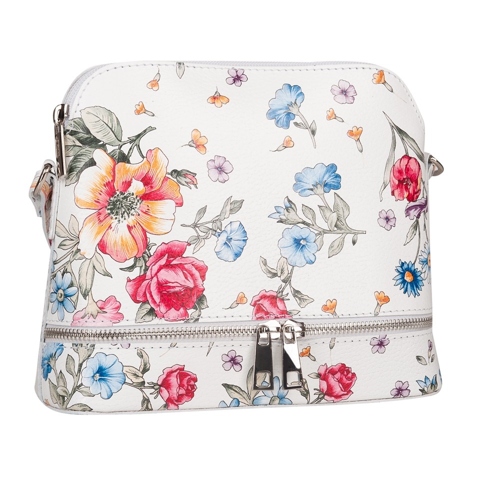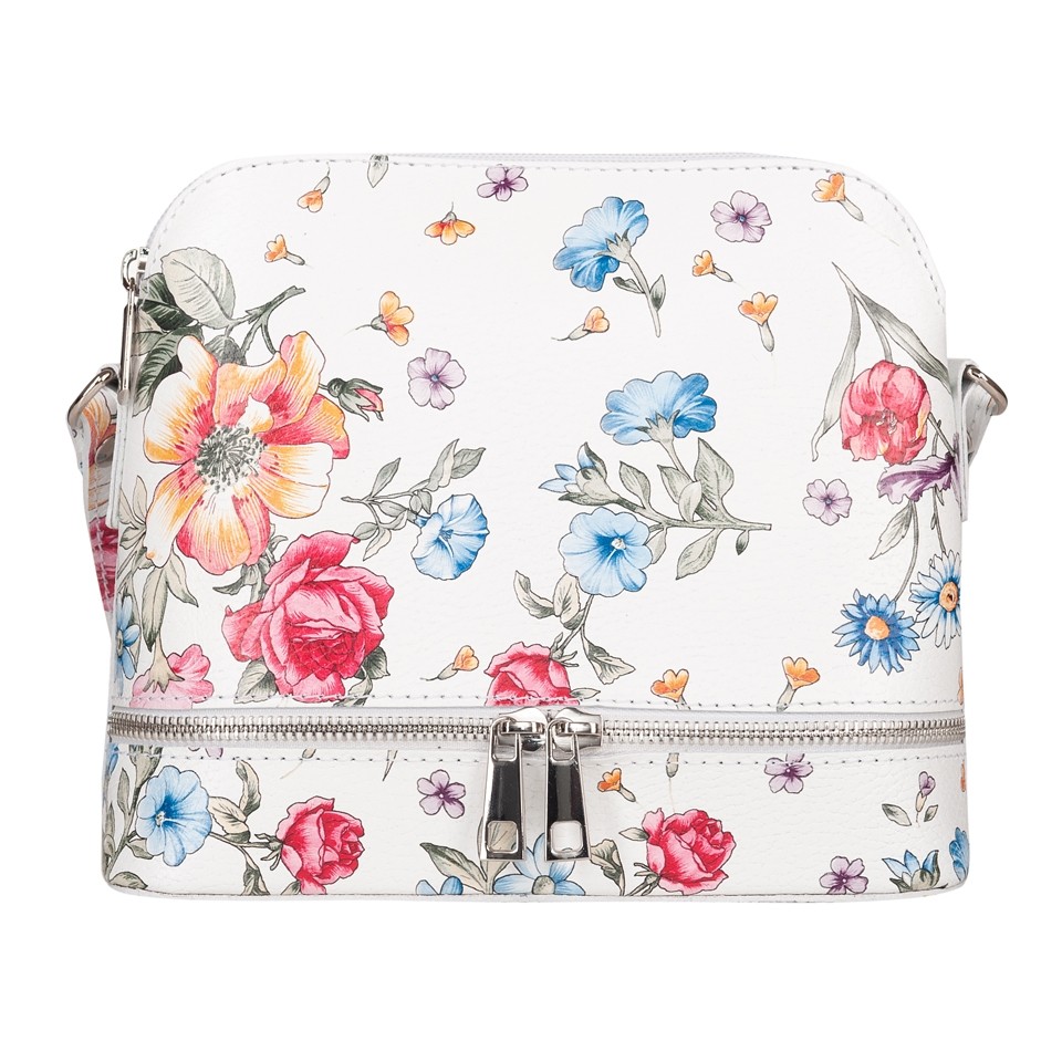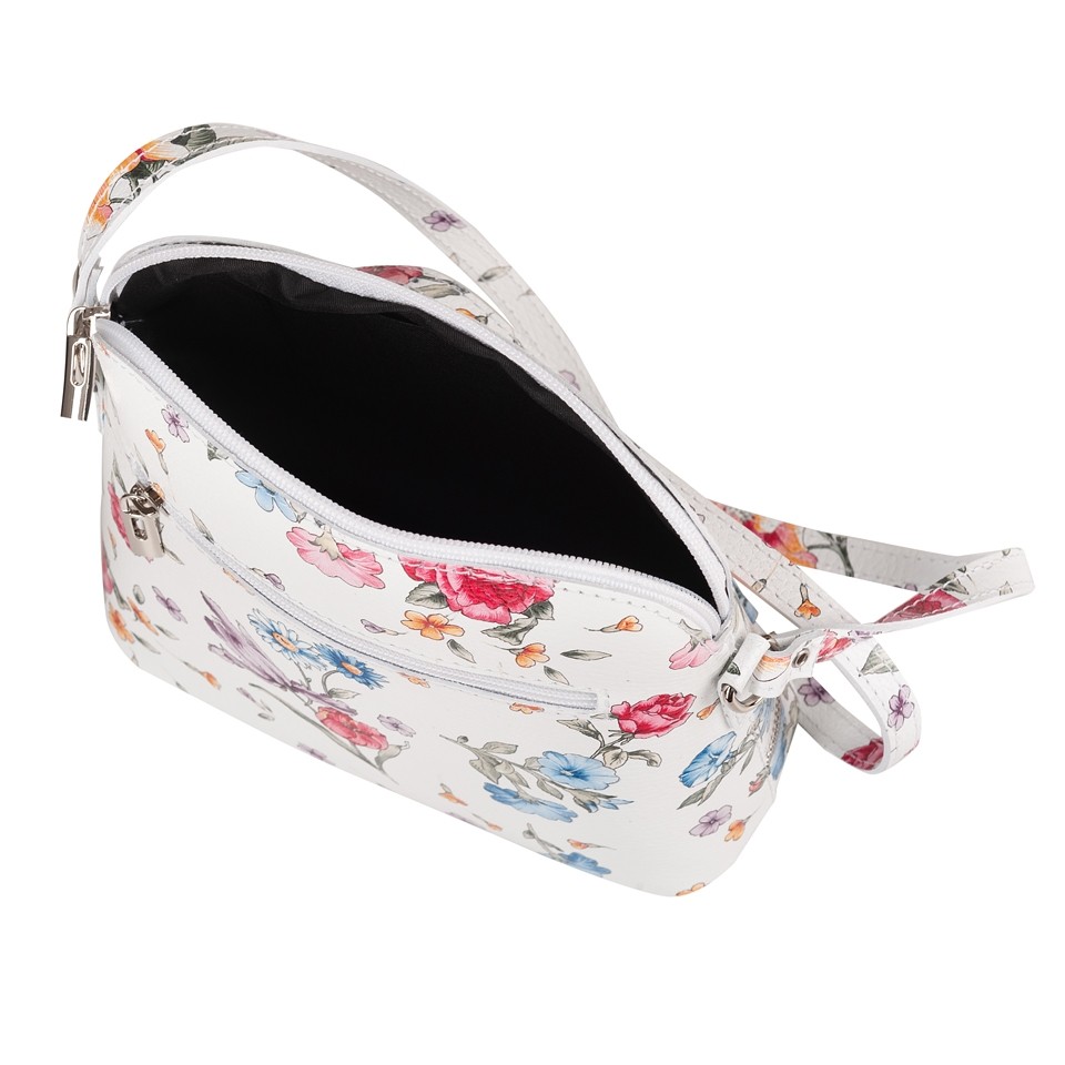 Vera Pelle - włoska modna, skórzana torebka listonoszka wykonana z wysokogatunkowej naturalnej skóry z motywem kolorowych kwiatów. Zamykana od góry na zamek na całej szerokości. Spód torebki usztywniony. Torebka jednokomorowa, wewnątrz jedna kieszonka na zamek + kieszonka na telefon. Wnętrze wykończone trwałą, materiałową podszewką. Z tyłu dodatkowa kieszeń na zamek. Regulowany pasek o długości do 142 cm umożliwia wygodne noszenie na ramieniu lub przez ramię. Metalowe elementy wykończenia w kolorze srebrnym.