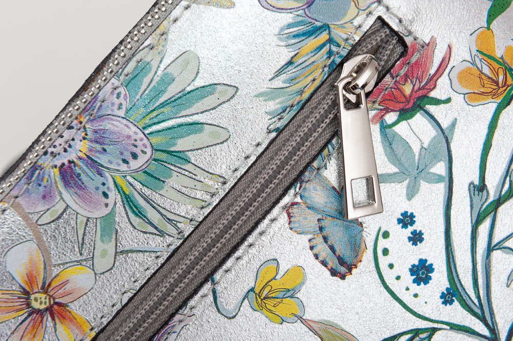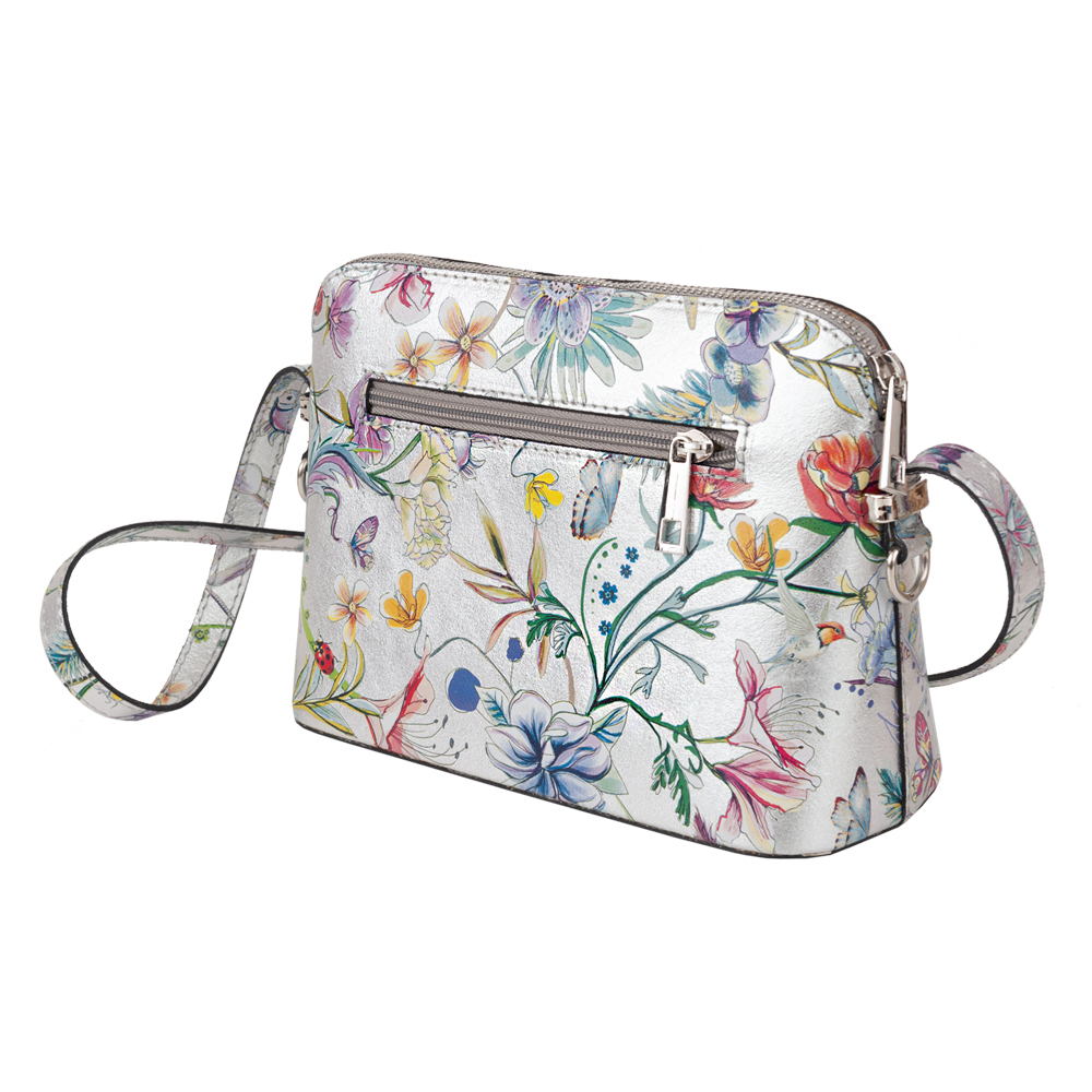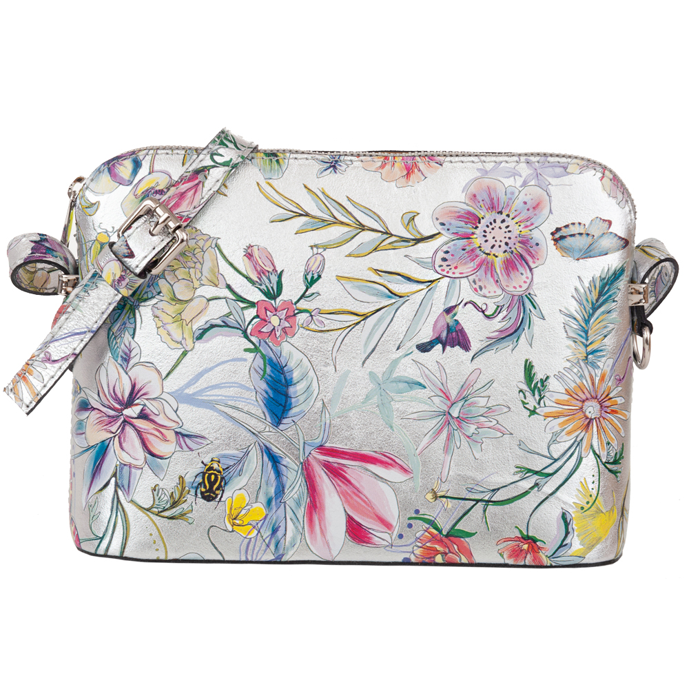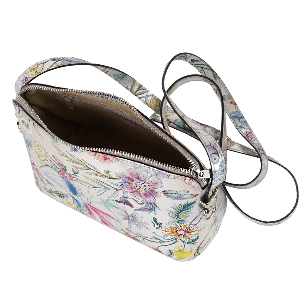 Vera Pelle - włoska modna, skórzana torebka listonoszka wykonana z wysokogatunkowej naturalnej skóry z motywem kolorowych kwiatów. Zamykana od góry na zamek na całej szerokości. Spód torebki usztywniony. Torebka jednokomorowa, wewnątrz jedna kieszonka na zamek + kieszonka na telefon. Wnętrze wykończone trwałą, materiałową podszewką. Z tyłu dodatkowa kieszeń na zamek. Regulowany pasek o długości do 142 cm umożliwia wygodne noszenie na ramieniu lub przez ramię. Metalowe elementy wykończenia w kolorze srebrnym.