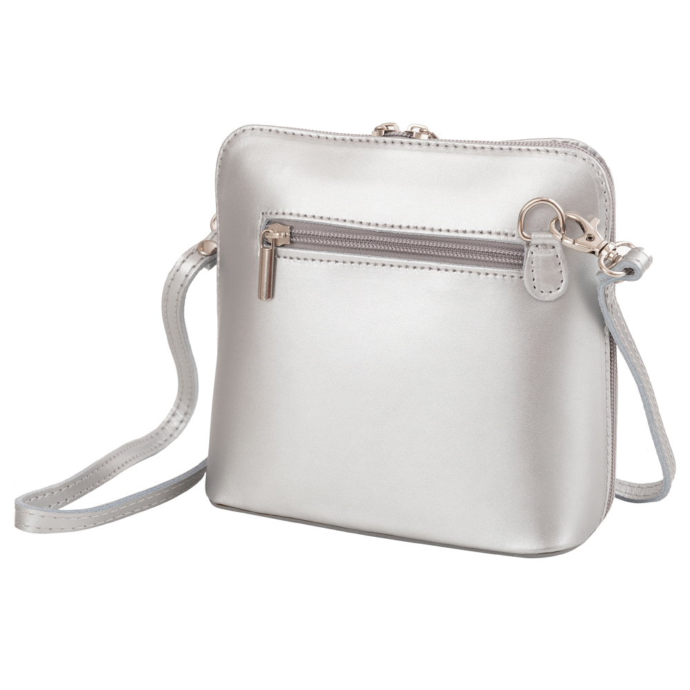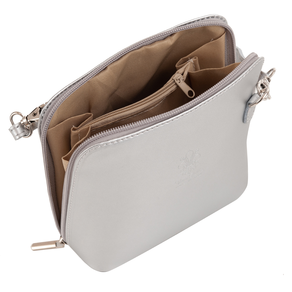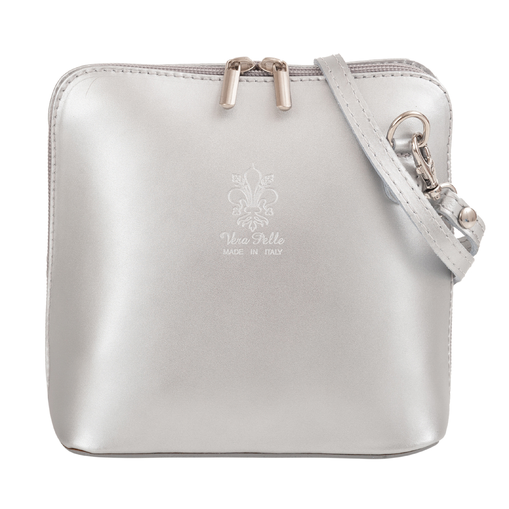 Vera Pelle - włoska mała, zgrabna skórzana listonoszka wykonana z wysokogatunkowej naturalnej gładkiej metalicznej skóry licowej. Główna komora zamykana na podwójny suwak. Spód torebki usztywniony. Torebka jednokomorowa, wewnątrz dwie kieszonki. Wnętrze wykończone trwałą podszewką. Z tyłu kieszonka na suwak. Długi pasek umożliwia wygodne noszenie na ramieniu.