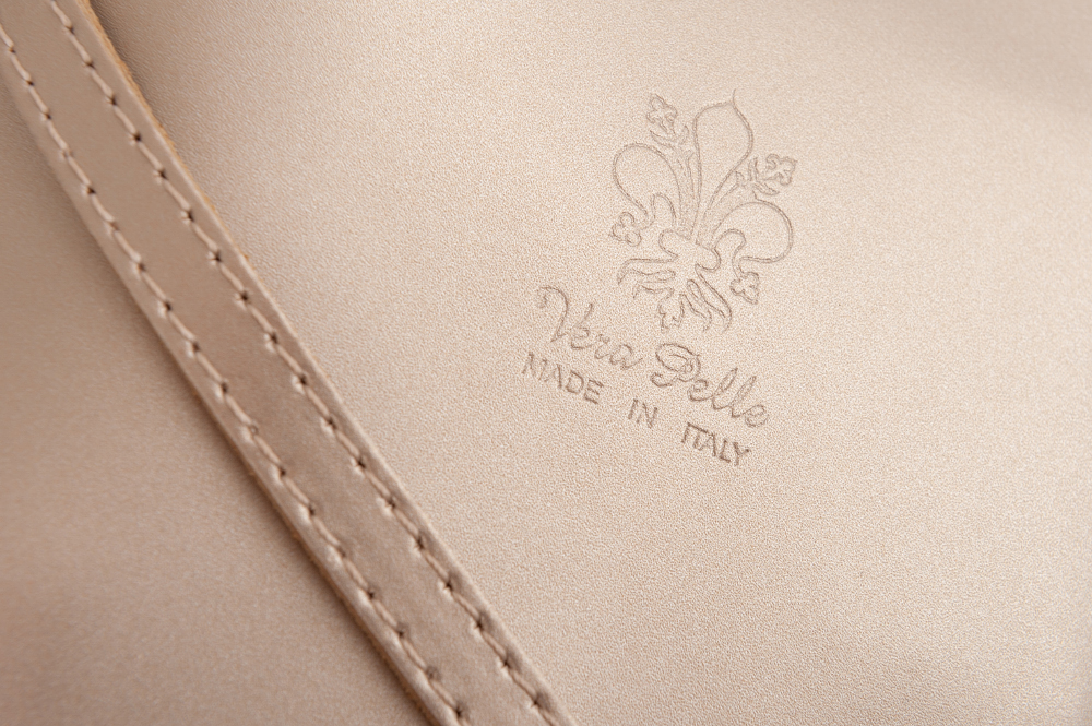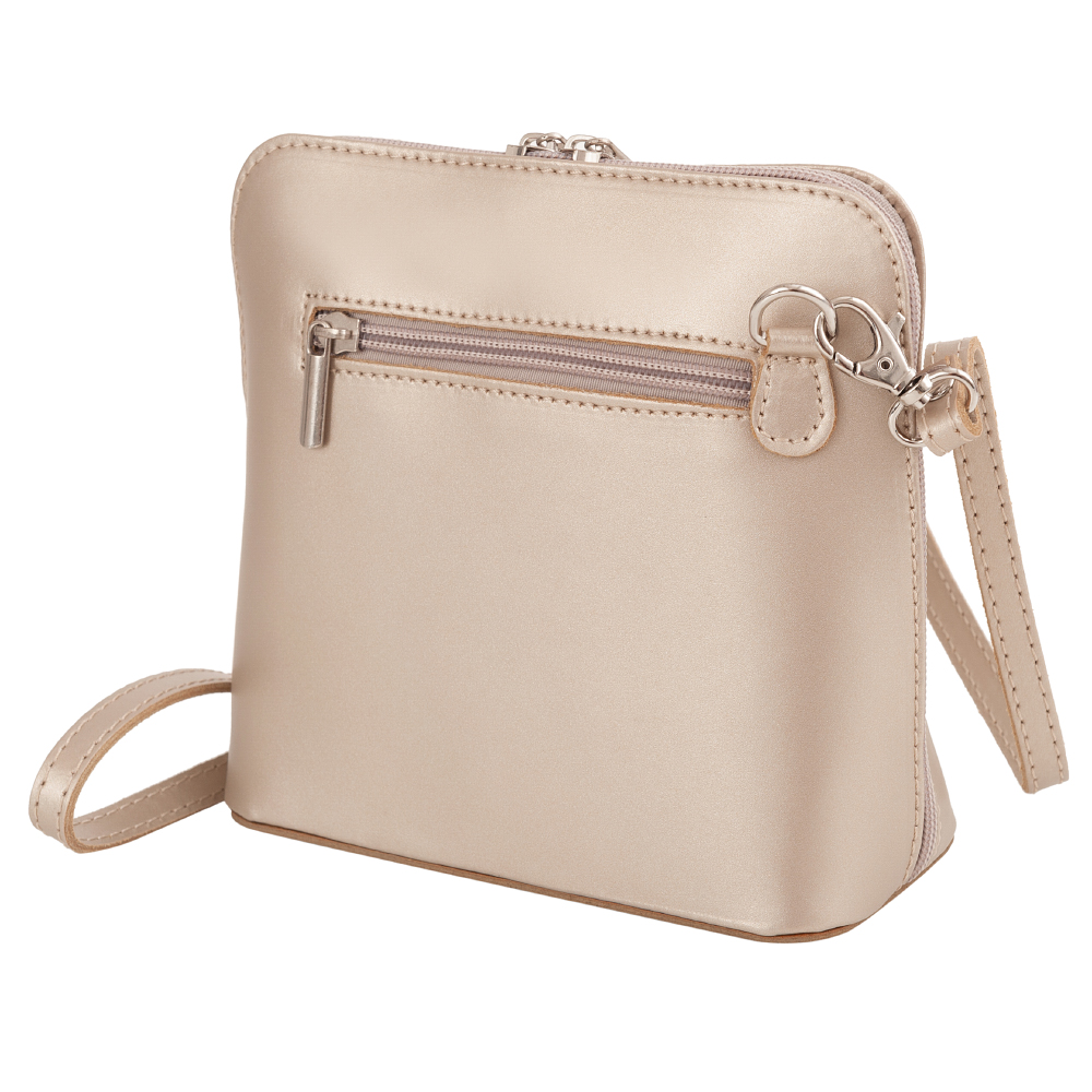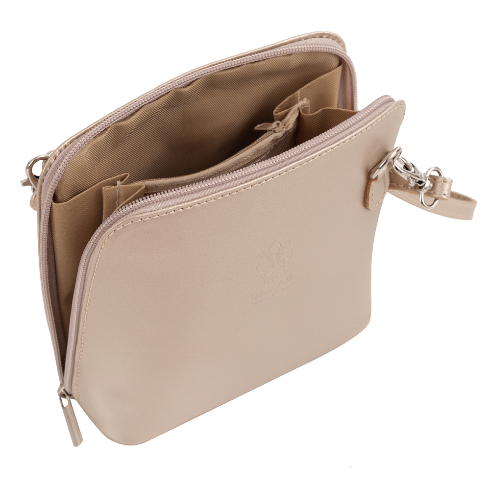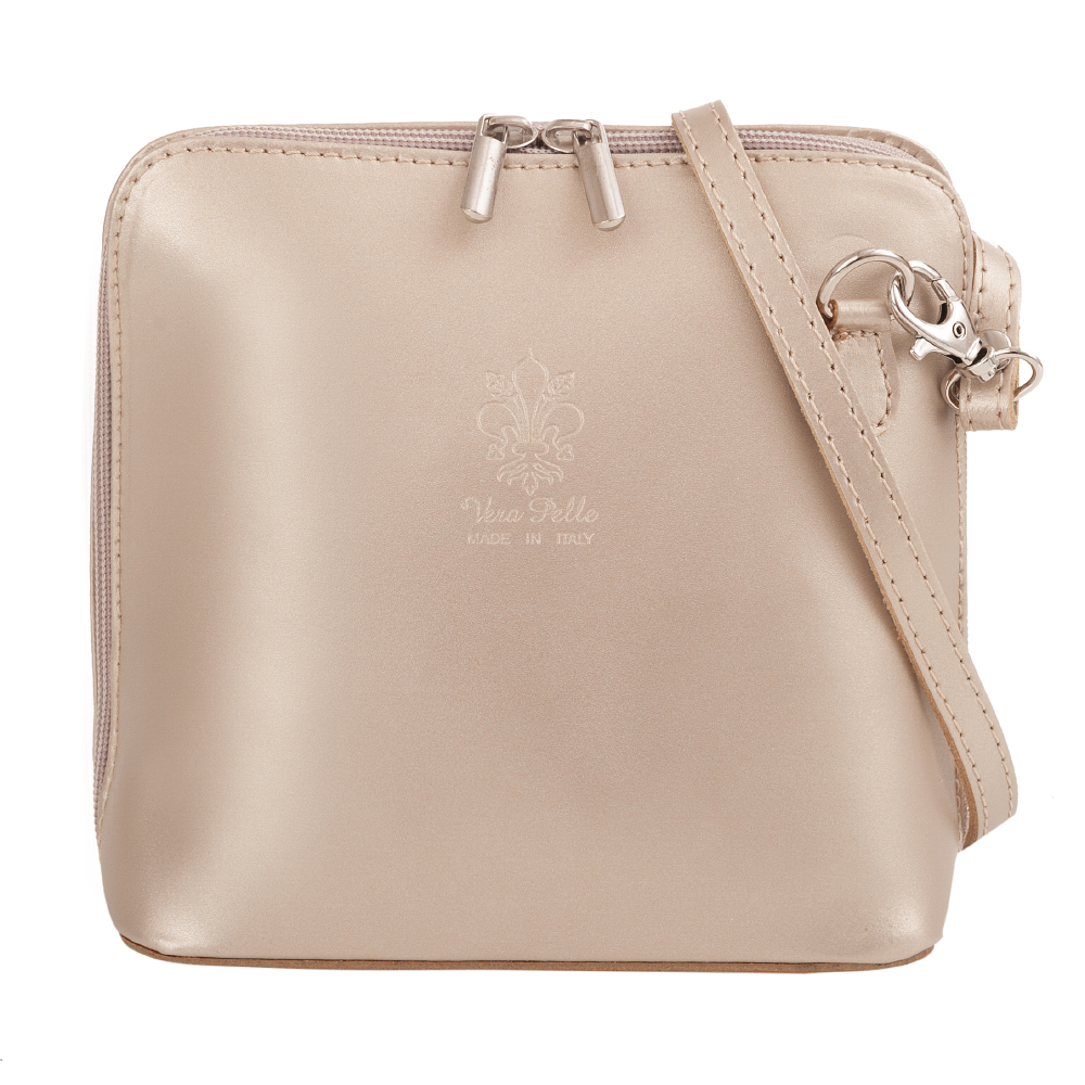 Vera Pelle - włoska mała, zgrabna skórzana listonoszka wykonana z wysokogatunkowej naturalnej gładkiej metalicznej skóry licowej. Główna komora zamykana na podwójny suwak. Spód torebki usztywniony. Torebka jednokomorowa, wewnątrz dwie kieszonki. Wnętrze wykończone trwałą podszewką. Z tyłu kieszonka na suwak. Długi pasek umożliwia wygodne noszenie na ramieniu.