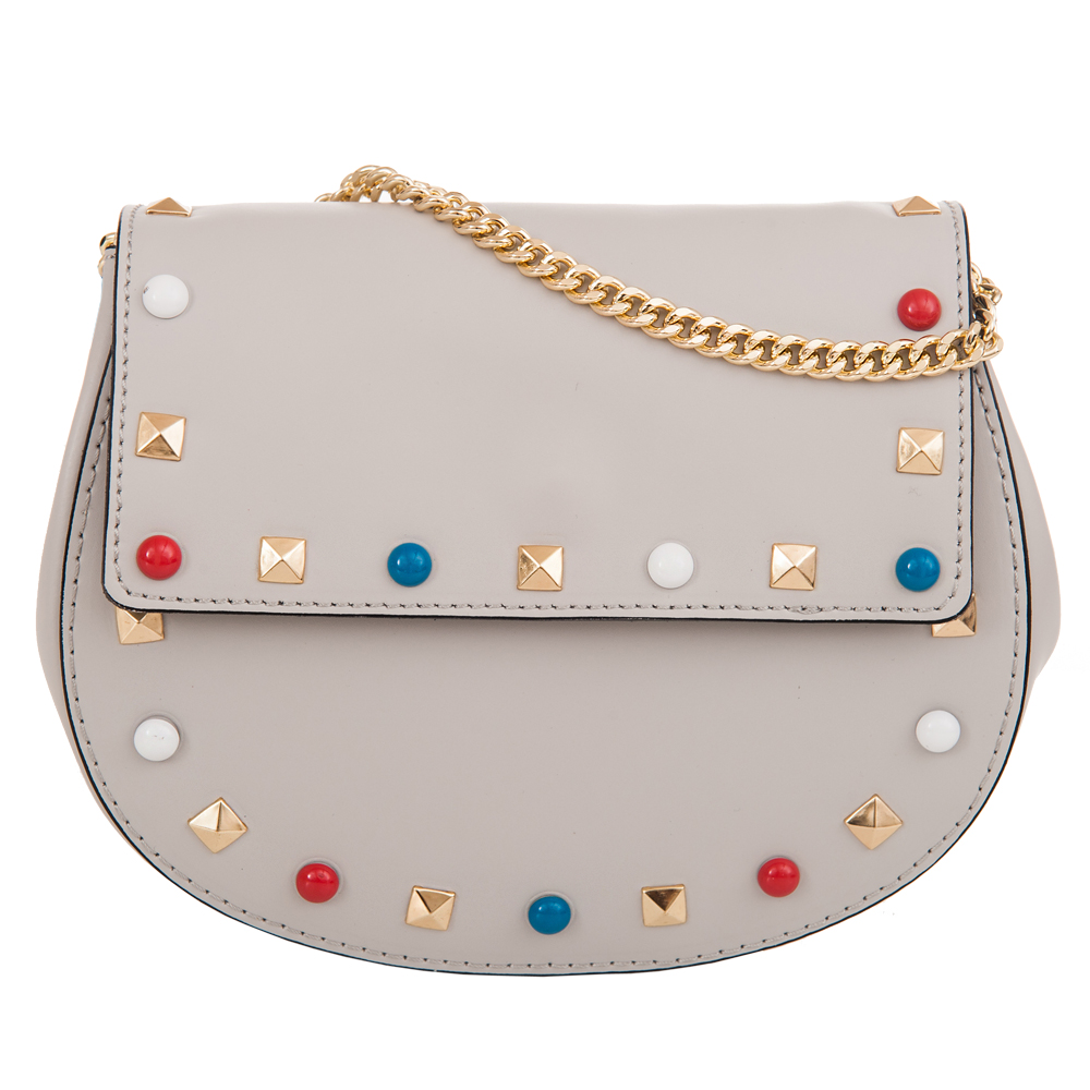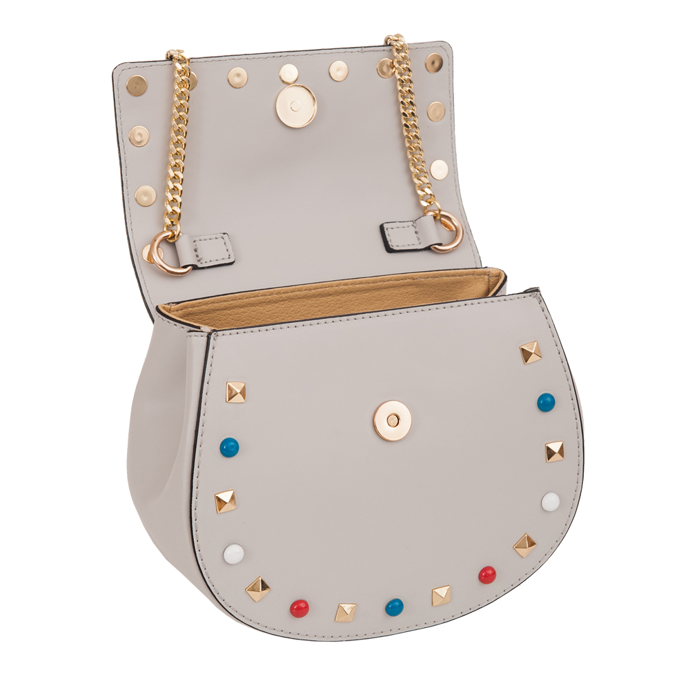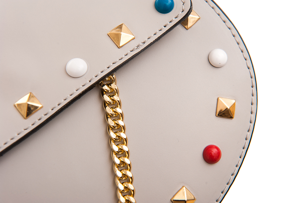 Vera Pelle - modna, włoska skórzana torebka listonoszka wykonana z wysokogatunkowej naturalnej, matowej gładkiej skóry. Zamykana na klapkę z magnesem. Torebka jednokomorowa (wewnątrz kieszonka). Modny złoty łańcuszek - pasek. Modne ćwieki i kolorowe zdobienia.