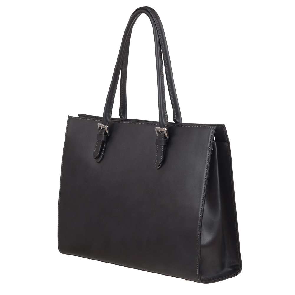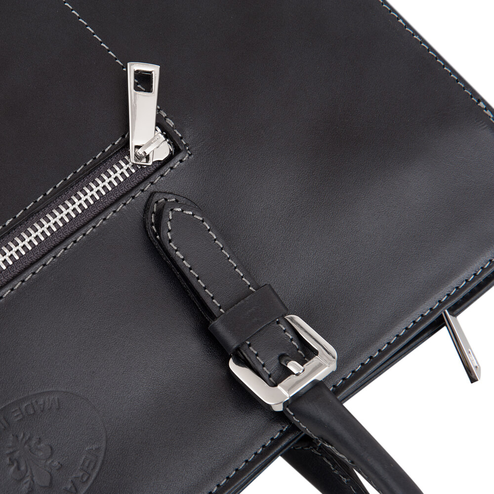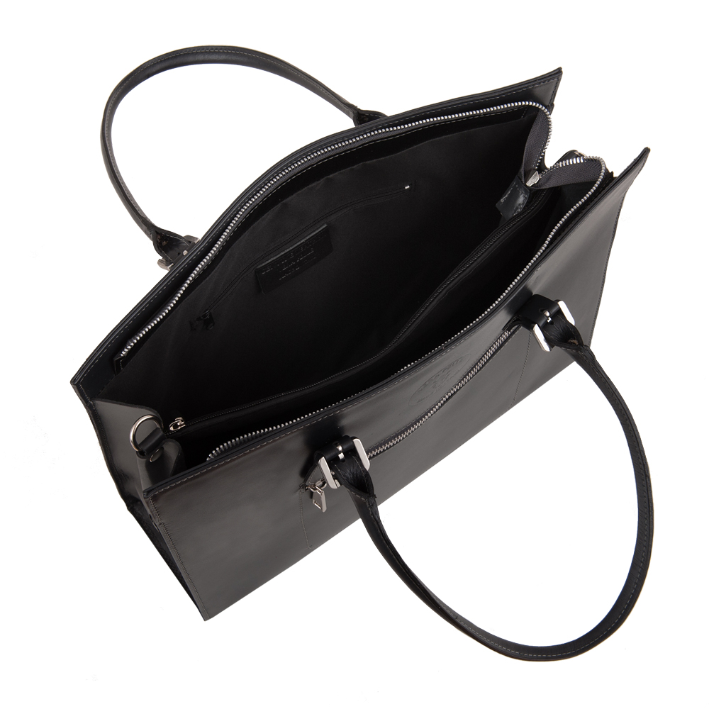 Włoska klasyczna skórzana A4 torebka wykonana z wysokogatunkowej naturalnej gładkiej skóry licowej. Zamykana od góry na zamek na całej szerokości. Torebka dwukomorowa przedzieloną dużą kieszenią na suwak. Wewnątrz dodatkowo jedna kieszonka na zamek, jedna na telefon + dodatkowa kieszonka. Wnętrze wykończone trwałą, ciemną materiałową podszewką. Dodatkowo z przodu torebki kieszonka na zamek. Torebka od spodu usztywniona oraz podbita nóżkami chroniącymi ją przed uszkodzeniami i zadrapaniami. Metalowe elementy wykończenia w kolorze srebrnym. W komplecie długi pasek na ramię o dł. 94 cm. Uszy w torebce można regulować na długość.