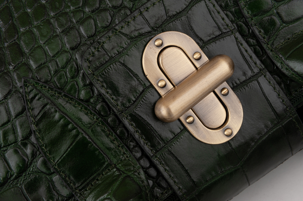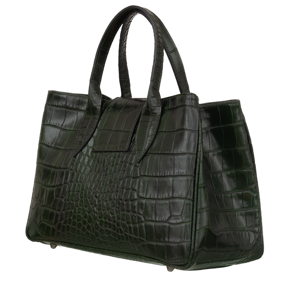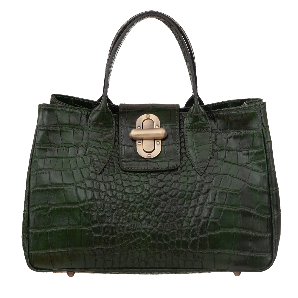 Vera Pelle - Włoska modna skórzana torebka kuferek wykonana z wysokogatunkowej naturalnej skóry z fakturą łuski krokodyla. Wygodny dostęp do środka. Torebka dwukomorowa zamykana na zamek + klapa na przekrętkę. Wewnątrz kieszonka na telefon + kieszonka na drobiazgi + kieszonka na zamek w drugiej przegródce. Torebka na środku przedzielona dużą kieszenią na zamek. Torebka od środka wykończona porządną, czarną materiałową podszewką. Elementy wykończenia w kolorze srebrnym dodają torebce elegancji. Dodatkowy pasek o długości 95 cm umożliwia noszenie torebki na ramieniu. Od spodu torebka podbita metalowymi nóżkami które chronią ją przed uszkodzeniami i zadrapaniem.
