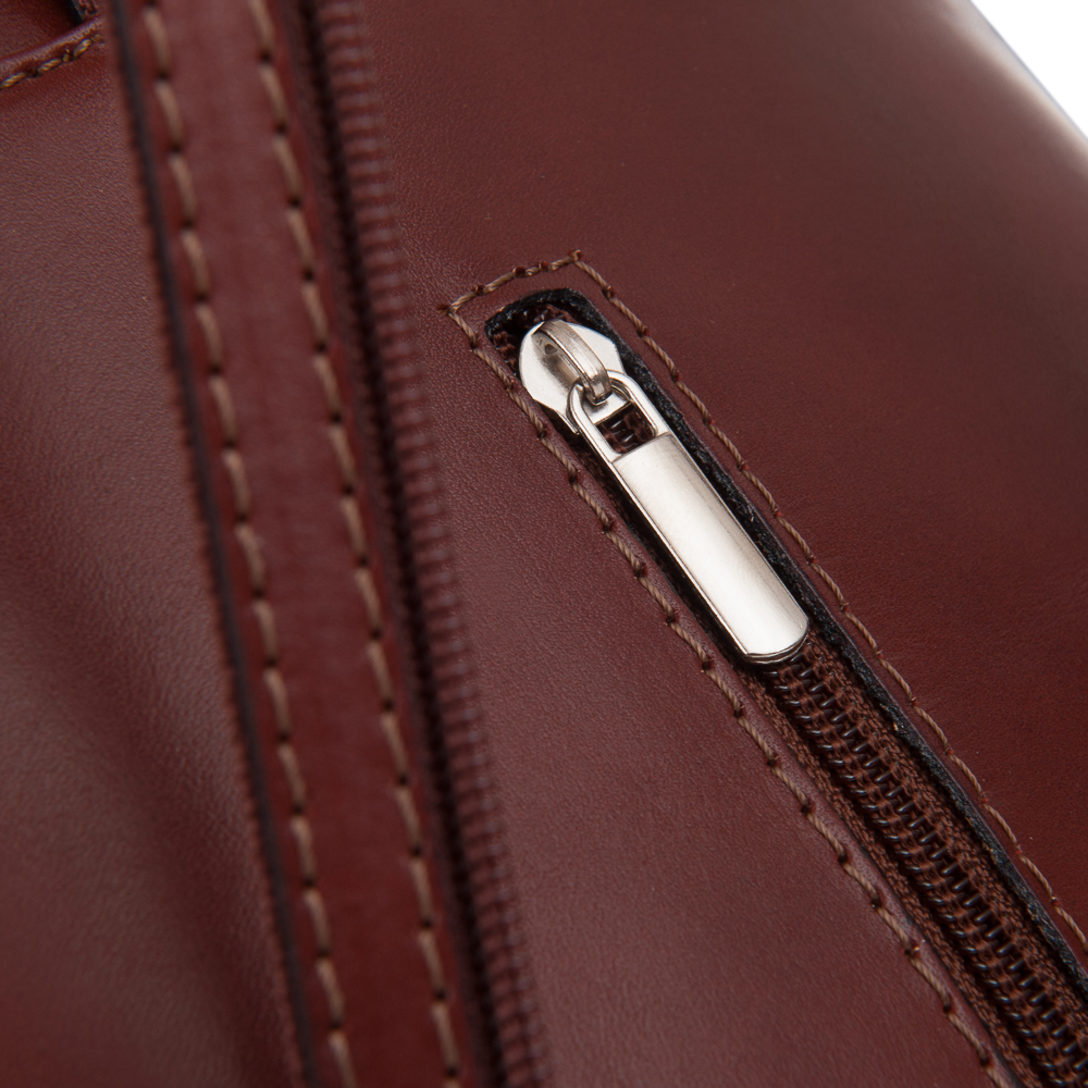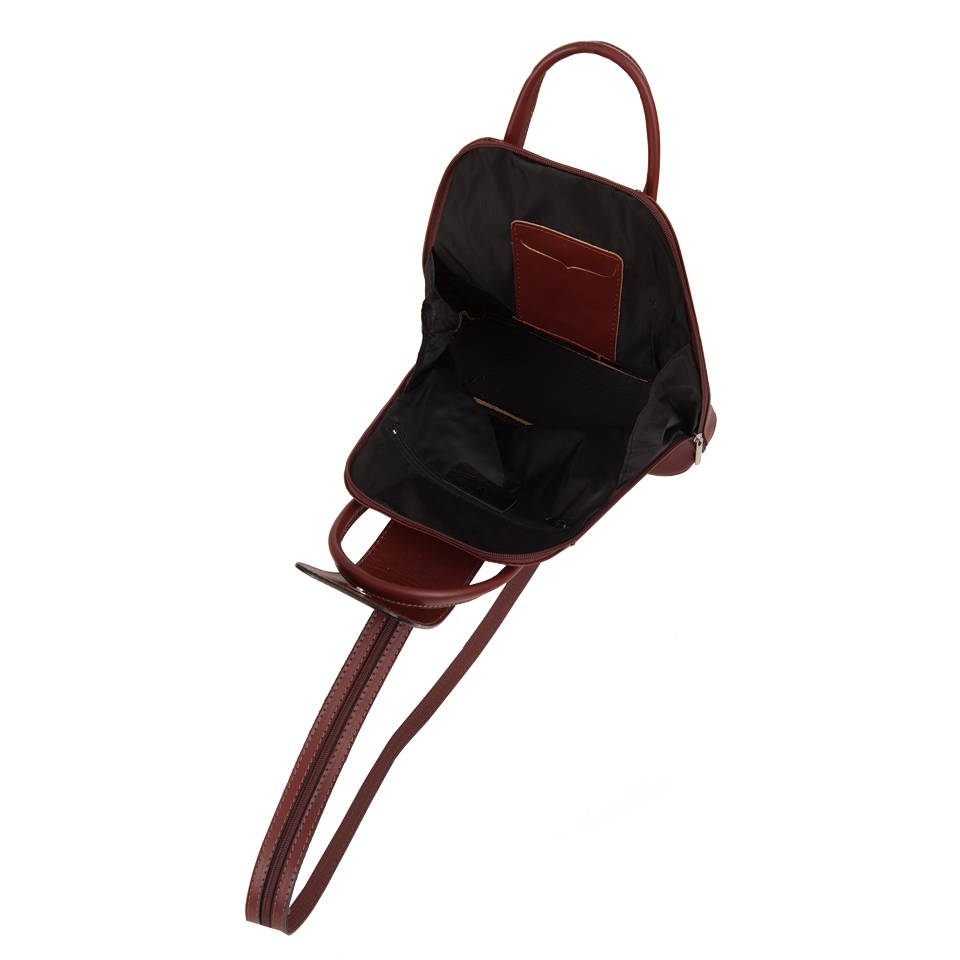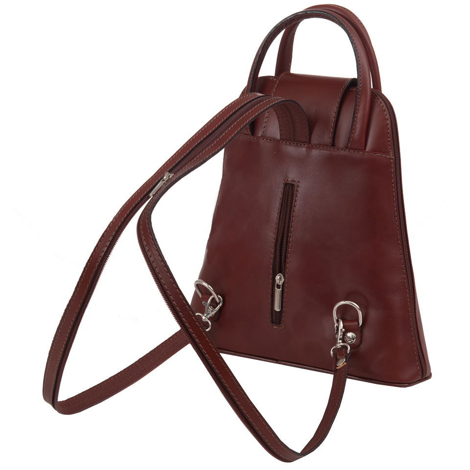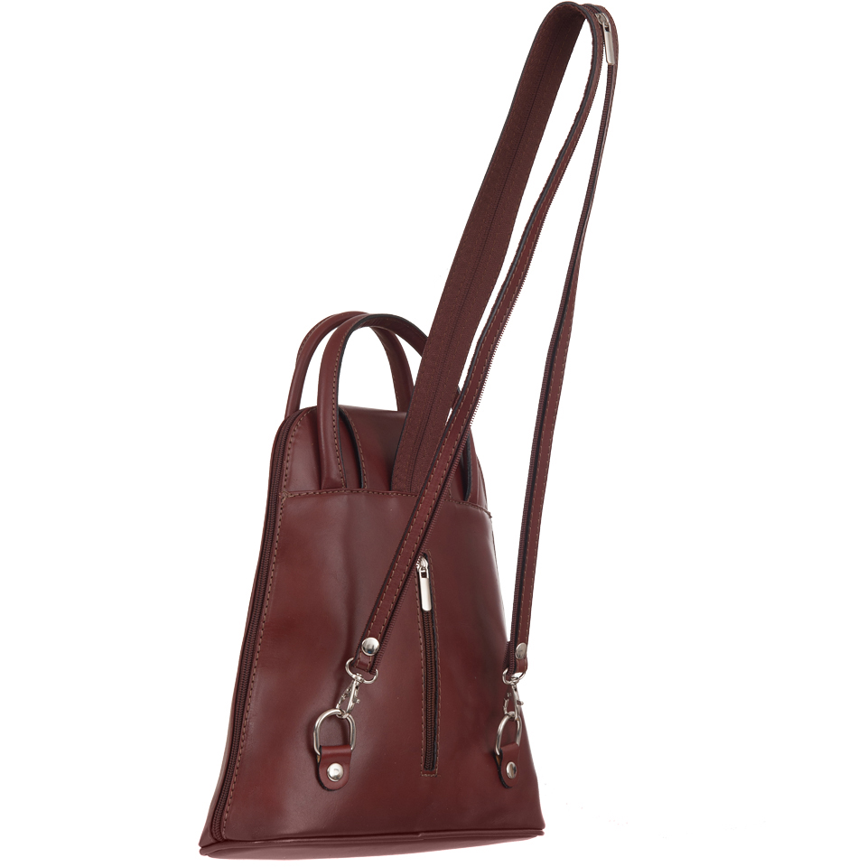 Włoski skórzany plecak wykonany w 100% ze skóry naturalnej licowej. Na klapie sygnowany stempel MADE IN ITALY - Vera Pelle. Zamykany na dwa suwaki + klapa na magnes. Plecak jednokomorowy. Wewnątrz jedna kieszonka na zamek oraz jedna na telefon. Z przodu kieszonka pod klapą + pionowa kieszonka na suwak z tyłu. Wnętrze wykończone trwałą podszewką. Możliwość spięcia długich pasków suwakiem tworząc jedno ucho na ramię.